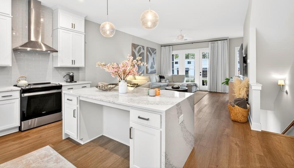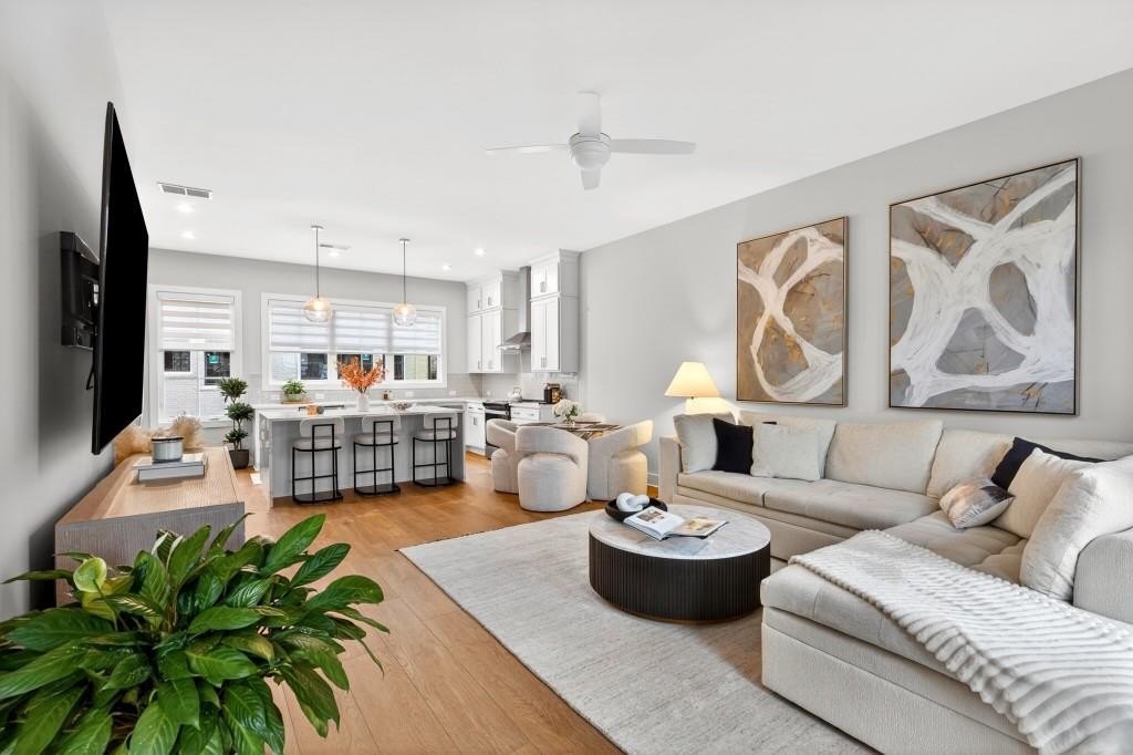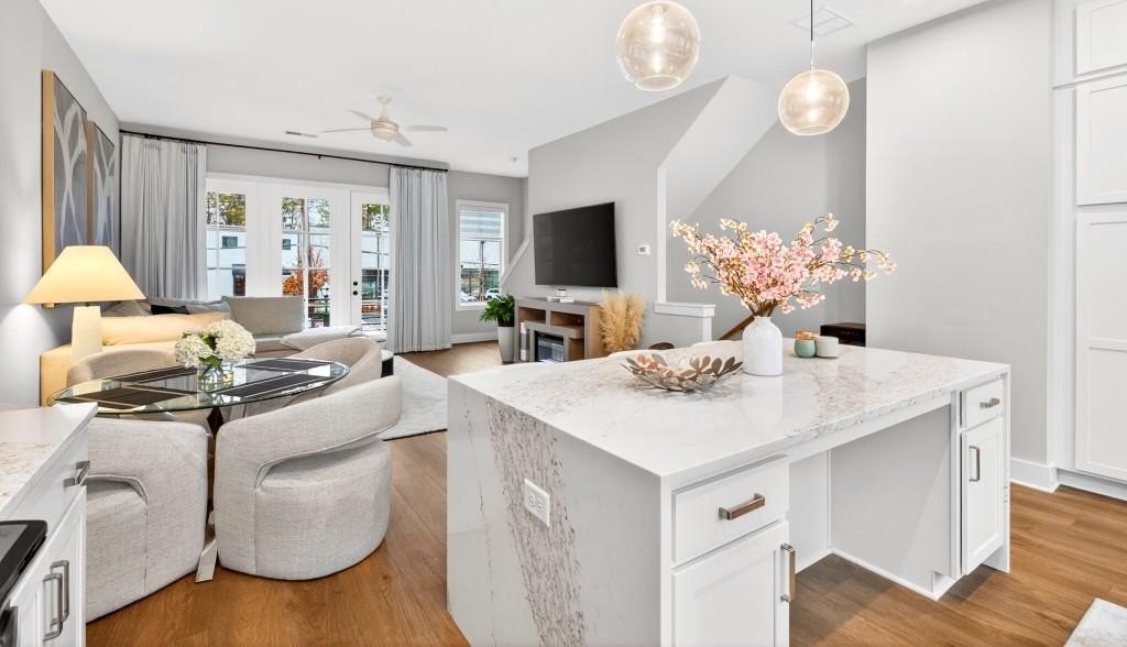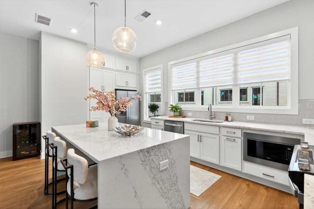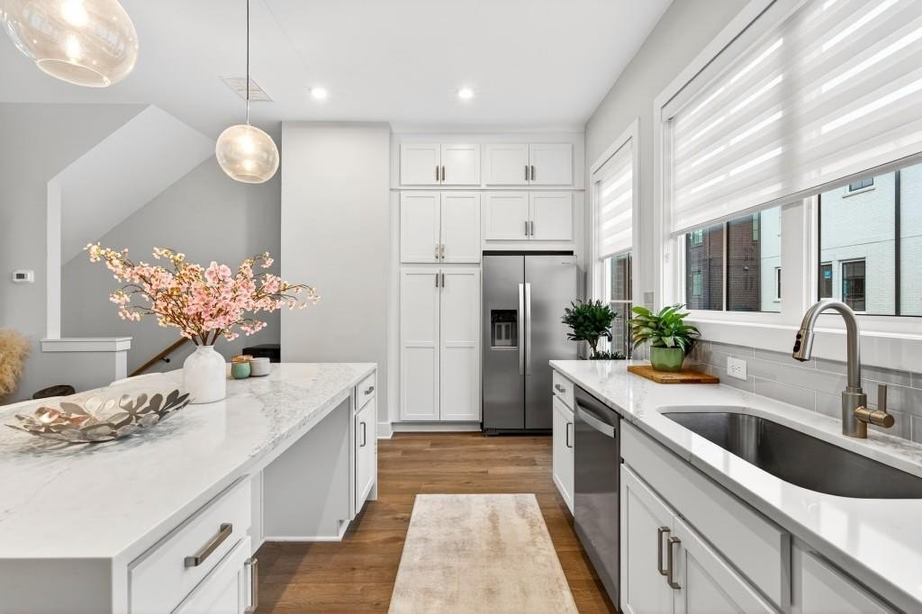 NEW CONSTRUCTION, only lived in 3 months due to job change. INVESTOR OPPORTUNITY, no rental restrictions! MOVE IN READY! INCLUDES UPGRADES-WATERWALL COUNTERTOPS, CEILING HEIGHT CABINETRY, CUSTOM DRAPERY, REFRIGERATOR, WASHER AND DRYER, BATHROOM MIRRORS, DESIGNER FANS IN ALL BEDROOMS. Beautifully appointed three-bedroom townhome located directly across the street from restaurants and just moments from the shops at Dresden. Featuring three bedrooms and three full baths, this home offers an expansive open-concept layout with a generously sized kitchen, large island, and excellent natural light. The lower level welcomes you with an inviting foyer and a private bedroom with an attached full bath-ideal for guests or a home office. The main level is perfect for entertaining with its spacious living and dining areas and a covered porch for outdoor enjoyment. The top floor provides exceptional privacy with a serene primary suite and an ensuite bath. A secondary bedroom with its own full bath offers ample space for guests. Additional highlights include a two-car garage and numerous upgrades: refrigerator, washer and dryer, custom drapes, waterfall countertops, ceiling-height cabinetry, upgraded bathroom mirrors, designer fans in all bedrooms, and hardwood floors throughout.
