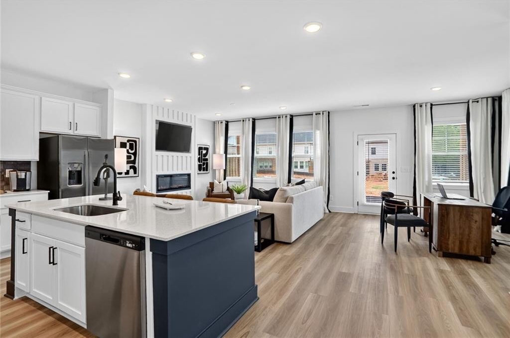4.99% BUYDOWN. Offering $20,000 for a rate buydown or closing costs (with the use of seller's preferred lender) on this beautiful 4 sides brick 2 story, 25' wide townhome. End Unit! Belle Elevation D. PHOTOS ARE OF MODEL HOME WHICH IS THE SAME FLOORPLAN WITH SIMILAR OPTIONS. Investors welcome. Welcome to Governor's Park, Kennesaw's newest town home community. 2022 square feet of living space conveniently located near downtown Kennesaw. Majestic 4 sides brick, 9' ceilings on both 1st and 2nd floor. Kitchen will feature quartz countertops with tile backsplash. 42" upper cabinets w under cabinet lighting. Stainless steel appliances include an electric range, microwave, dishwasher and garbage disposal. Walk in pantry and island complete the kitchen. Open living space gives you complete flexibility for family room and dining area. Electric fireplace in family room with built in and flat screen TV. Home backs to a common courtyard. Great area for relaxing or enjoying a game of cornhole. Upstairs you'll find a large primary bedroom(16x16) w trey ceiling and ceiling fan. Dual vanity in the primary bath with separate water closet, linen closet and large shower. Two secondary bedrooms share a bath. Laundry room is on the second floor and includes a closet for storage or linens. Feeds into Allatoona High School, Mc Clure Middle School and Lewis Elementary. Don't miss out on this great opportunity. Home is complete and ready for it's new homeowners. Great value. Great schools. Allatoona High School, McClure Middle School, and Lewis Elementary.