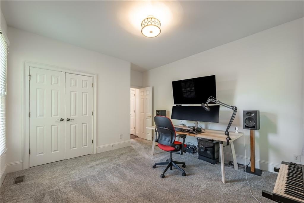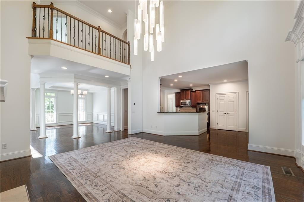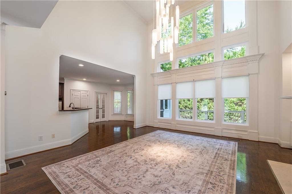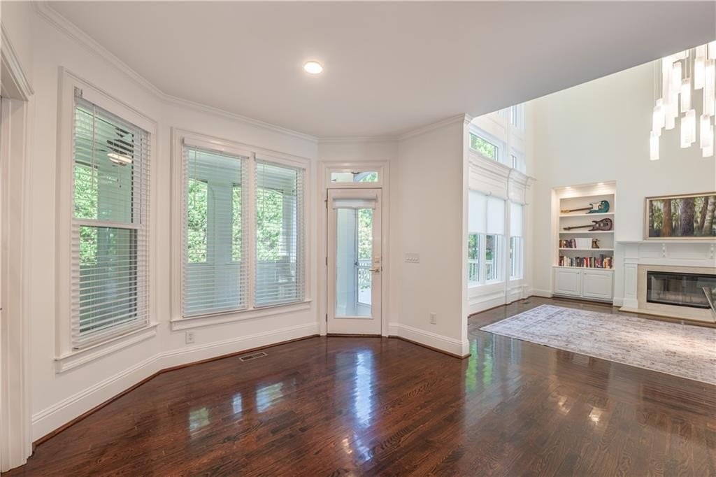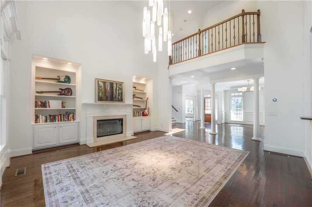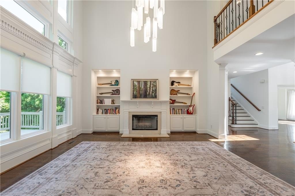 Step into a breathtaking two-story living room, where a dazzling chandelier illuminates soaring cathedral ceilings, custom built-in bookcases, a gas fireplace, and floor-to-ceiling windows that bathe the space in natural light. The gourmet chef’s kitchen, a culinary haven, features gleaming granite counters, stainless steel appliances—including double ovens— a breakfast bar, and an inviting breakfast room. A refined office with a fireplace and French doors, a versatile computer room with a built-in desk, a spacious bedroom, and a generously sized laundry room (complete with washer and dryer) complete this level’s seamless fusion of function and style.