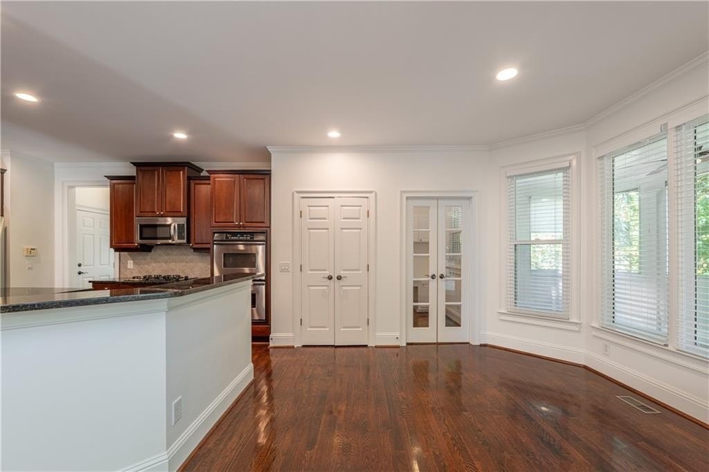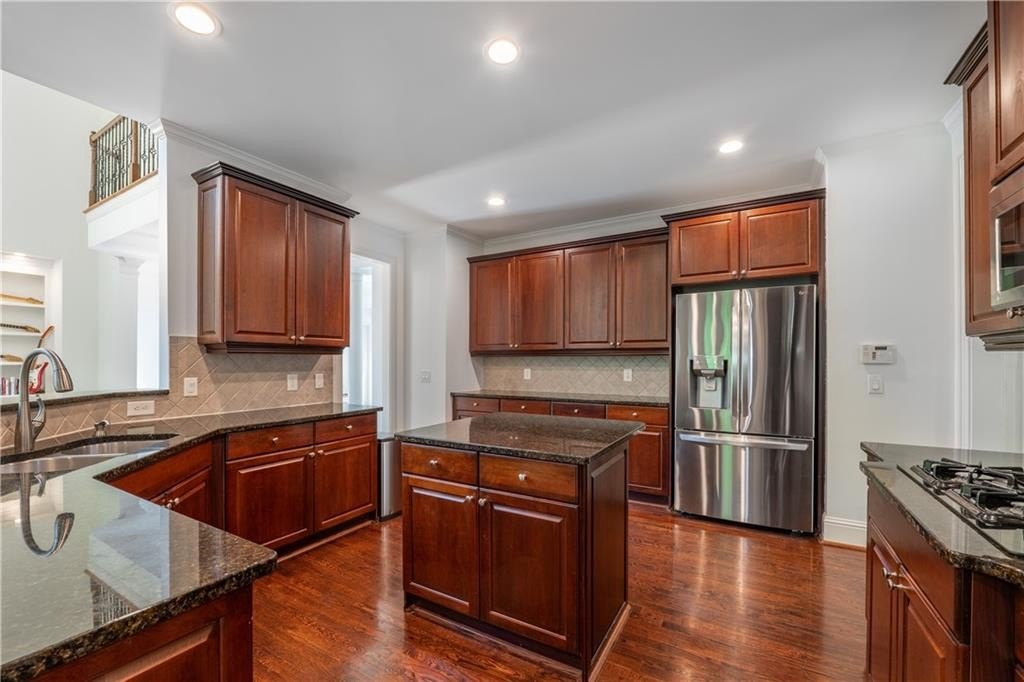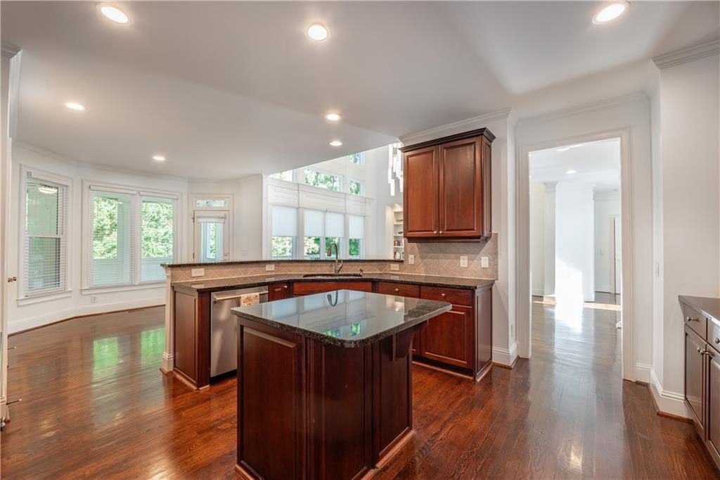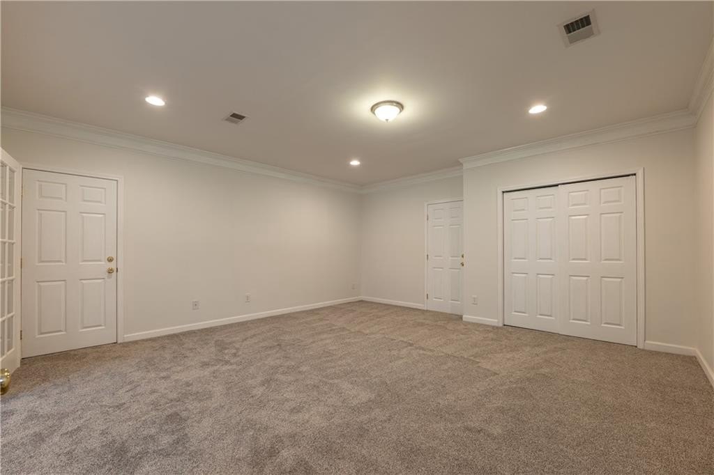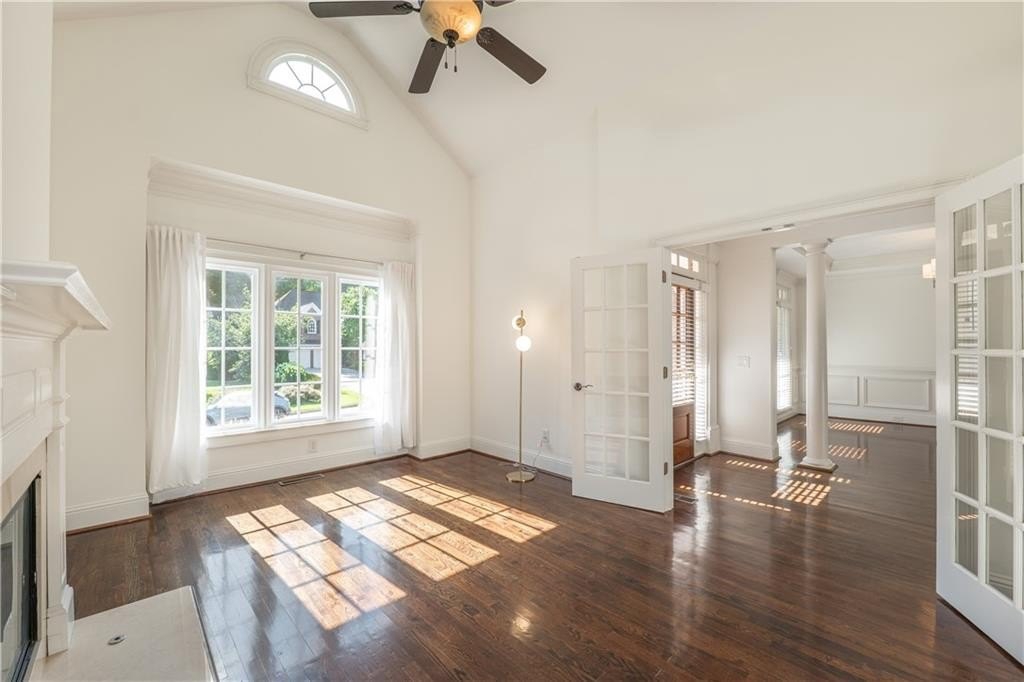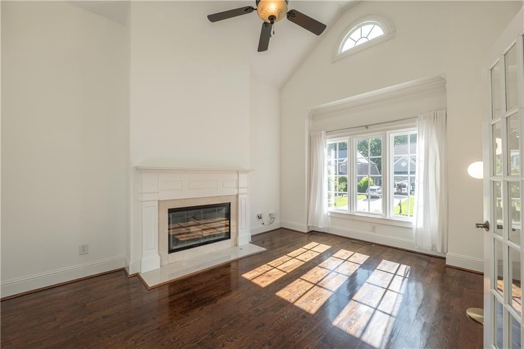 Step into a breathtaking two-story living room, where a dazzling chandelier illuminates soaring cathedral ceilings, custom built-in bookcases, a gas fireplace, and floor-to-ceiling windows that bathe the space in natural light. The gourmet chef’s kitchen, a culinary haven, features gleaming granite counters, stainless steel appliances—including double ovens— a breakfast bar, and an inviting breakfast room. A refined office with a fireplace and French doors, a versatile computer room with a built-in desk, a spacious bedroom, and a generously sized laundry room (complete with washer and dryer) complete this level’s seamless fusion of function and style.