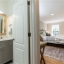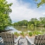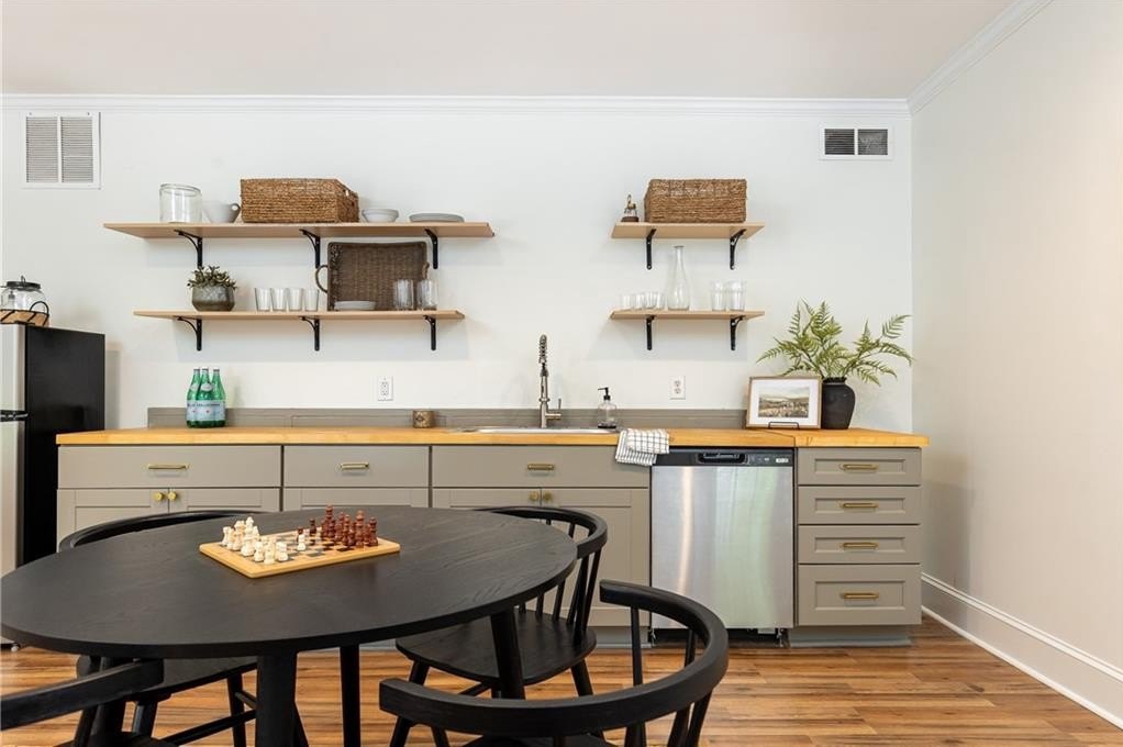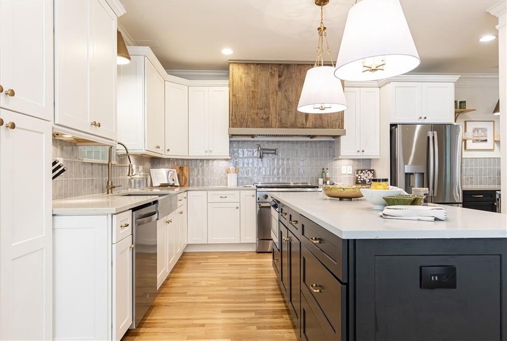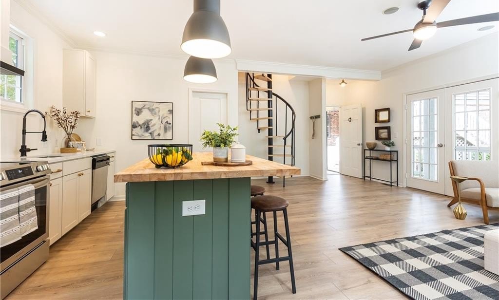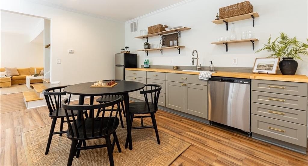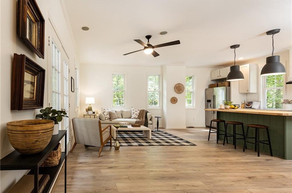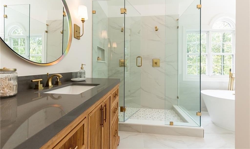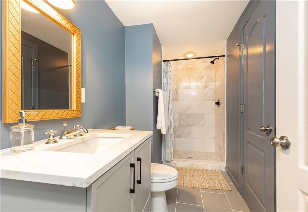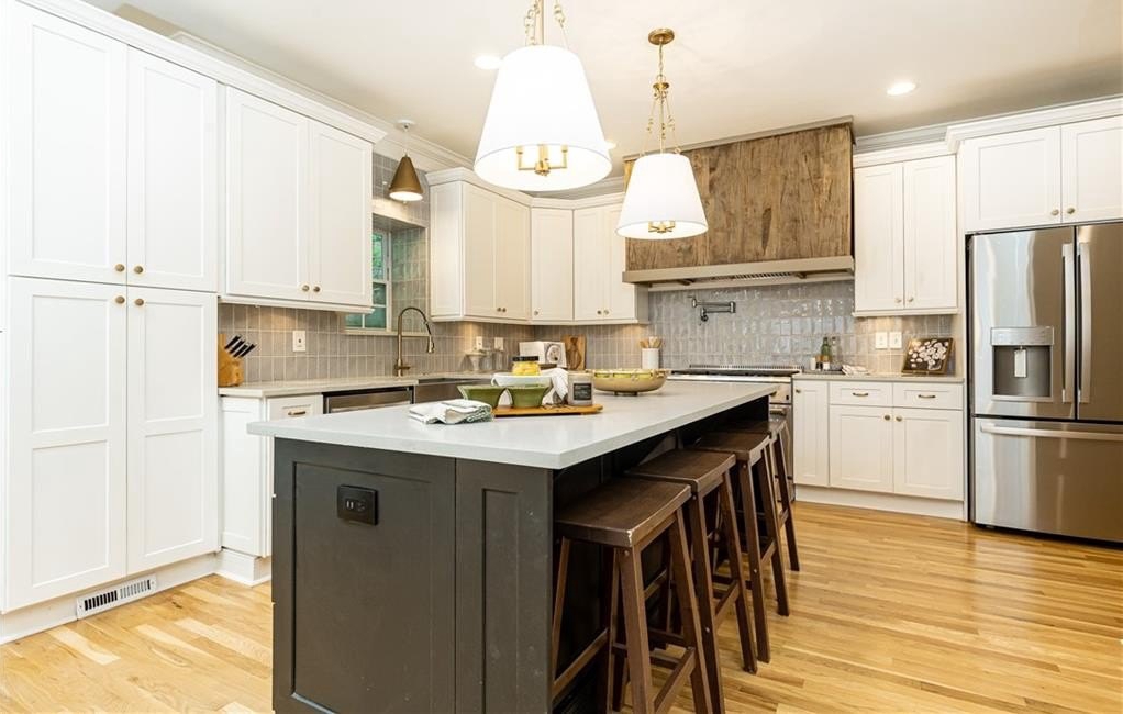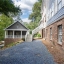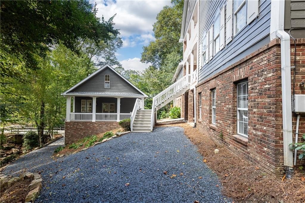 Surrounded by mature trees, a babbling creek and lush landscaping, this peaceful creekside retreat has the perfect blend of designer updates within a tranquil setting. Oversized stained-wood French doors and gas lantern welcome you into the main level of the home. The large open-concept living area can be used as 1 large living room with ample seating, or serve as a dining/living combo....excellent for entertaining! A bar area complete with wine refrigerator is conveniently located between the living area and kitchen. White cabinetry, quartz countertops, stainless steel appliances, and handcrafted tile backsplash make the kitchen aesthetic timeless. There is a kitchen island with seating, pantry, separate coffee bar, and plenty of room for a breakfast table or additional living area. French doors lead to a vaulted-ceiling covered porch ]making it an extension of the main floor. Additional bedroom and bathroom on main that can be used as a main guest room, office, or playroom. Upstairs you will find the HUGE Primary suite , complete with vaulted ceilings, floor to ceiling windows and French doors leading to a private porch. Marble-look tile lines the floors and walls of the light-filled primary bathroom. It features dual sinks, pedestal tub, separate shower with 2 showerheads and a large walk-in closet. 2 additional bedrooms with ensuite bathrooms are located upstairs with an upper level laundry room (1 of 3 on the property!) The daylight terrace level has entertainment space, along with a wet bar , bedroom, bathroom and its own laundry area. Located above the 2 car garage, a separate guest house provides additional space for visitors, home office, au-pair suite, or could be an excellent opportunity for a supplementary rental investment. (rented by previous owners for $1700+/month). This 2-story apartment is also fully renovated with new wood-look flooring, updated kitchen , living area, 2 bathrooms, dedicated laundry, and bedroom with walk-in closet.