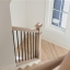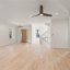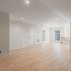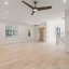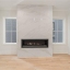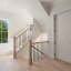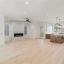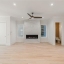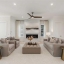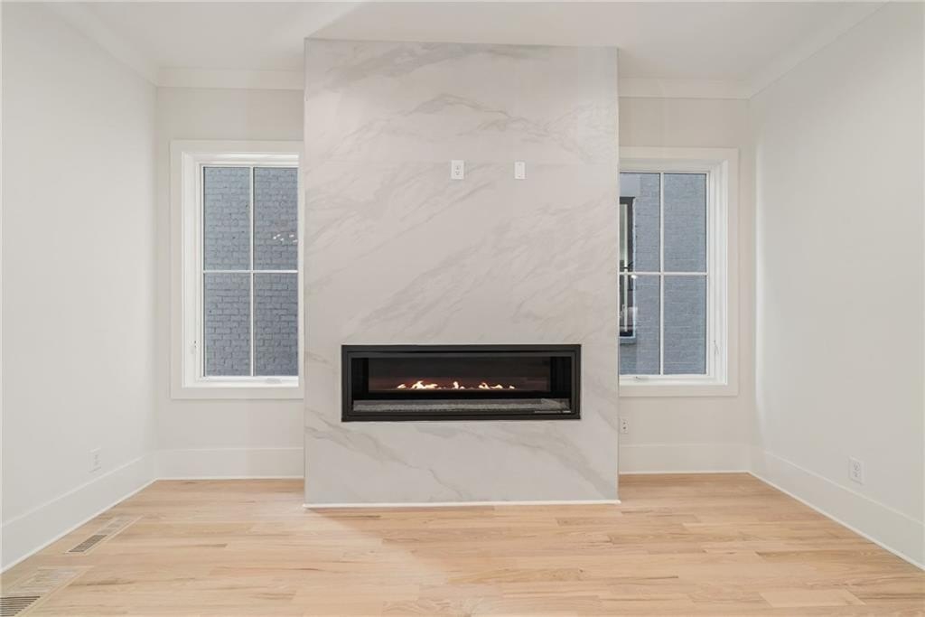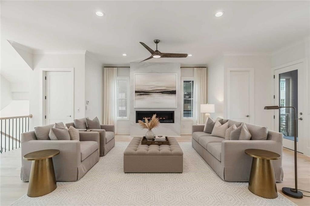 The open-concept main level is filled with natural light and anchored by an elegant linear fireplace visible from the kitchen and dining areas. A stunning switchback staircase leads to the upper levels, creating both a design feature and functional flow.