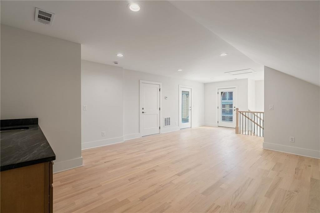 The top level is designed for entertaining and relaxation, with a large bonus room and custom wet bar opening to a spectacular covered rooftop terrace — ideal for lounge seating or even a hot tub, all overlooking the Loop. A guest bedroom with full bath and walk-in closet completes this level.