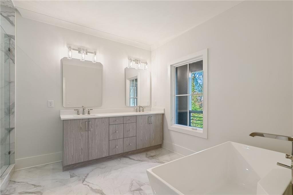 Upstairs, the primary suite is a serene retreat with a spa-inspired bath featuring dual vanities, a freestanding soaking tub, large walk-in shower, and spacious walk-in closet. Step out onto the covered rear terrace with peaceful views of the Alpha Loop — the perfect place to start or end your day. A generous secondary bedroom on this floor includes its own ensuite bath and walk-in closet.