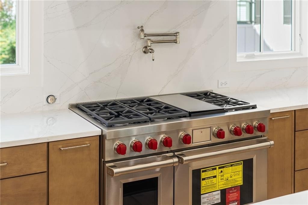 Inside, the heart of the home is the gourmet kitchen — a 3-sided design that surrounds a large center island with seating and abundant cabinetry. Culinary enthusiasts will love the 48" Wolf range, built-in Sub-Zero refrigerator, Cove dishwasher, and under-counter beverage center, all set against quartz countertops and a designer tile backsplash.
