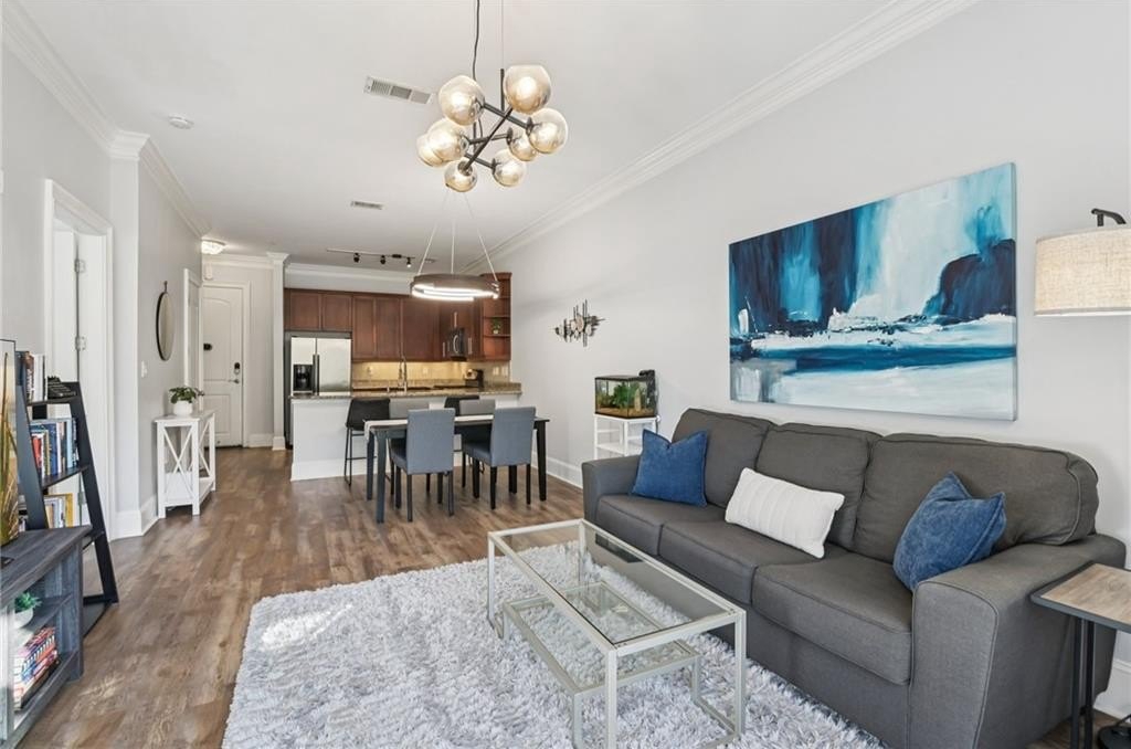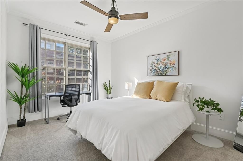 Beautiful Open Concept Home Right By Piedmont Park! Experience the best of city living in this stunning home backing to Piedmont Park. The bright, open floor plan is filled with natural light and features high ceilings, updated finishes, and elegant crown molding. The spacious living room features wood floors and opens to a private balcony framed by a gorgeous mature tree—your own tranquil escape in the city. The open-concept dining area, highlighted by a modern light fixture, flows seamlessly into the kitchen complete with a breakfast bar, granite countertops, tile backsplash, stainless steel appliances, and plenty of cabinet space. Relax in the serene bedroom with an en-suite bath featuring a granite vanity and tiled tub/shower combo. Additional conveniences include in-unit laundry with washer and dryer included, and the security of gated garage parking. Enjoy access to building amenities such as clubhouse spaces and a fitness center! With a Walkability Score of 92, you’re steps from Midtown’s best restaurants, theaters, the Botanical Garden, and more. Piedmont Park is literally in your backyard, and the Midtown train station is just a short stroll away! Don't miss your opportunity to see this home - book your tour today!