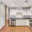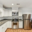 The kitchen includes corian counters, large counter space, white cabinetry, and stainless steel appliances.