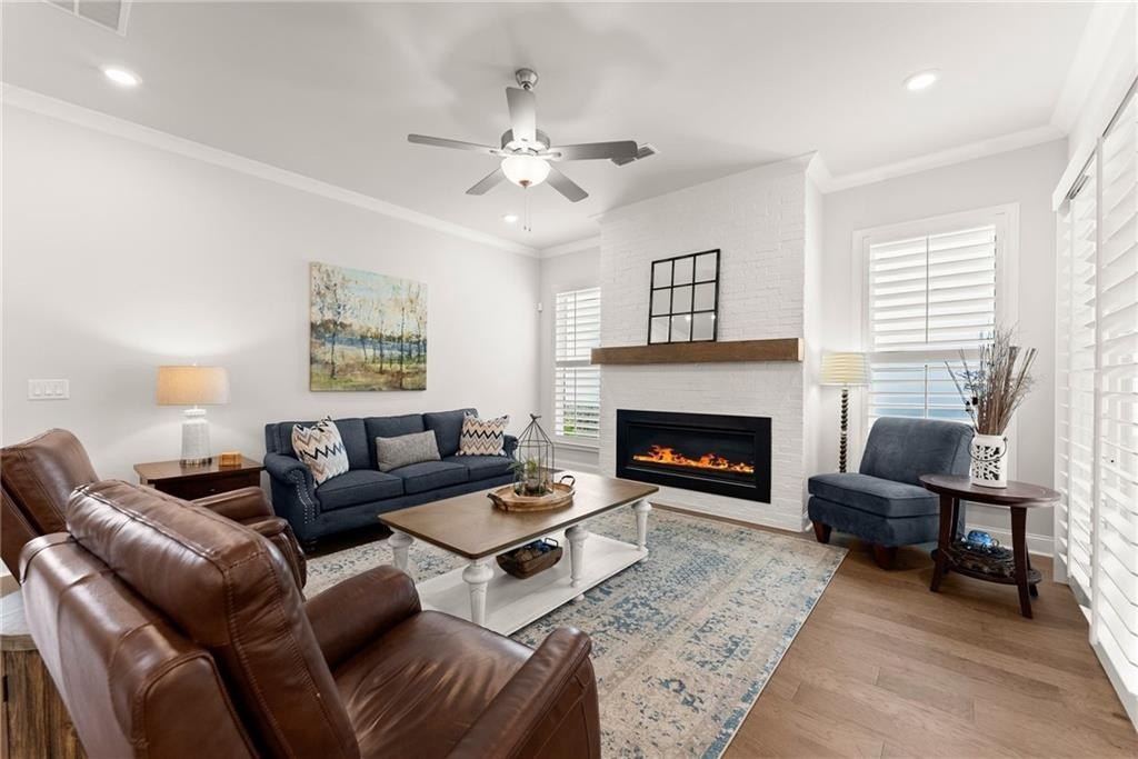 Why wait months to build? This one-year-old home has been minimally occupied, upgraded with whole-house shutters, and is priced to impress. Situated on a desirable corner lot, this beautifully designed single-family home blends comfort, style, and everyday convenience. The beautiful covered front porch sets the tone-an inviting space to unwind and enjoy peaceful mornings or evening breezes. Inside, you'll find a thoughtfully crafted main level that offers both functionality and elegance. The primary suite is conveniently located on the first floor and serves as a private retreat, complete with dual vanities, a zero-entry walk-in shower with a drying area, and a generous walk-in closet. The heart of the home is the open floor plan dining area and gourmet kitchen, perfectly suited for both daily living and entertaining. The kitchen impresses with its oversized island, painted cabinetry, stainless steel appliances, gas cooktop, and built-in microwave/oven combination. Rich hardwood flooring flows throughout the main level, stairs, and hallway, creating a warm and cohesive feel. A dedicated den or library provides an ideal space for working from home or enjoying a quiet escape, while the family room features a cozy gas fireplace-perfect for relaxing with friends and The home is enhanced by stunning plantation shutters throughout, adding both charm and distinction to this truly move-in-ready property. Step out to the covered patio to enjoy outdoor meals or simply relax in the fresh air. Upstairs, you'll find two generously sized bedrooms, a full bathroom, and an open loft that adds flexible living space for guests, hobbies, or play. This 55+community enhances your lifestyle with exceptional amenities, including a swimming pool, clubhouse with catering kitchen and fitness room, fire pits, three pickleball courts, a dog park, and several charming pocket parks. With lawn care included through the HOA, you'll have more time to enjoy everything this vibrant neighborhood has to offer.