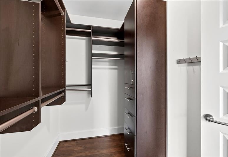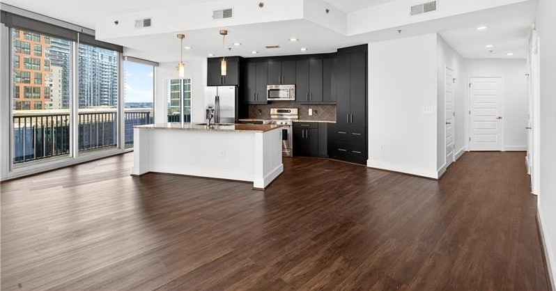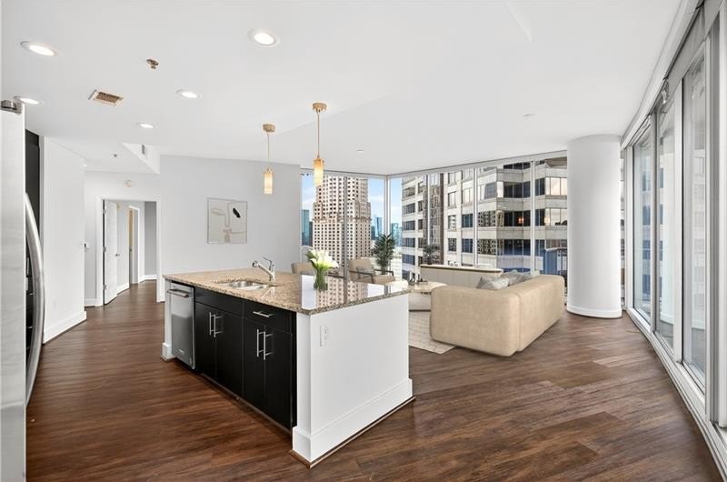 Amazing opportunity- one of the largest floor plans at 1010 and the only floor plan with dedicated laundry room, half bath, & true entry-hall. Call Midtown's most coveted address home at 1010 Midtown! This rare corner residence is one of the largest two-bedroom, two-and-a-half-bath floor plans in the building, offering the perfect balance of space and vibrant Intown living. Step inside to a welcoming foyer with a long hallway that opens into a light-filled living area framed by dramatic floor-to-ceiling corner windows with motorized shades and sweeping northwest views of Midtown. Just off the entry, you'll find a convenient powder room, a full laundry room, and a walk-in storage closet-true luxuries in condo living. The oversized kitchen is designed for both style and function, featuring premium appliances, a large island with seating for four, and direct access to the balcony-perfect for entertaining or enjoying sunset views. Both spacious bedrooms include walk-in closets and spa-like en suite baths with walk-in showers; the primary suite also offers a soaking tub and double vanity. Every room is enhanced with motorized shades, giving you effortless control over light and privacy. 1010 Midtown is an amenity-rich building, featuring 24/7 concierge service, fitness center, club room, gated parking, heated pool with skyline views, and a newly renovated 8th-floor park. Live life on the curve at 1010 Midtown!