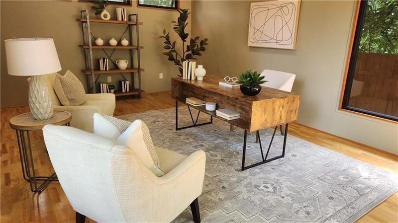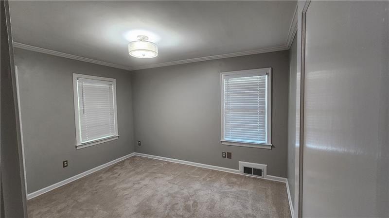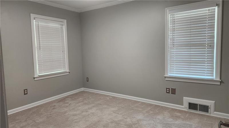 Step into a sun-drenched living room charmingly adorned with large windows and classy hardwood flooring. A versatile flex space in the back adds to the allure of this property, offering potential for a home office, gym, or additional living space. The ground-floor primary bedroom with its plush carpeting, built-in closets, and abundance of natural light provides an inviting sanctuary. The other bedrooms, sharing similar features, further enhance the domestic bliss.