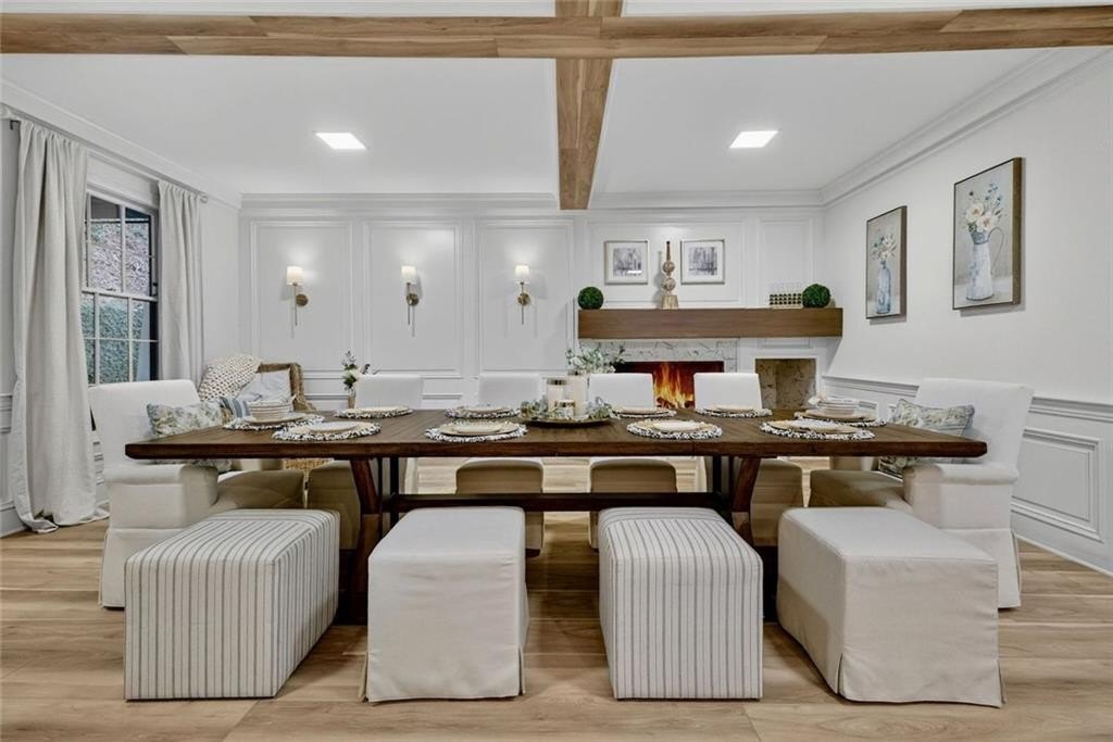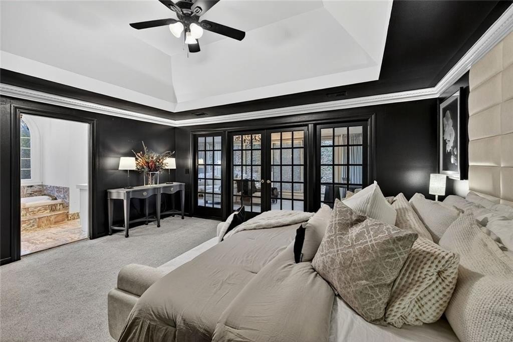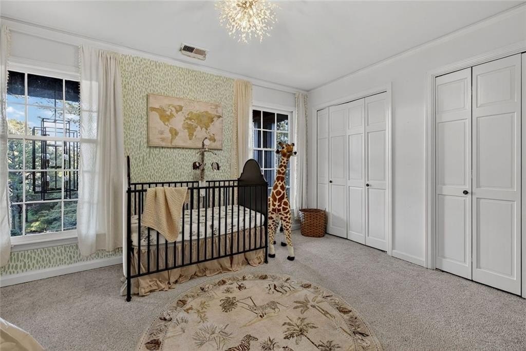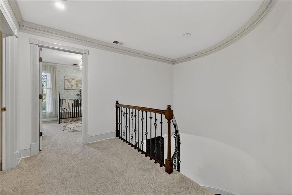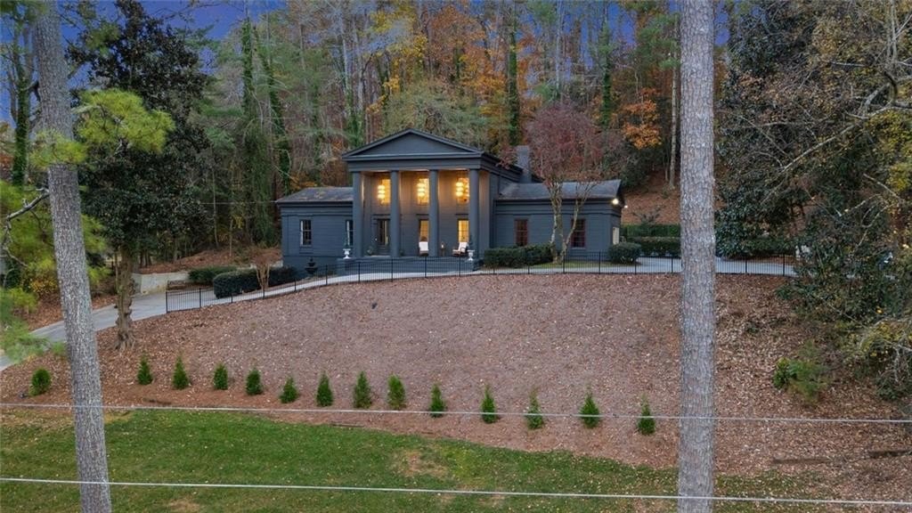A gated Greek Revival estate reimagined in Iron Ore by Benjamin ChiMax sits atop a gentle hill just steps from the Chattahoochee River. Historic gravitas integrates modern refinement the moment you enter the grand two-story foyer with preserved moldings and sweeping lines. The main level includes a gracious living room, a flexible study/optional bedroom, and a newly updated kitchen with quartz counters, crisp subway tile, and all-new appliances. The kitchen opens to a breakfast bar formal dining room. French doors lead to an expansive covered patio and heated saltwater pool framed by mature trees. A standout offering is the 22-seat cinema room perfect for immersive movie nights. Upstairs, a serene owner's suite features high ceilings, an oversized walk-in closet, romantic Juliet balcony overlooking the landscape, and bath with a marble shower and soaking tub inviting relaxation at day's end. Secondary bedrooms are bright and private. Expanding the home's versatility, the terrace level adds a large recreation room with a bar, bed, and full bath. A sweeping wrap-around driveway offers ease abundant parking for guests. Set along one of Sandy Springs' most storied corridors and just a short walk from the Chattahoochee River, the home offers beautiful views along historic Spalding Drive. Its ideal location places you minutes from Dunwoody Country Club, Perimeter Center, top schools, and major routes-including GA-400 and I-285-with quick access to the King & Queen building (11 minutes) and Avalon (13 minutes). A compelling mix of heritage, convenience, and enduring style.