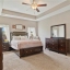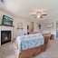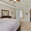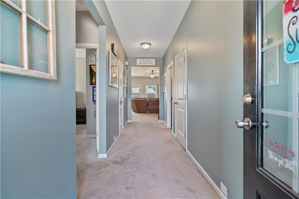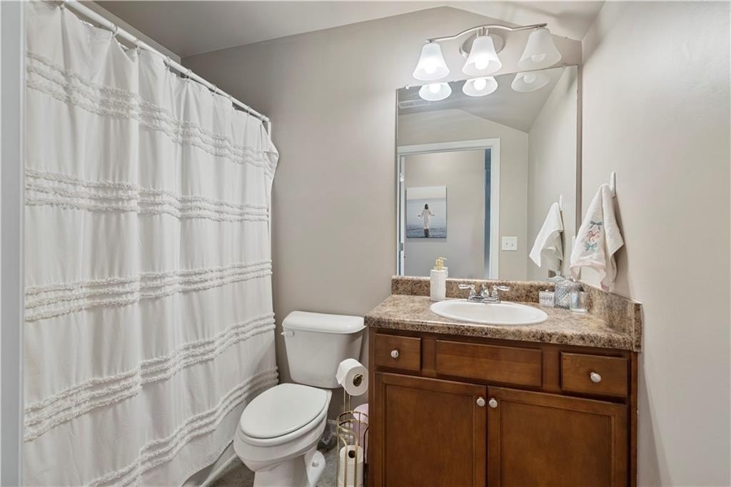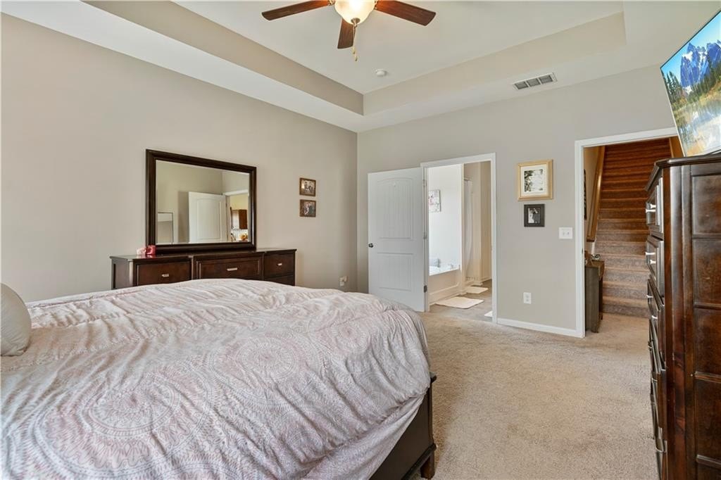 The primary suite, located on the main floor, is a private retreat with ample space for rest and relaxation. It features a trey ceiling, plush carpeting, and an ensuite bathroom with a spacious vanity area and a separate shower, providing a spa-like experience. Two additional bedrooms on the main level share a full bathroom, offering flexible accommodation options.