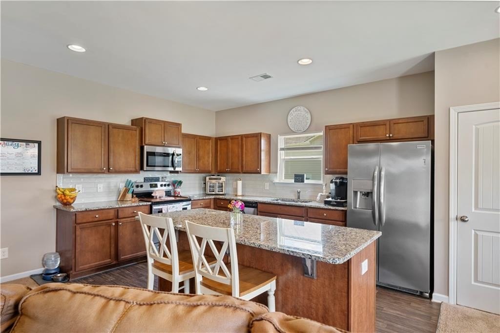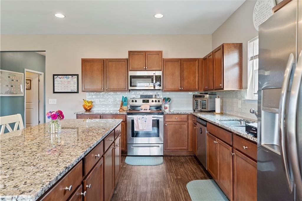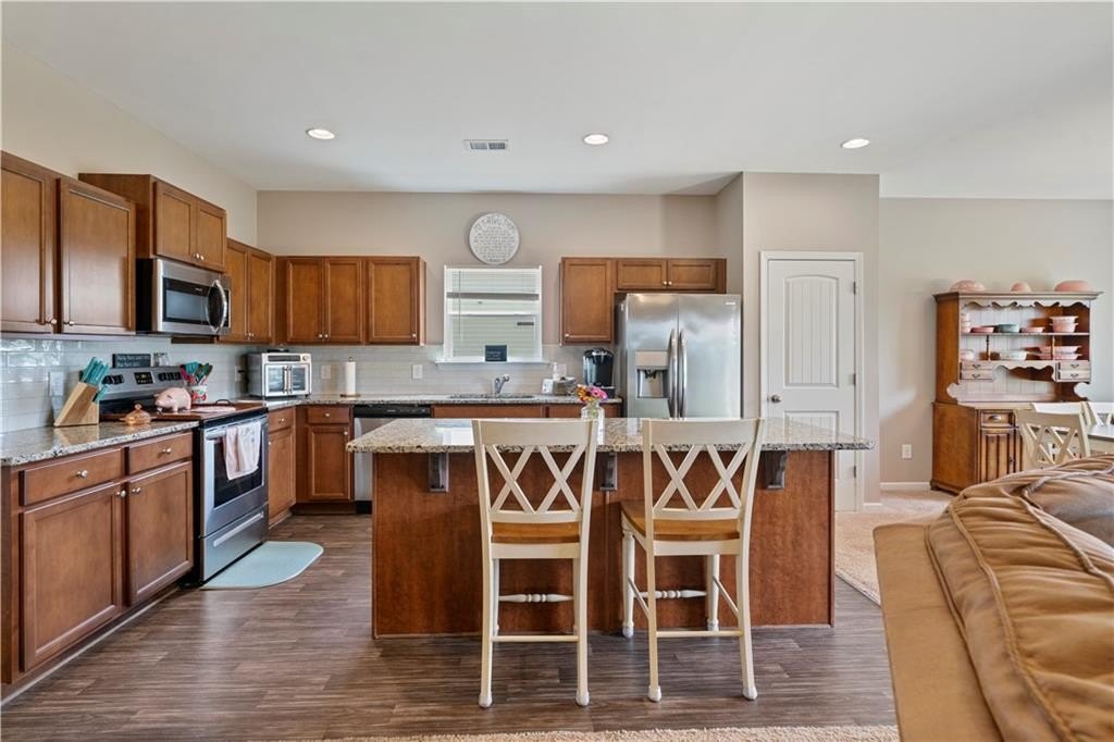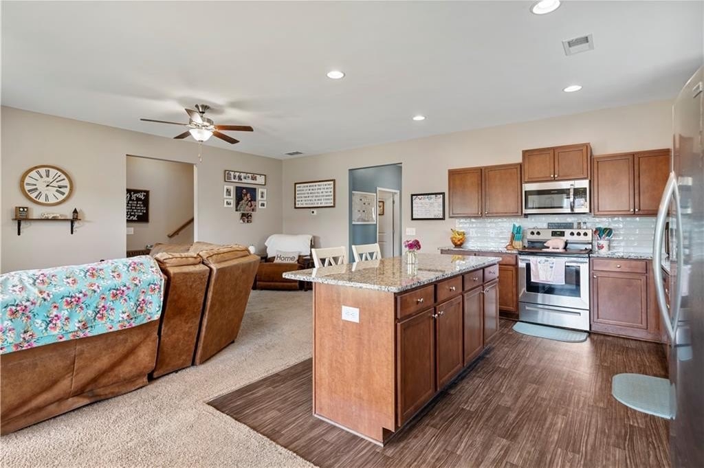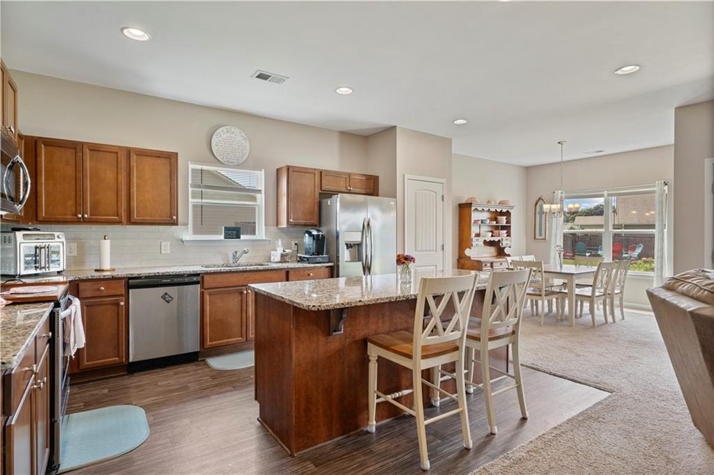 Upon entering, a sense of warmth and comfort greets you. The main level hosts the primary living areas, including a sizable great room with a fireplace, creating a focal point for gatherings. The open-concept design flows seamlessly into the kitchen and dining area, making it ideal for entertaining guests. The kitchen is equipped with granite countertops, stainless steel appliances, a pantry, and a large center island with seating, combining functionality with style.
