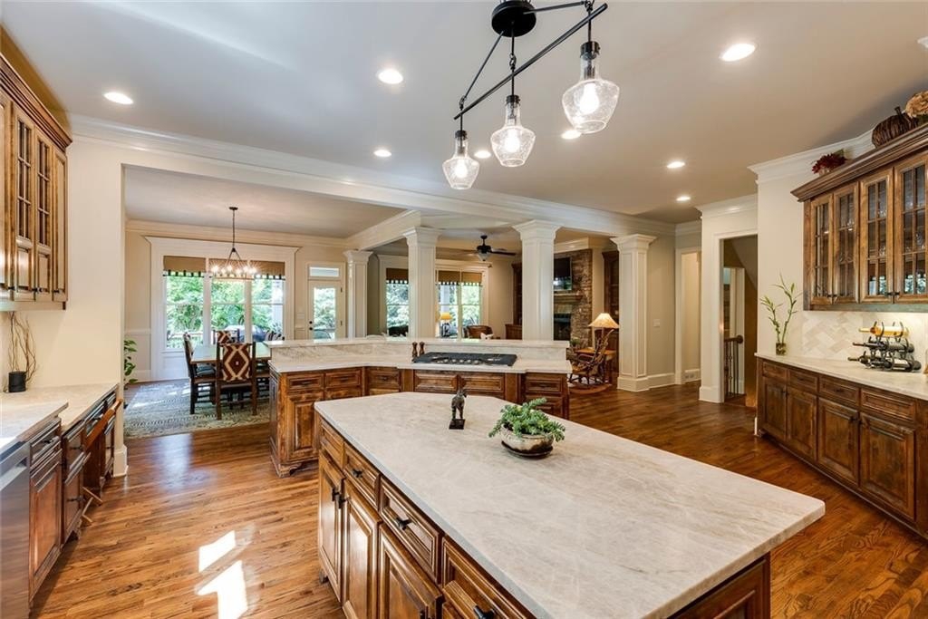 Nestled on a picturesque cul-de-sac in prestigious Sandy Springs, this exceptional custom home is a true masterpiece-now featuring a newly renovated gourmet kitchen with luxurious quartzite countertops, a stylish new tile backsplash, and a sleek new gas cooktop. Designed for both everyday comfort and grand entertaining, this home offers a backyard paradise complete with a heated PebbleTec saltwater pool, thrilling water slide, and bubbling spa-your private resort for relaxation, fun, and unforgettable family gatherings. Step inside to discover interiors that exude elegance and craftsmanship, with soaring ceilings, exquisite moldings, and refined architectural details throughout. The two-story foyer opens to a richly paneled study with a cozy fireplace-ideal for remote work-and a banquet-sized dining room perfect for hosting special occasions. The gracious living room impresses with arched windows and a dramatic fireplace, creating a warm and welcoming atmosphere. At the heart of the home, the newly updated kitchen is a chef's dream. In addition to the fresh quartzite counters and tumbled marble backsplash, it boasts a center island with breakfast bar, premium stainless steel appliances including double ovens, and a spacious walk-in pantry. The sunlit breakfast area flows into the keeping room, where a stacked stone fireplace and custom built-ins overlook the lush backyard. Step outside to an expansive porch and deck-ideal for dining al fresco or relaxing while enjoying the serene, fenced yard. The main level also features a private ensuite guest bedroom, two elegant half baths, and a mudroom with direct access from the three-car garage. Upstairs, the luxurious owner's suite serves as a true retreat, with a tray ceiling, sitting area with fireplace, and convenient morning kitchen. The spa-inspired bath includes a double vanity, oversized shower, jetted tub, and a custom-designed walk-in closet. Three additional ensuite bedrooms offer comfort and privacy, and a large bonus room provides flexible space for a playroom, media room, or additional living area. The terrace level is designed for entertaining and multi-generational living, complete with a full kitchen, family room with fireplace, home theater, wine cellar, bedroom and full bath with sauna, exercise room, game room, recording studio, and an additional half bath. Walk out to the beautifully hardscaped backyard, where a spacious stone terrace, heated pool, spa, bocce ball court, and outdoor fireplace create the ultimate outdoor oasis. Located in the award-winning Heards Ferry Elementary and Riverwood High School districts and close to Atlanta's top private schools, this one-of-a-kind estate offers convenience to premier dining, shopping, City Springs, Chastain Park, and major interstates. This home truly offers the perfect blend of luxury, comfort, and family-friendly amenities-an extraordinary opportunity not to be missed. Seller is a licensed real estate agent in the state of Georgia