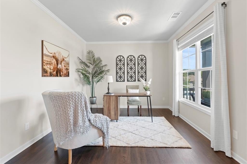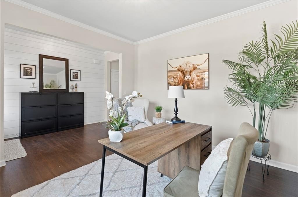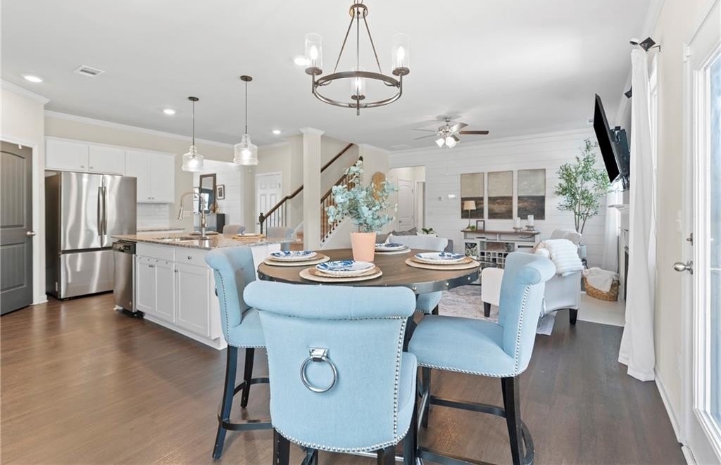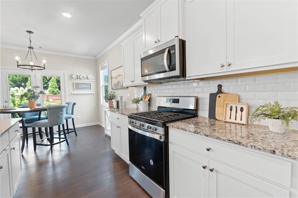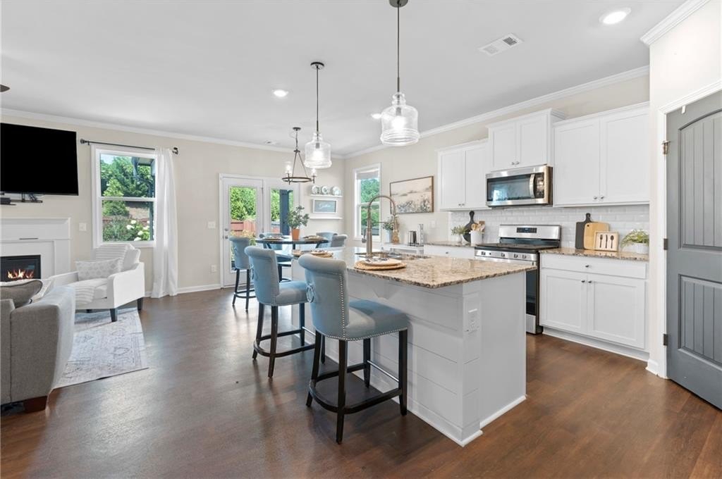 Inside, the open-concept floor plan provides generous space for both daily living and entertaining guests. The versatile main level features a formal living and dining area—or a home office—tailored to fit your lifestyle. The chef’s kitchen impresses with crisp white cabinets, elegant granite countertops, a spacious island with pendant lighting, a stylish tiled backsplash, stainless steel appliances, and a walk-in pantry—ideal for preparing family meals and gatherings.