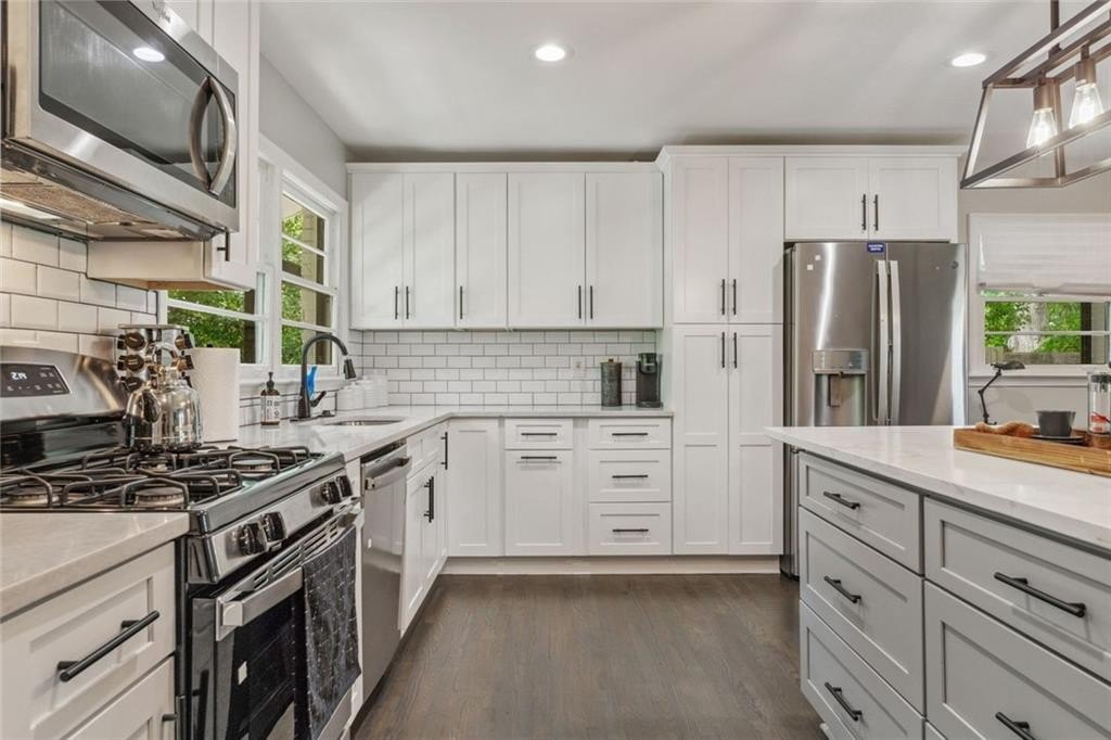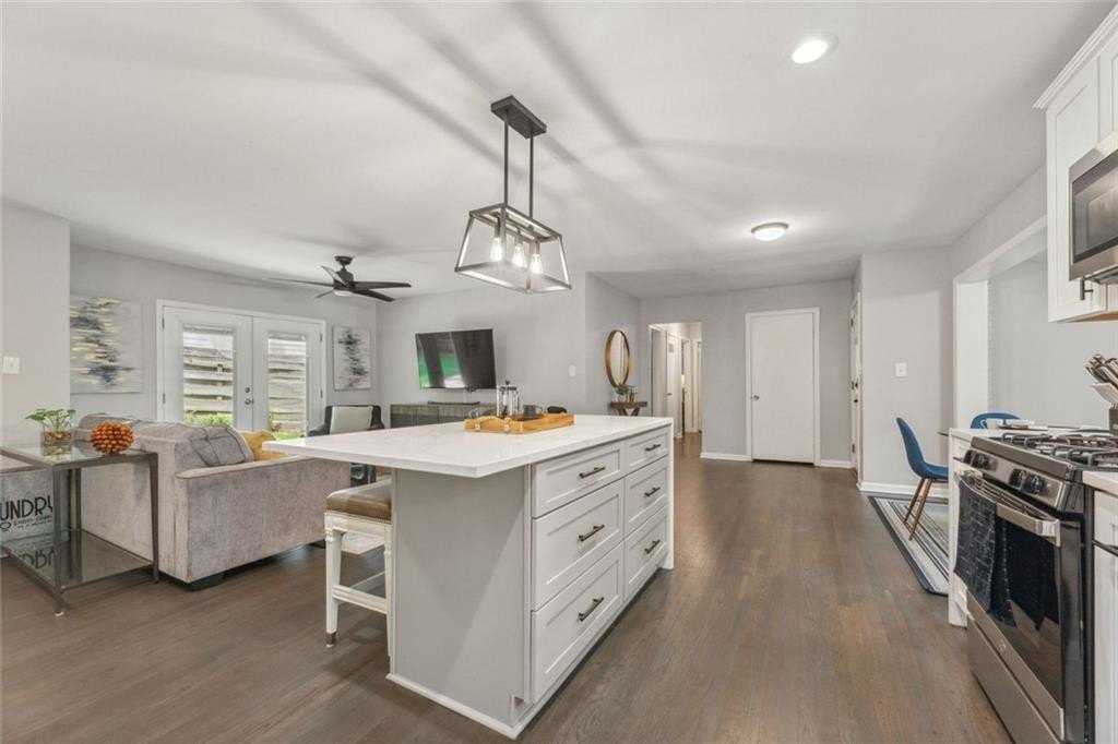 Perched on a CORNER LOT with a BUNGALOW FEEL, this UPDATED ALL BRICK RANCH makes a strong first impression. Inside, HARDWOOD FLOORS flow through a bright open layout centered around a modern WATERFALL ISLAND and STAINLESS STEEL APPLIANCES. The NEW KITCHEN and RENOVATED BATHS shine with sleek finishes, while the NEW DRIVEWAY, NEW DECK, and FLAT BACKYARD offer both curb appeal and outdoor space for relaxing or entertaining.