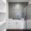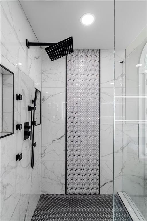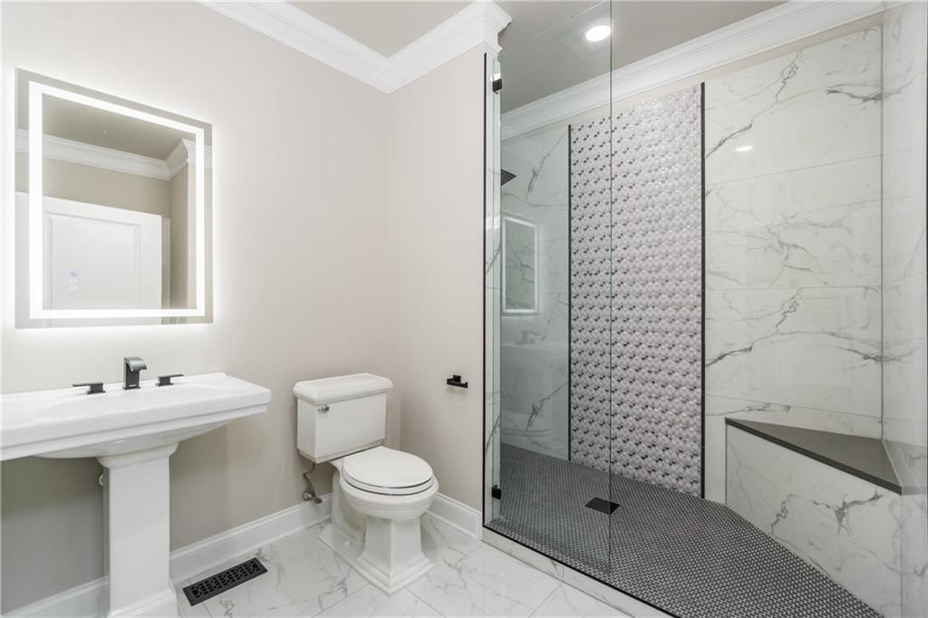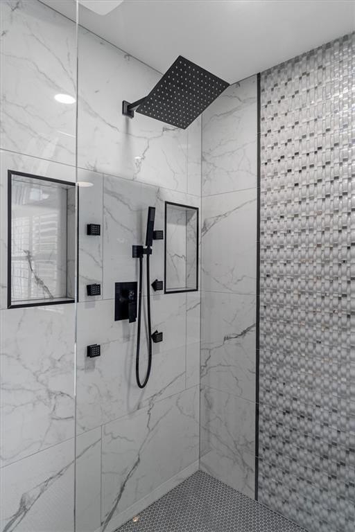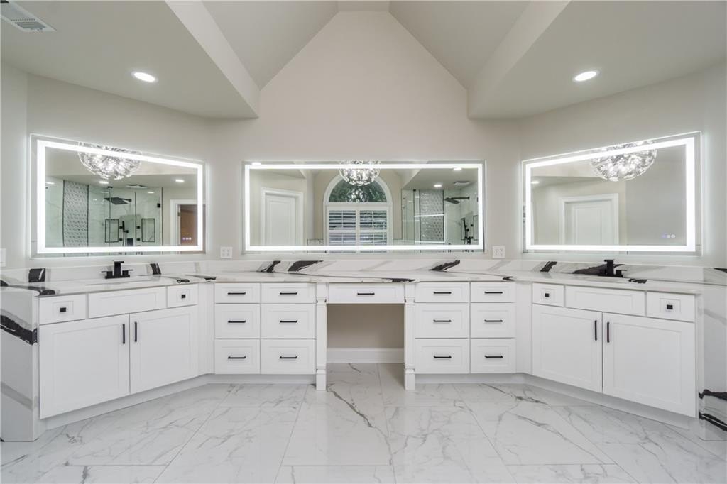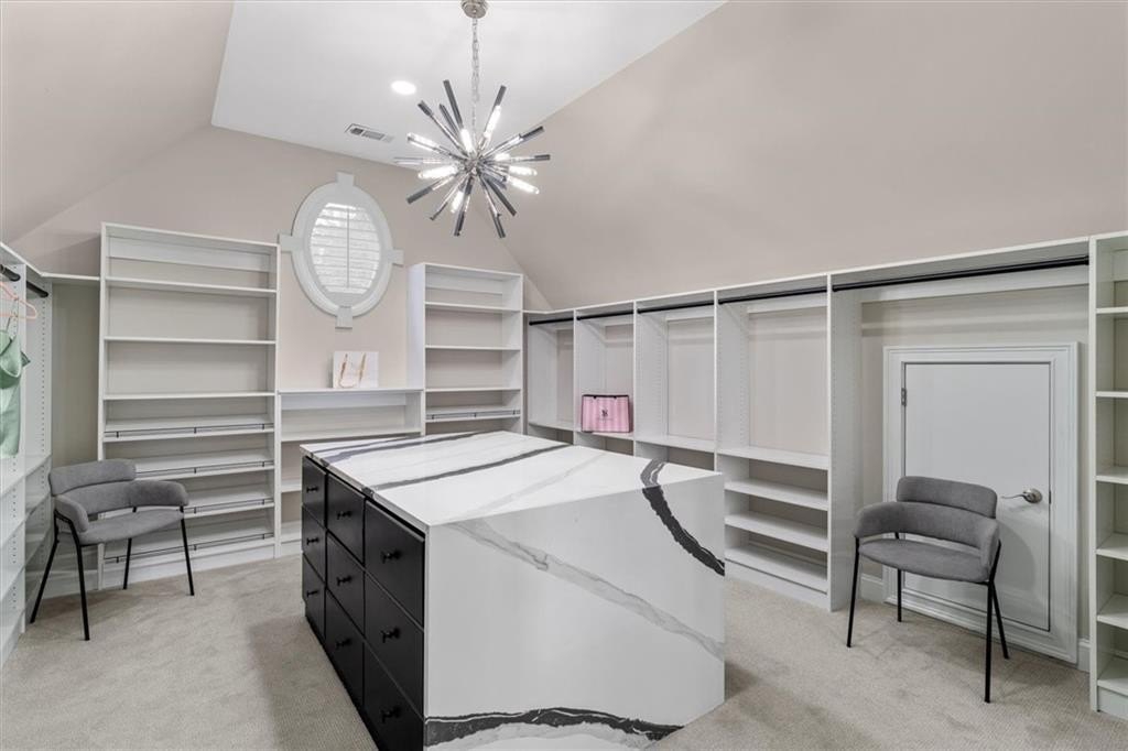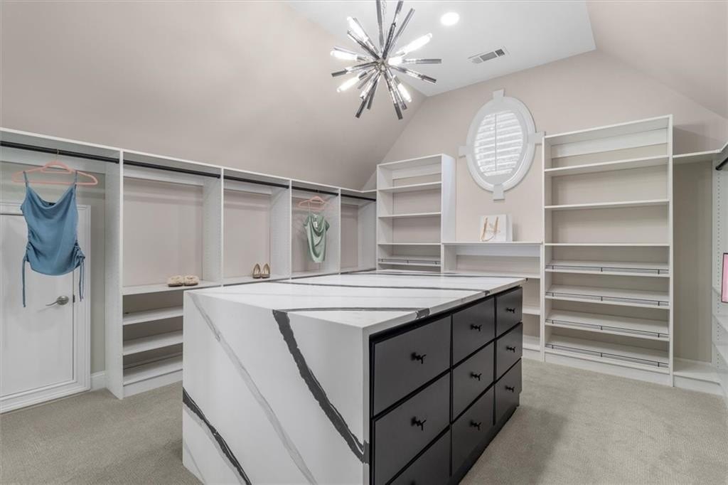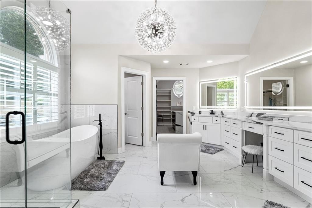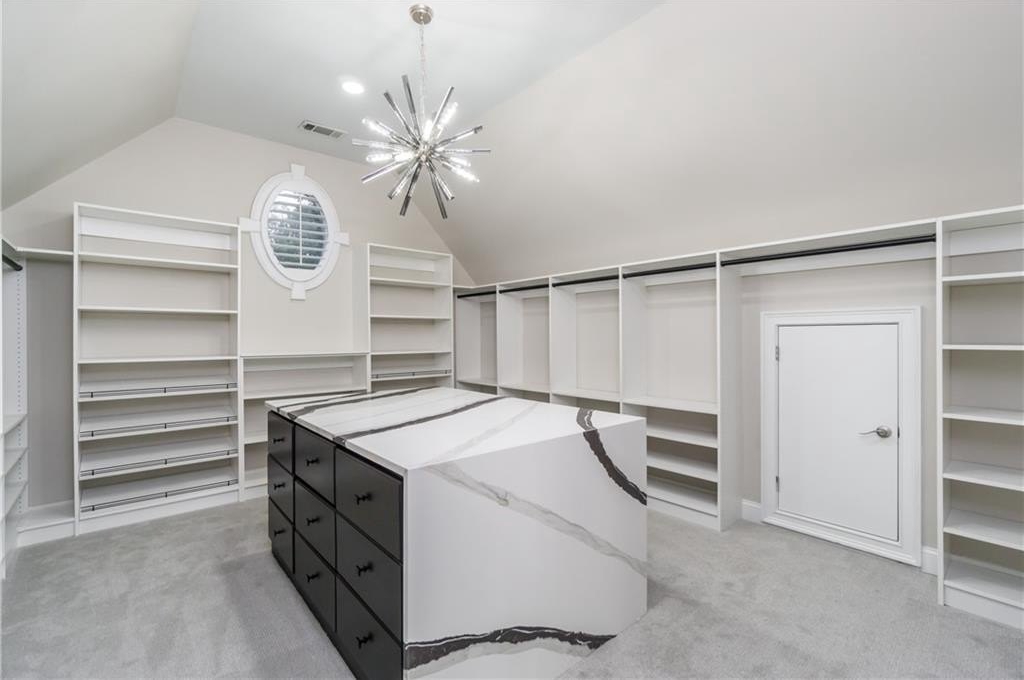 The primary suite is a private sanctuary: unwind in your jetted tub, refresh in the glass shower with custom body jets, and enjoy a bespoke walk-in closet featuring a glass entry door and a quartzite island — a dressing space that truly feels royal.