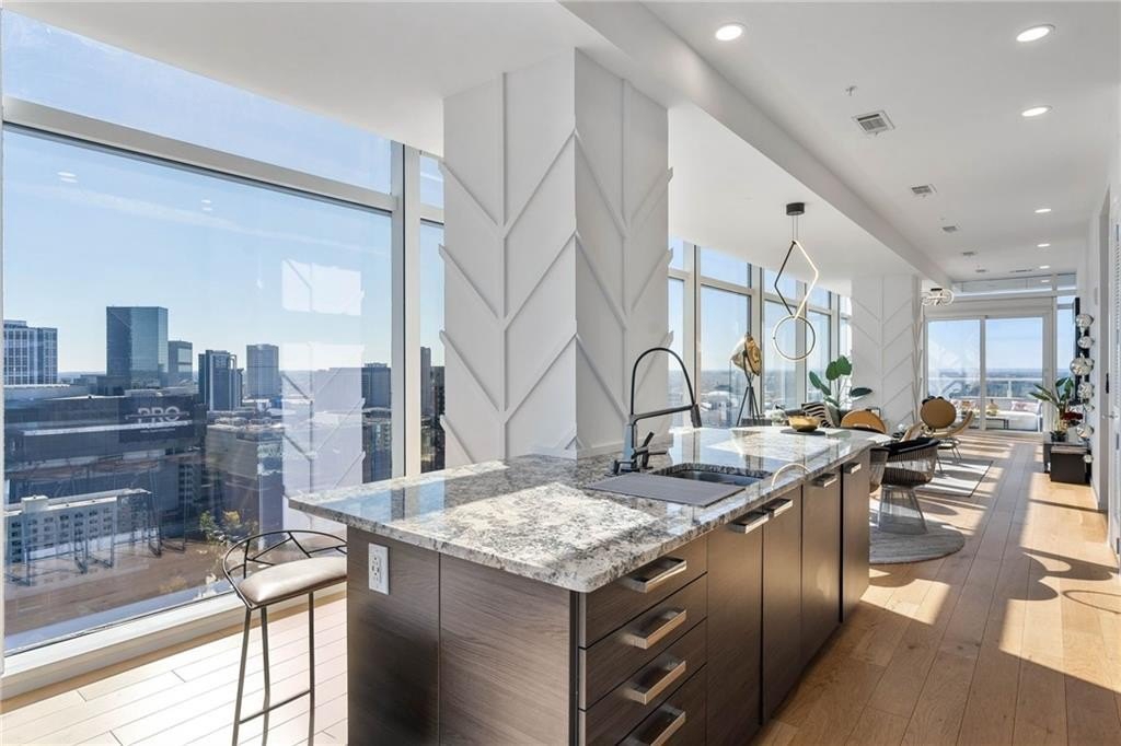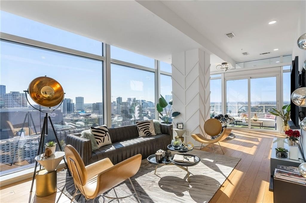 Soaring majestically atop the 25th floor of the illustrious W Residences, this splendid 2-bedroom, 2.5-bathroom sanctuary epitomizes consummate luxury and architectural finesse, offering commanding 180-degree panoramas of Atlanta's scintillating skyline. Enveloped in soaring floor-to-ceiling glazing, the residence is an opulent display of natural luminosity and breathtaking vistas, seamlessly melding urban grandeur with refined sanctuary. Exquisitely appointed with bespoke architectural millwork, artisanal trim detailing, and custom built-in closets throughout, the expansive open-concept floor plan orchestrates an elegant symphony of space-harmonizing a stately formal dining salon, a sophisticated lounge, and an expansive living gallery, meticulously crafted for both lavish entertaining and intimate repose. The chef's kitchen is an epicurean masterpiece, boasting polished stone countertops, custom European cabinetry, a temperature-controlled integrated wine cellar, and an exclusive suite of Gaggenau appliances-an impeccable convergence of avant-garde technology and sumptuous design tailored for the culinary connoisseur. The primary suite is a celestial retreat, showcasing dual bespoke walk-in closets with custom built-ins and a spa-caliber bath adorned with intricately veined tile, floating dual vanities illuminated by ethereal LED mirrors, a deep freestanding soaking tub, and a frameless rain-shower enclosure-an oasis of tranquility and indulgence. The secondary suite mirrors this grandeur, featuring panoramic floor-to-ceiling fenestration and a private, meticulously appointed en-suite spa bath replete with custom storage and exquisite finishes. A refined powder room elevates the residence's sophistication with timeless elegance. State-of-the-art automation encompasses Lutron motorized high-end shades, customizable ambient LED lighting, and designer ceiling fans, all seamlessly integrated to cultivate an atmosphere of bespoke ambiance and effortless control. Step onto the voluminous private terrace, an exclusive skyward sanctuary commanding unparalleled vistas of the city's ever-changing panorama-where resplendent sunsets and nocturnal cityscapes compose a living masterpiece. This extraordinary domicile includes two dedicated parking spaces and affords privileged access to the W Residences' peerless array of white-glove amenities: 24-hour concierge and bespoke hotel services, valet parking, an infinity-edge resort pool, world-class spa, cutting-edge fitness center, and a private helipad. With immediate ingress to major thoroughfares and proximity to Atlanta's premier cultural, culinary, and entertainment destinations, this is an unparalleled residence-an architectural jewel where elevated living transcends the ordinary into the extraordinary.