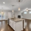 oversized island, granite countertops, and stainless steel appliances. The kitchen seamlessly flows into the spacious family room, perfect