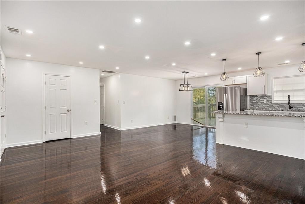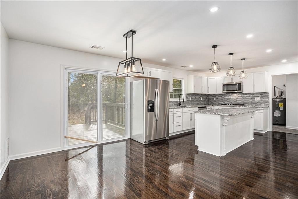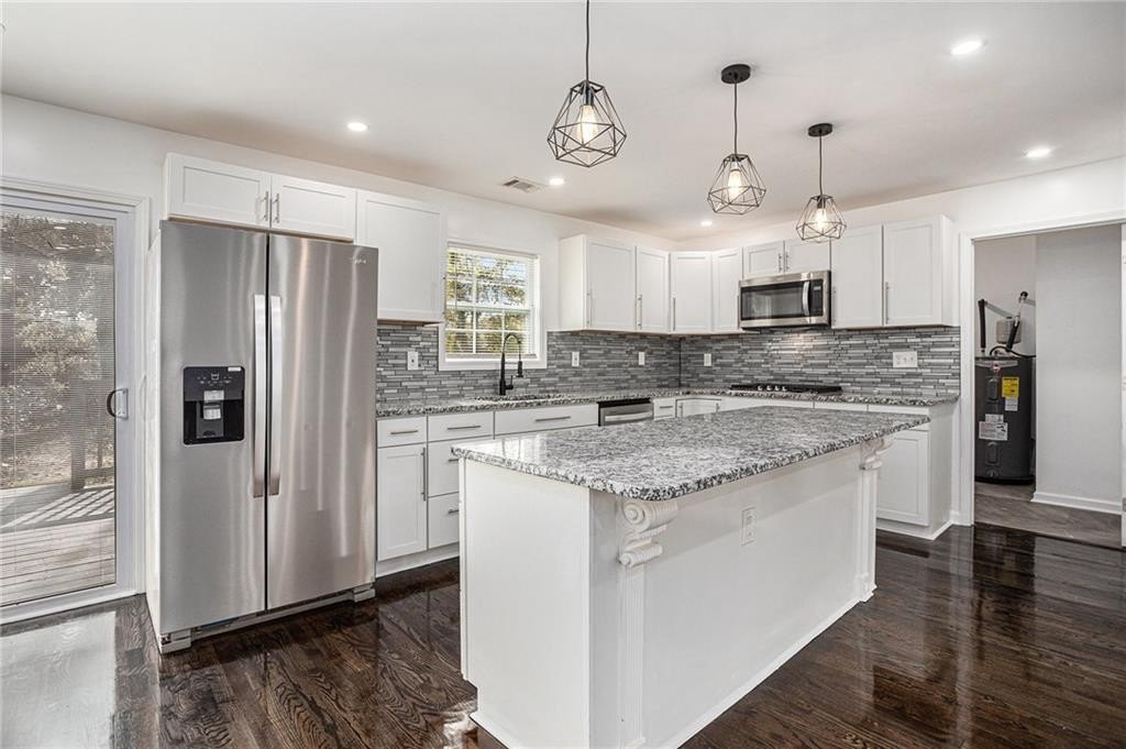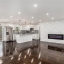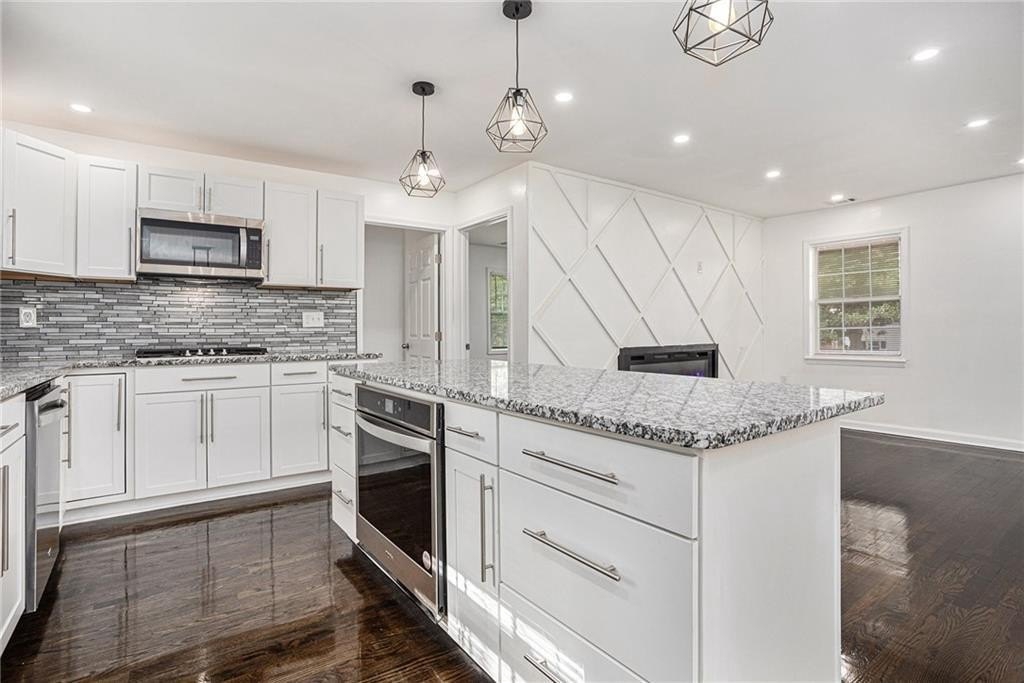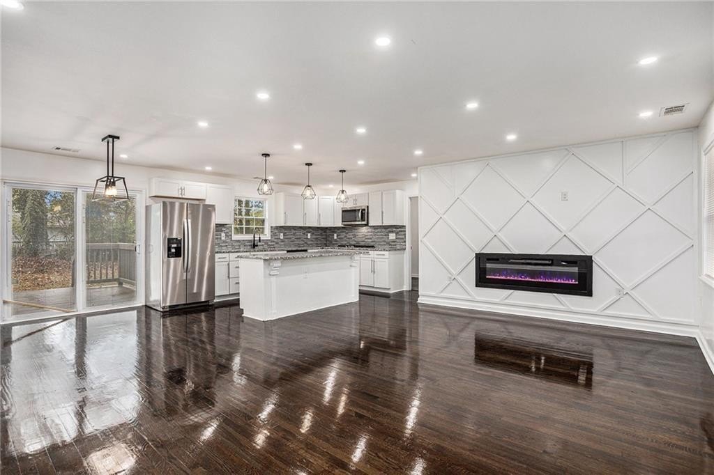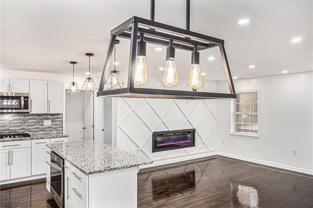 Step into a spacious open-concept layout with hardwood floors, cozy fireplace, accent walls, and recessed lighting. The chef’s kitchen boasts granite counters, stainless appliances, custom cabinets, and a central island perfect for entertaining.
