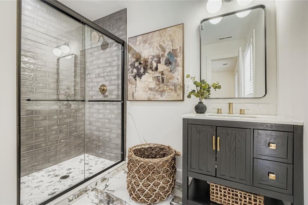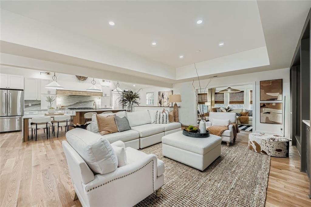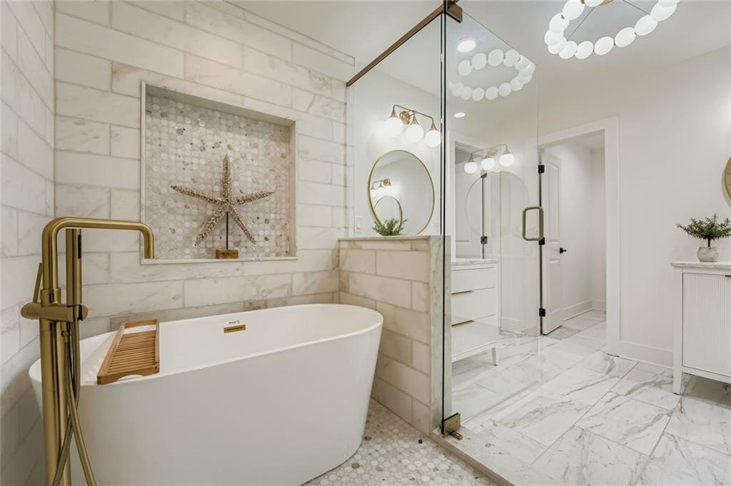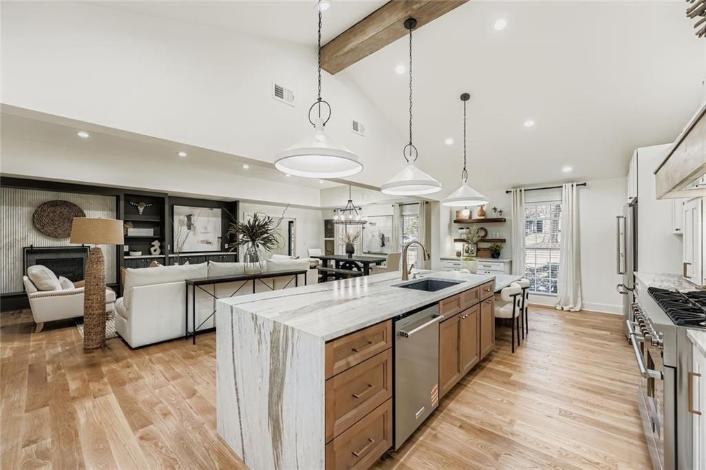 Remarkable property with stunning renovation offers an unparalled living experience inside the perimeter, featuring 5 bedrooms, 4 1/2 baths, all set on a sprawling 1.6 acre lot. This meticulously redesigned home boasts a fabulous open kitchen, complete with large island w/drop down attached dining table, perfect for both family meals and entertaining guests. The kitchen is a chef's dream, featuring leathered quartzite counters with double waterfall, professional range, all new appliances and designer lighting. Ample cabinetry and a spacious separate walk in pantry with pull out drawers ensure plenty of storage and easy access to essentials. The open floor plan with white oak flooring seamlessly connects the living room, which features a fireplace surrounded by built-ins for added storage. Adjacent to the living room is a gorgeous light-filled sunroom with wall of windows that overlook the upper deck and super private backyard. The main level also includes a bright separate laundry room complete with sink. Primary bath has large shower/wet room with tub all encased in Bianco Orion marble. Each of the main level bedrooms come with an en-suite bathroom, ensuring the utmost privacy for all residents. The terrace level offers additional living space, featuring a large rec room, three additional bedrooms and full bath with/tub shower. Terrace level is also equipped with additional cabinetry and a kitchen sink, and provides access to a patio overlooking the level area of the backyard, catering perfectly to multi-family needs. The outdoor space provides room for a pool, making it an ideal oasis for relaxation and entertainment. Located close to transportation, Chastain Park, shopping and dining, yet nesteled on a quiet street, this home combines convenience with tranquility. New roof, HVAC, appliances, driveway/walkway, sewer line, etc all with a thoughtfully reimaged layout. Approved and inspected by city of Sandy Springs. This is a wow house.