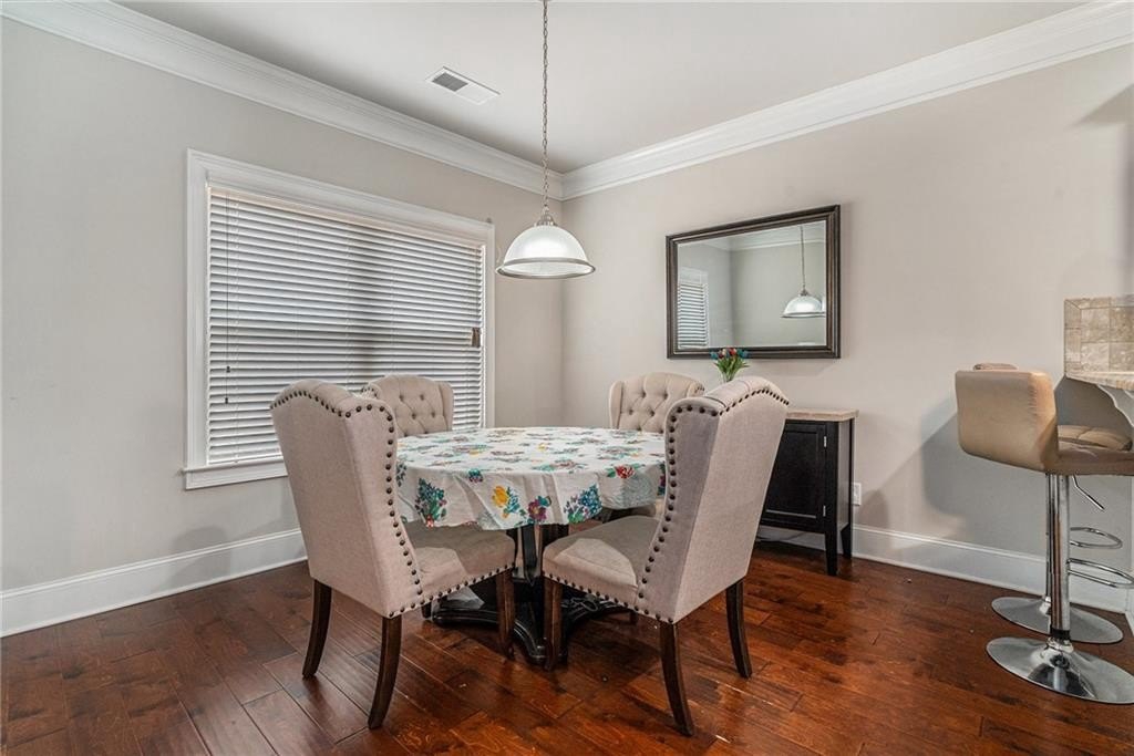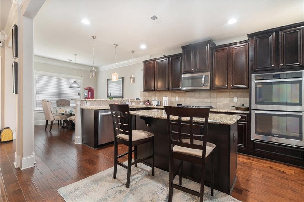 The gourmet kitchen is a chef’s dream, featuring granite countertops, stainless steel appliances, tile backsplash, a walk-in pantry, and a large center island. The adjacent breakfast room offers plenty of natural light and opens to the inviting family room, creating the perfect flow for hosting or relaxing.