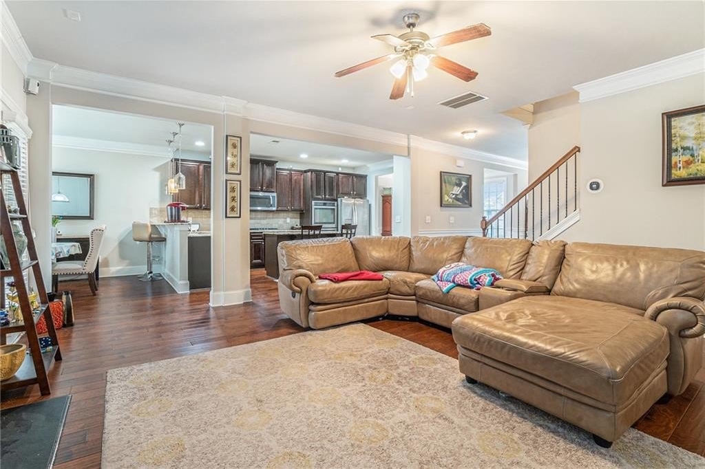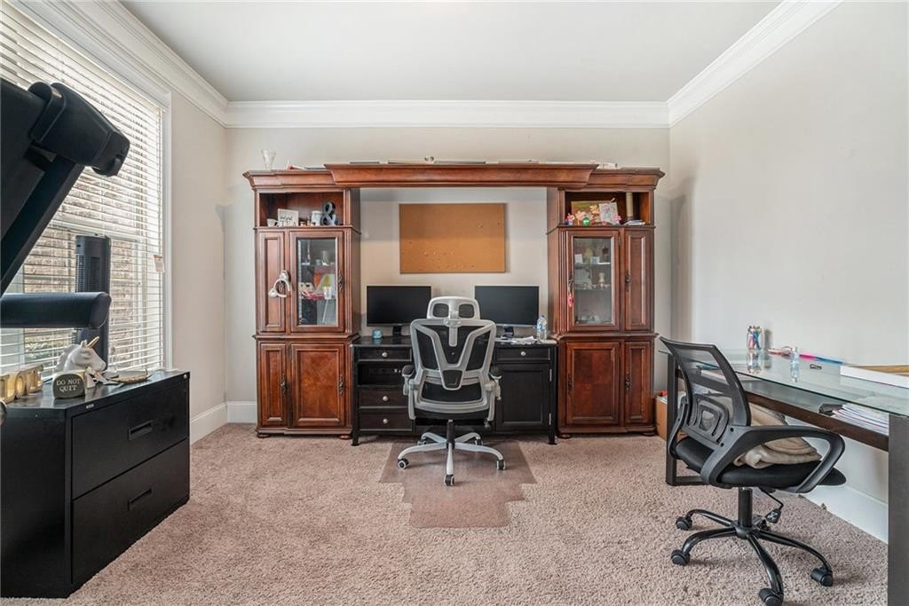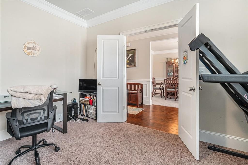 As you enter, you're welcomed by a grand foyer, elegant archways, and gleaming hardwood floors that flow throughout the main level. The open yet defined floor plan includes a formal dining room with coffered ceilings, a dedicated office or study, and a guest suite with full bath on the main floor—perfect for visitors or multi-generational living.