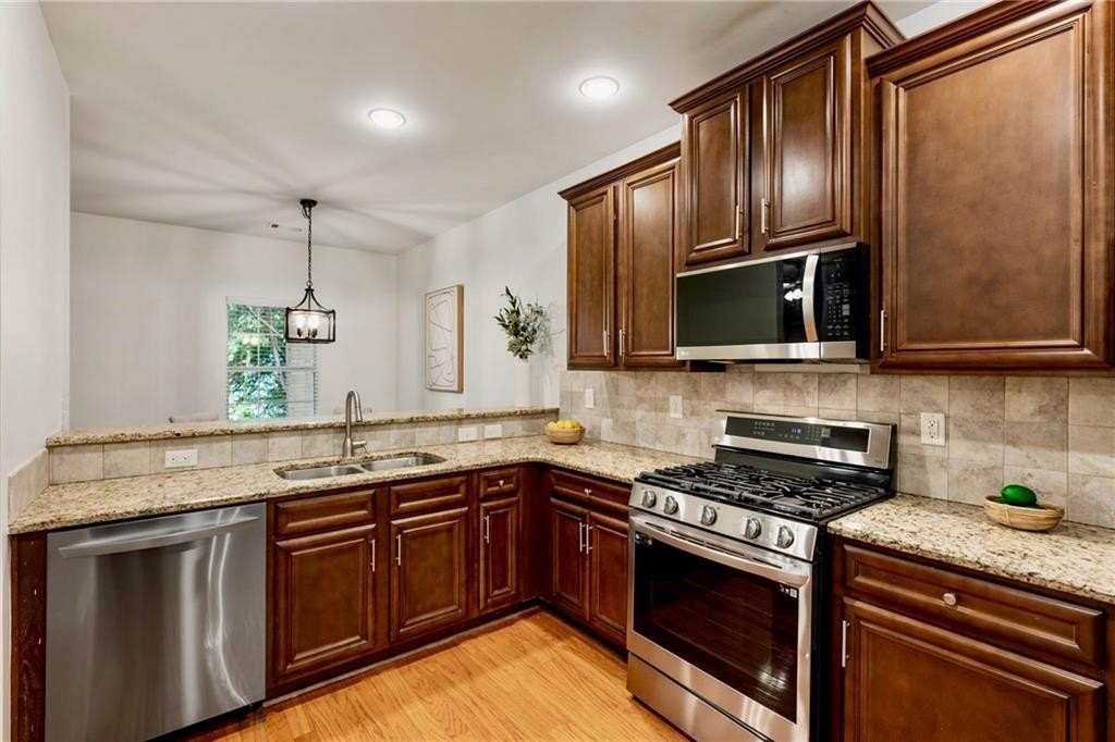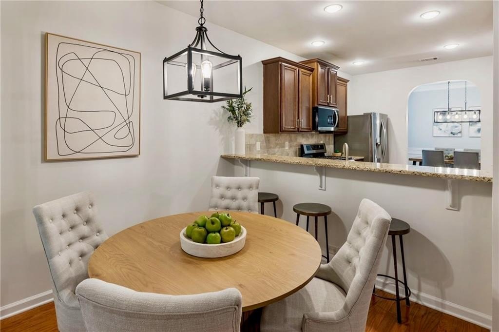 The main level features a spacious open-concept layout with soaring ceilings, rich hardwood floors, and abundant natural light. At the heart of the home is the gourmet kitchen, complete with granite countertops, custom cabinetry, updated stainless steel appliances, an oversized pantry, and a breakfast bar that comfortably seats four. The kitchen flows seamlessly into a sun-filled breakfast room with views of the serene backyard and the inviting family room centered around a cozy fireplace.