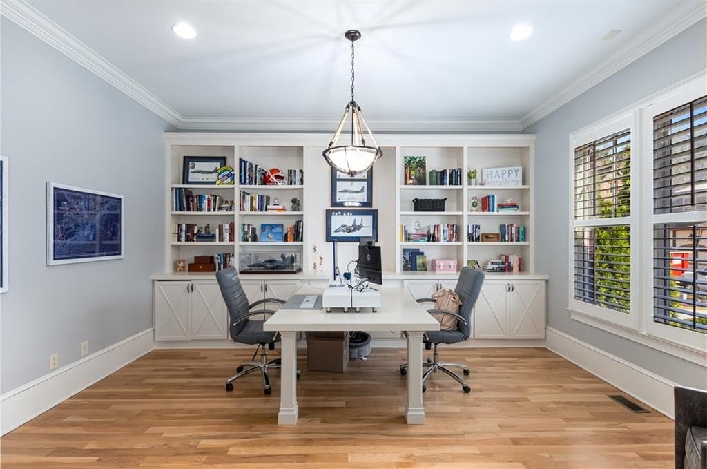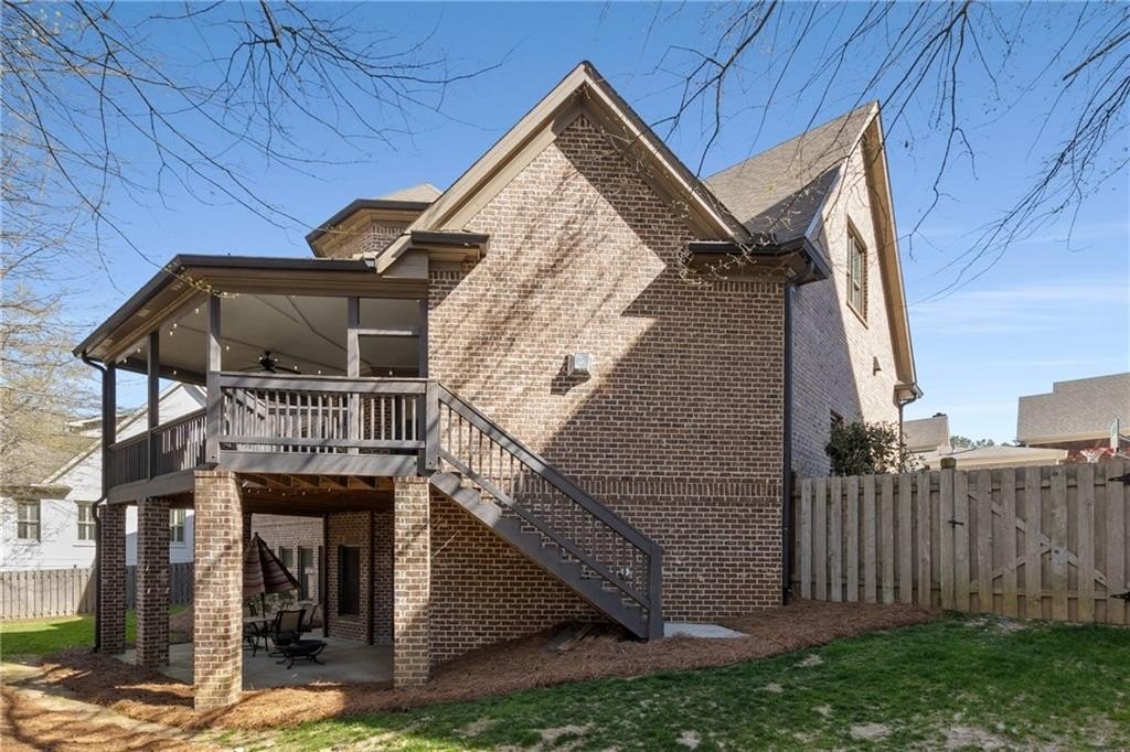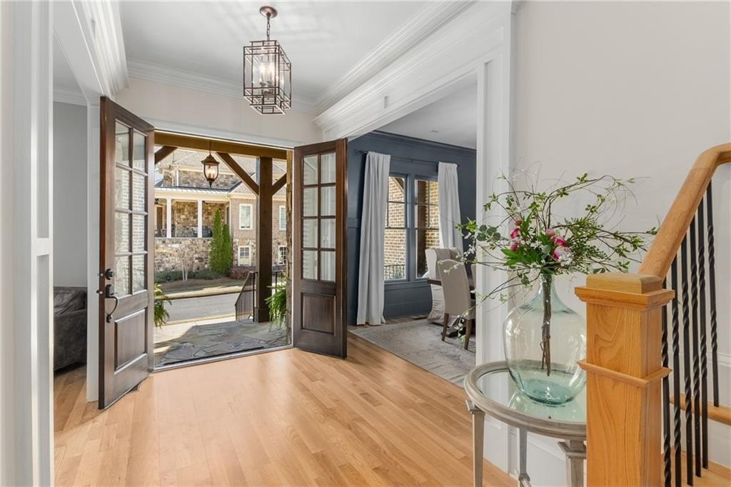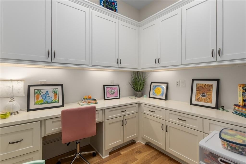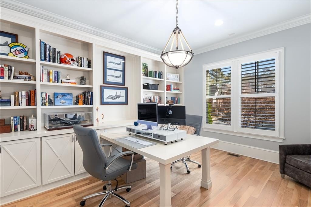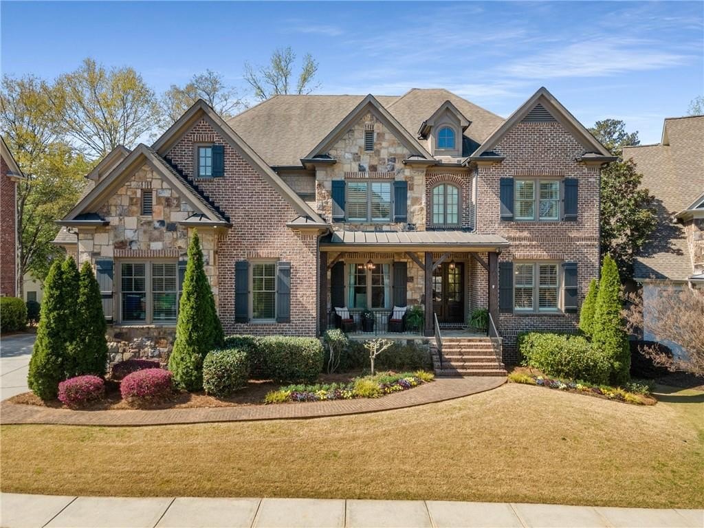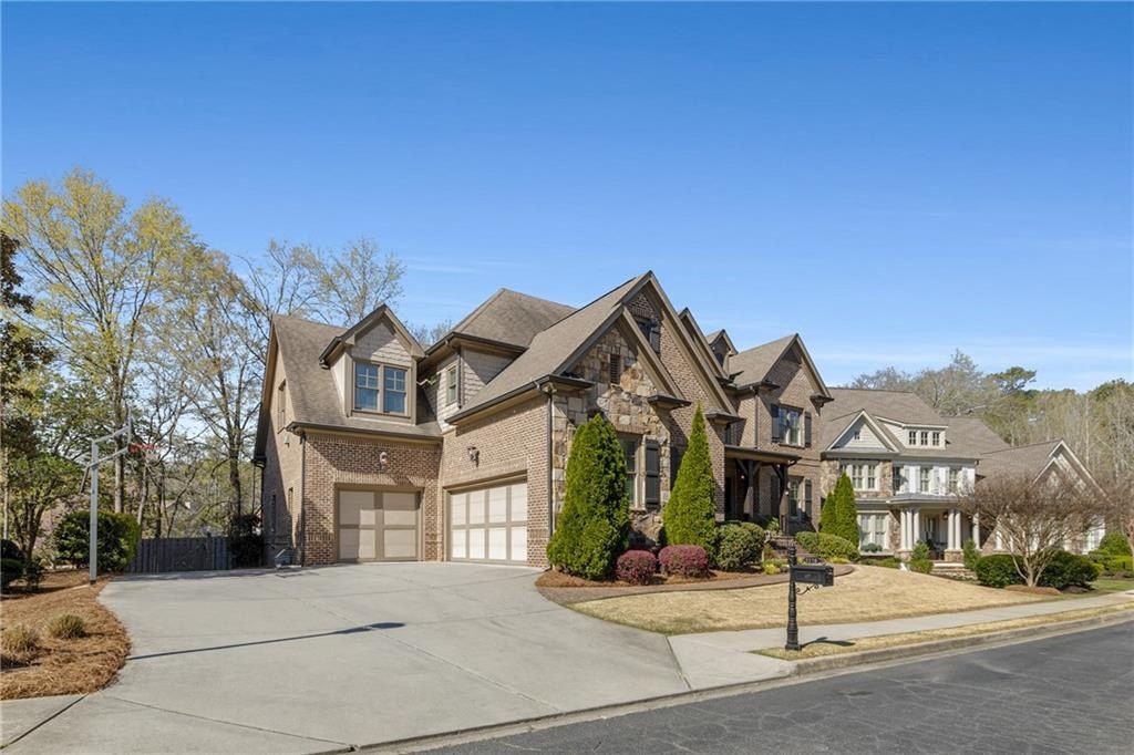 Here's your chance to own a newer home in an established private, gated enclave in desirable Peachtree Corners! Attractive 4-sided brick and stone front elevation; covered front porch and elegant double door entry; gleaming hardwood floors on entire main level; tall ceilings (10 foot) and 8 foot doors make this home feel wide open, bright, and spacious. Custom library/office with built-ins & double work stations - enjoy working from home! Coffered ceiling & concrete cast fireplace in the family room; spacious kitchen w/large island, granite counters & stainless appliances, walk-in pantry, breakfast area, & impressive vaulted keeping room w/2nd stone fireplace. Smart additional house manager's office or art room behind kitchen - very useful! Back covered deck; guest bedroom & full bath on main. Upstairs features 10' ceilings, hardwood floors, and a luxurious primary suite w/sitting area, workout room, oversized closet, dual head walk-in shower, and standalone tub. Large secondary bedrooms include one ensuite, and two additional bedrooms that share a jack n' jill bath. Additional large upstairs media room (or 6th bedroom) ideal for movie night, gaming, or doing homework! Updated light fixtures throughout; full basement, stubbed for bath & fireplaces; fenced, level, low maintenance backyard; ground-level covered back patio below the deck. Located near excellent public and private schools, The Forum, Town Center, parks, the river, and the 141 highway corridor. Enjoy the good life in Peachtree Corners!