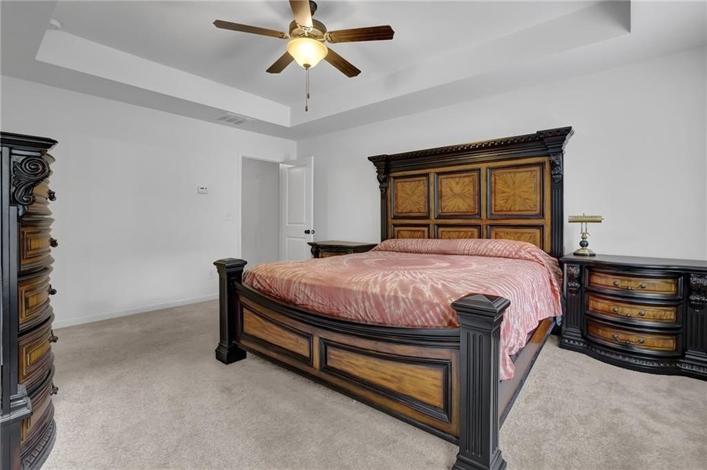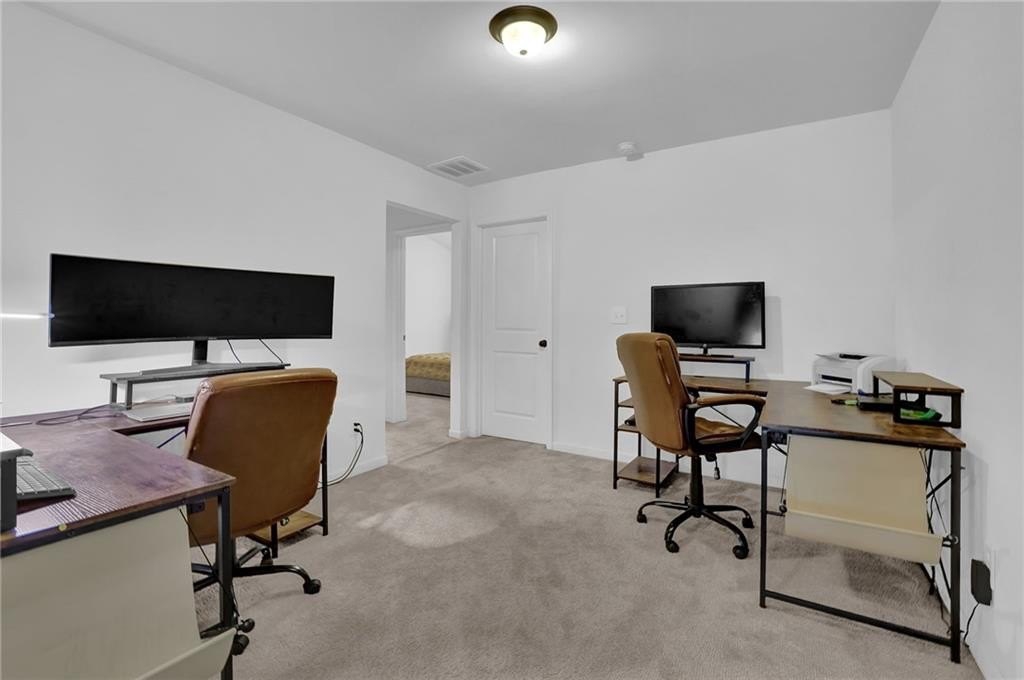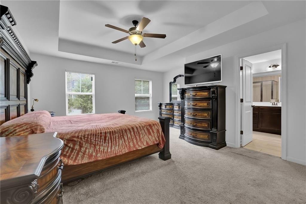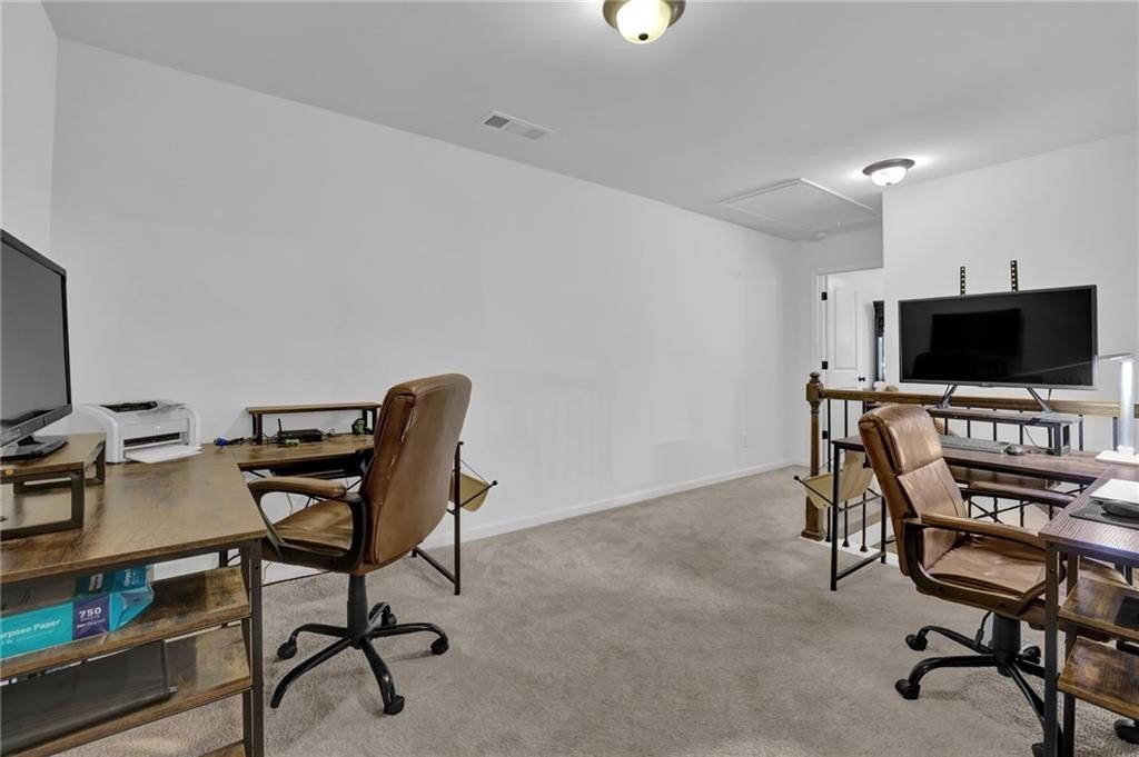 Upstairs, a flexible loft area provides the perfect bonus space for a home office, reading nook, or play area. The large primary suite is a true retreat with a tray ceiling, walk-in closet, and spa-style ensuite bath featuring a dual vanity, garden tub, and separate tile shower. Two additional bedrooms, a full hall bath, and a convenient upstairs laundry room round out the second level.