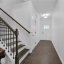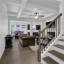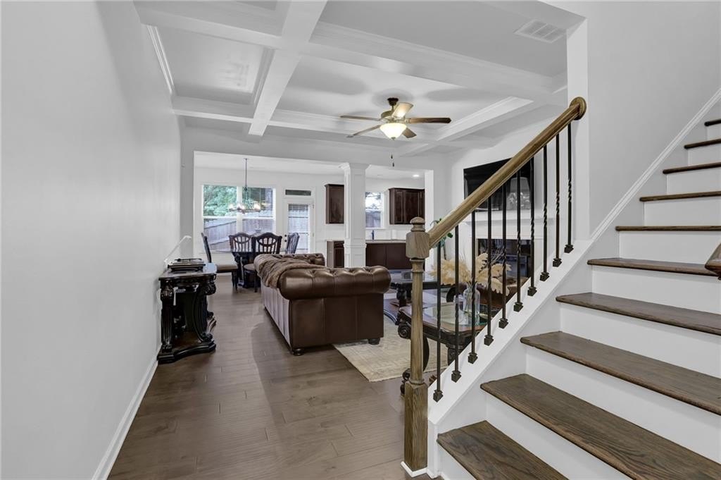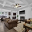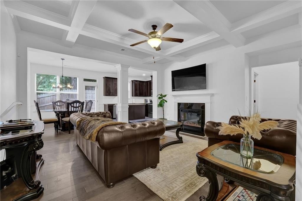 Step inside to find a light-filled open-concept main level with tall ceilings, sleek engineered flooring, and a seamless flow from the living area to the kitchen. The spacious family room features a cozy fireplace—perfect for gathering or unwinding—and opens to a modern eat-in kitchen designed for both everyday living and entertaining. Enjoy stainless steel appliances, stone countertops, a stylish tile backsplash, an oversized island with seating, and generous cabinet space including a walk-in pantry.
