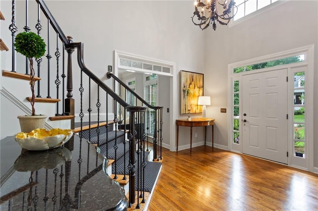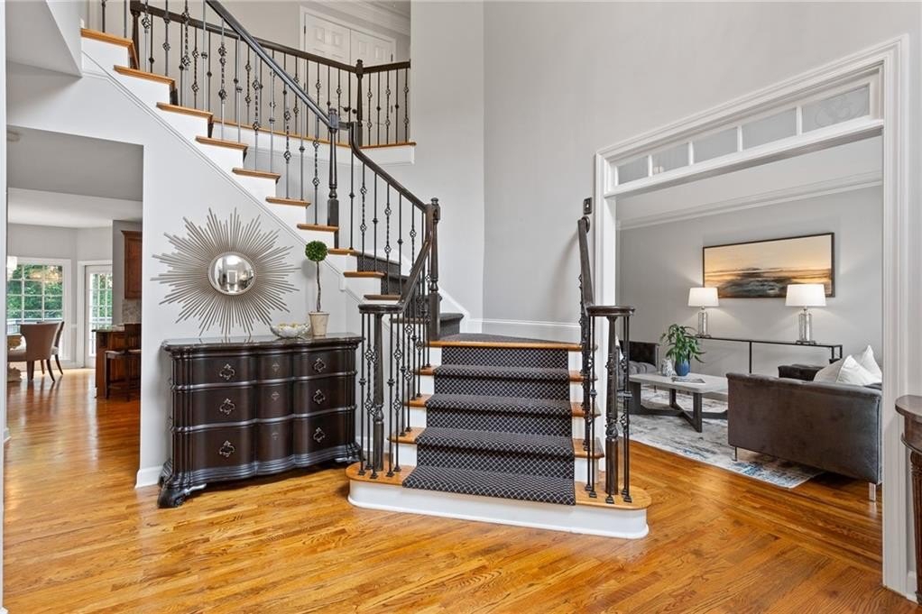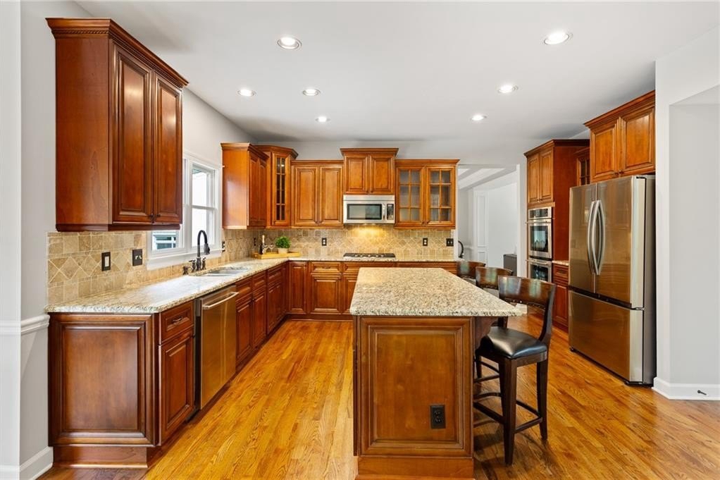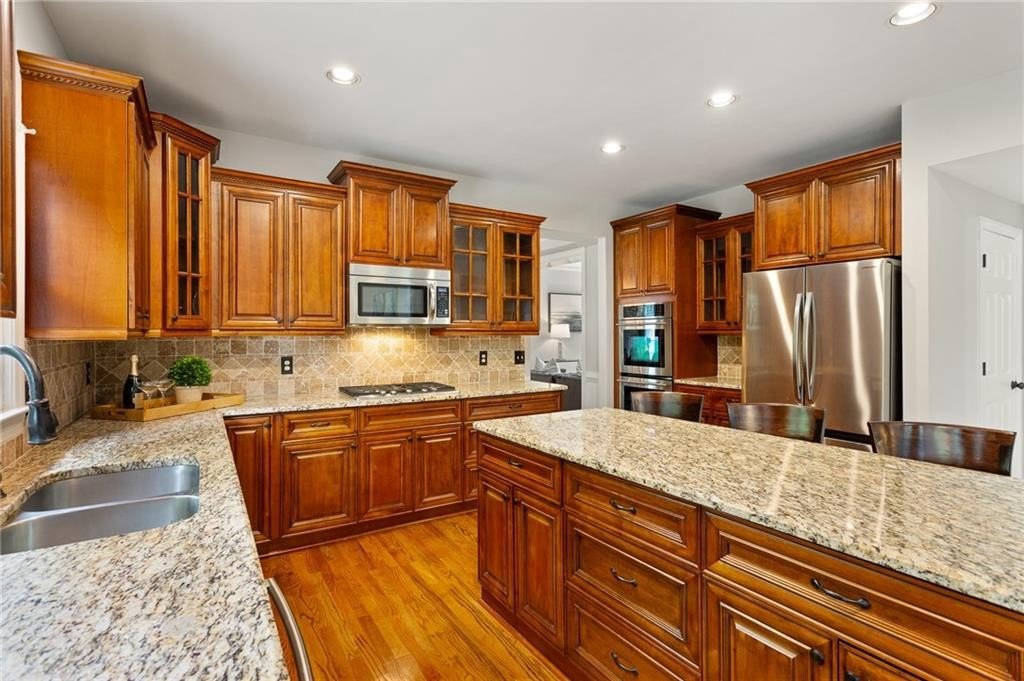 Welcome guests into the grand, two-level entry foyer where gleaming solid oak hardwoods lead to a spacious main level ideal for entertaining. Host guests in the bright open concept kitchen/breakfast/family room where custom under-lit 42-inch cabinetry offer ample storage. For the chef of the house, enjoy the stainless gas cooktop, double oven, microwave, dishwasher, and brand new french door refrigerator/freezer. The generous kitchen island offers seating for three while the bright, bay window-lit breakfast nook offers views of the tranquil back yard and access to the expansive rear deck. With its grand cathedral ceilings, marble surround fireplace, and two levels of windows, the open and airy family room affords ample room for hearthside conversation. Create timeless memories serving meals in the formal dining room with seating for 8 while the foyer-adjacent formal living room offers sanctuary for holiday memories or restful reflection. Opposite the foyer from the living room, beautiful French doors lead to a fantastic home office or reading room. A convenient mud room with stackable front-load washer/dryer and custom storage leads to the two car garage with sink and workshop space.