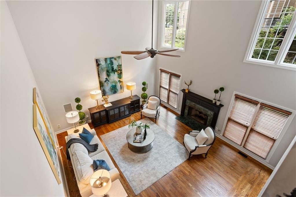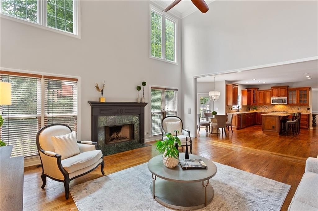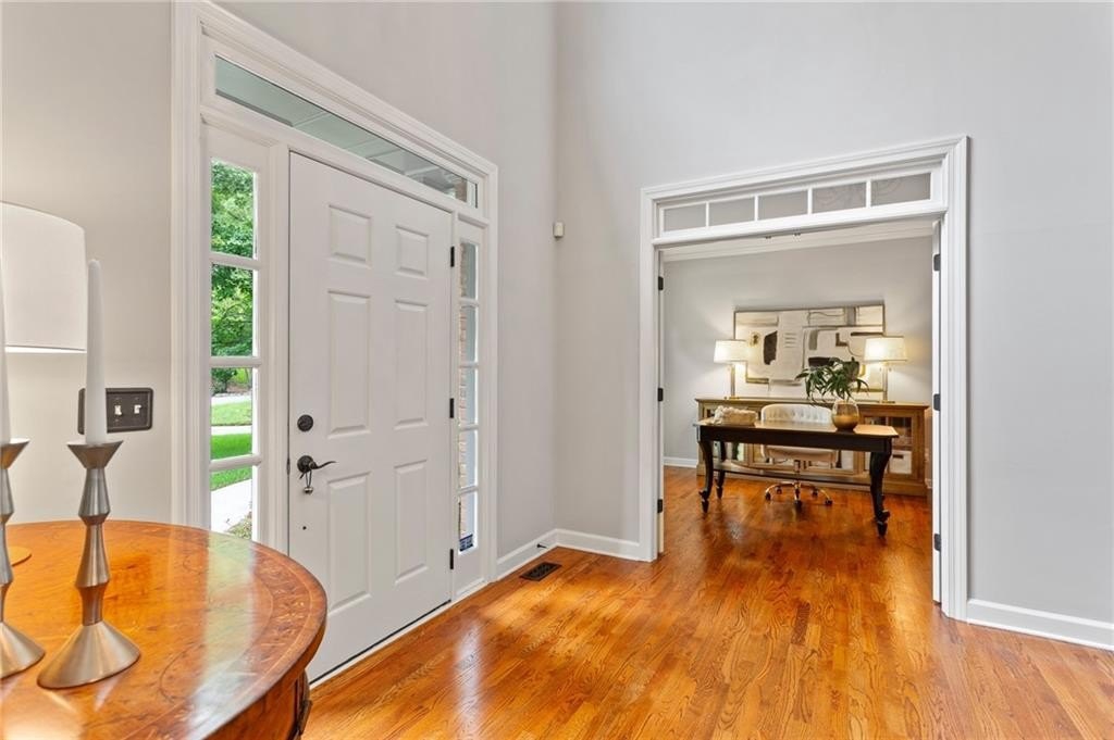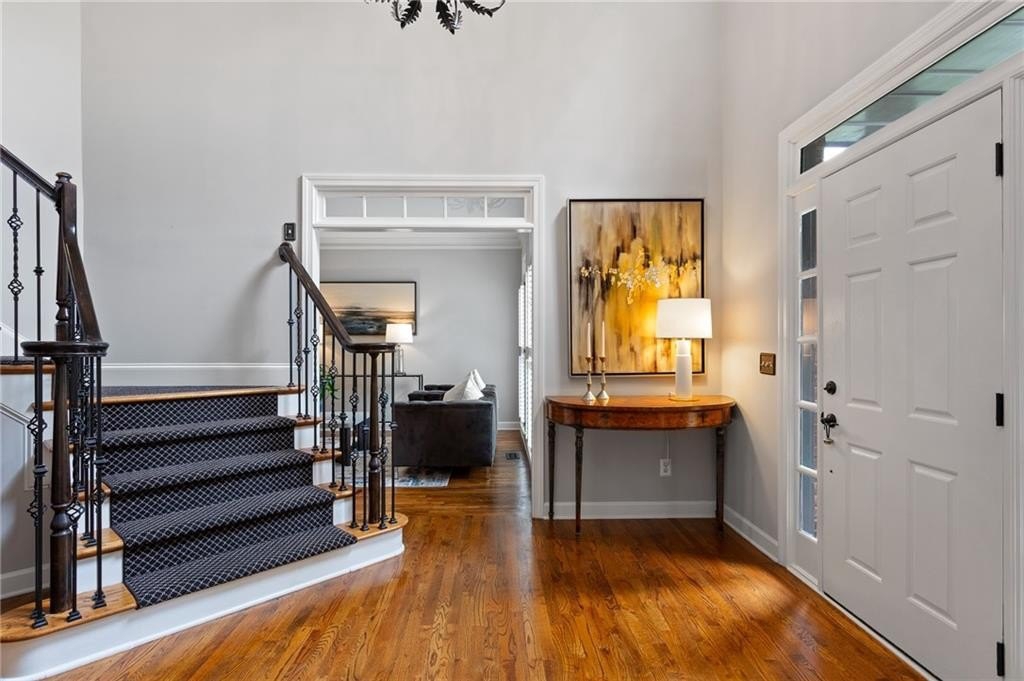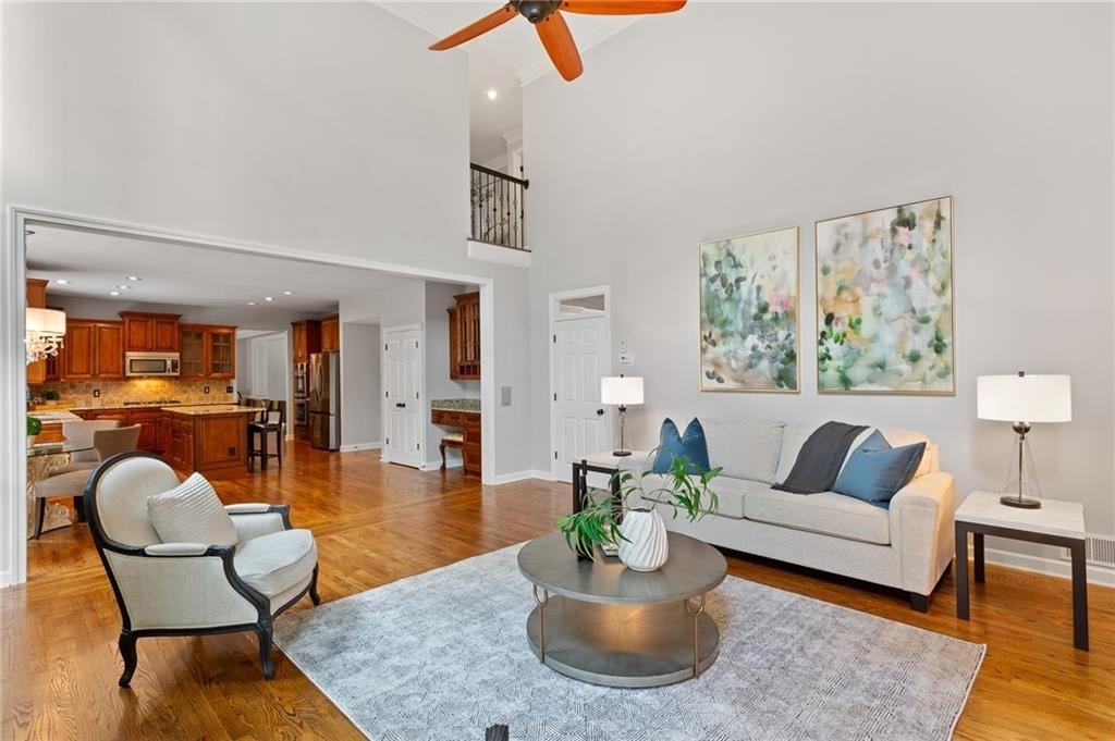 Welcome guests into the grand, two-level entry foyer where gleaming solid oak hardwoods lead to a spacious main level ideal for entertaining. Host guests in the bright open concept kitchen/breakfast/family room where custom under-lit 42-inch cabinetry offer ample storage. For the chef of the house, enjoy the stainless gas cooktop, double oven, microwave, dishwasher, and brand new french door refrigerator/freezer. The generous kitchen island offers seating for three while the bright, bay window-lit breakfast nook offers views of the tranquil back yard and access to the expansive rear deck. With its grand cathedral ceilings, marble surround fireplace, and two levels of windows, the open and airy family room affords ample room for hearthside conversation. Create timeless memories serving meals in the formal dining room with seating for 8 while the foyer-adjacent formal living room offers sanctuary for holiday memories or restful reflection. Opposite the foyer from the living room, beautiful French doors lead to a fantastic home office or reading room. A convenient mud room with stackable front-load washer/dryer and custom storage leads to the two car garage with sink and workshop space.