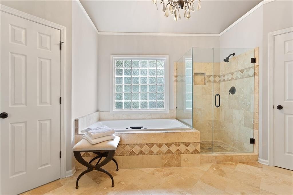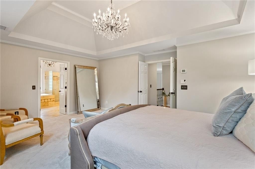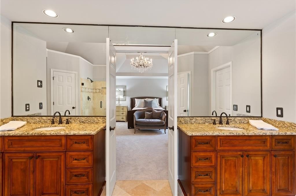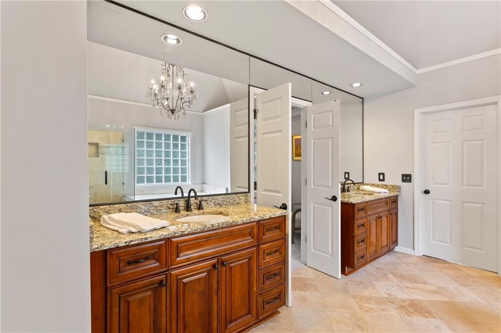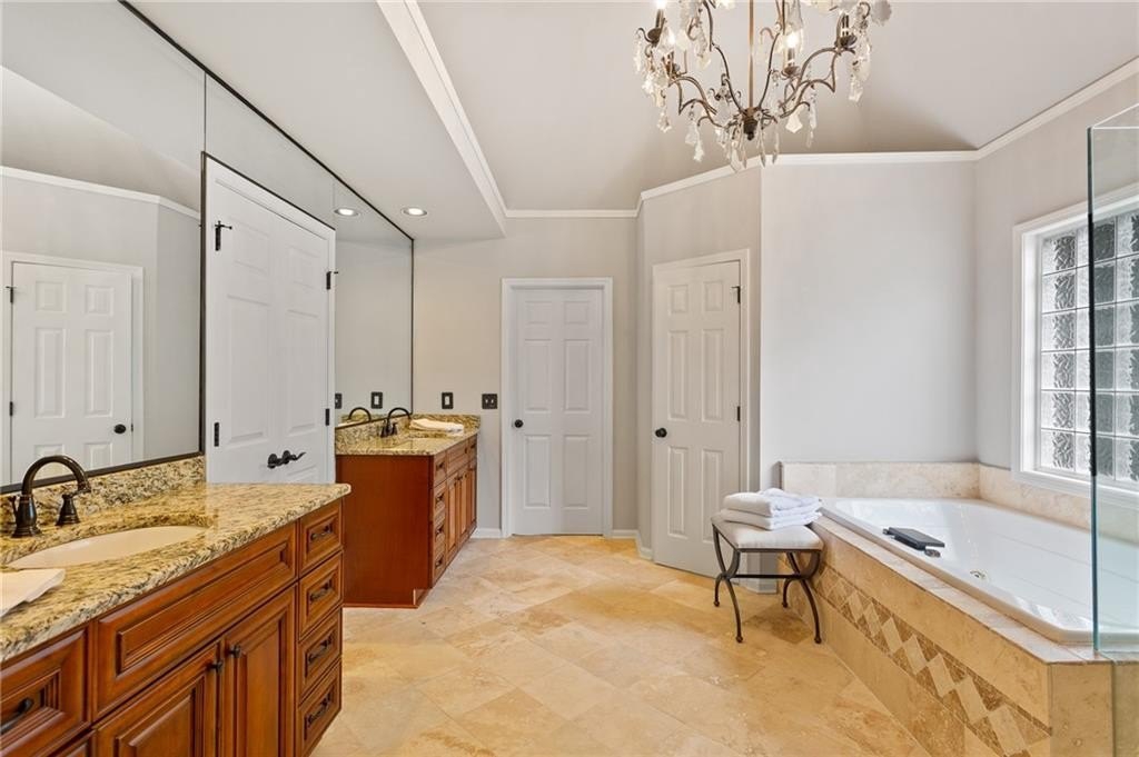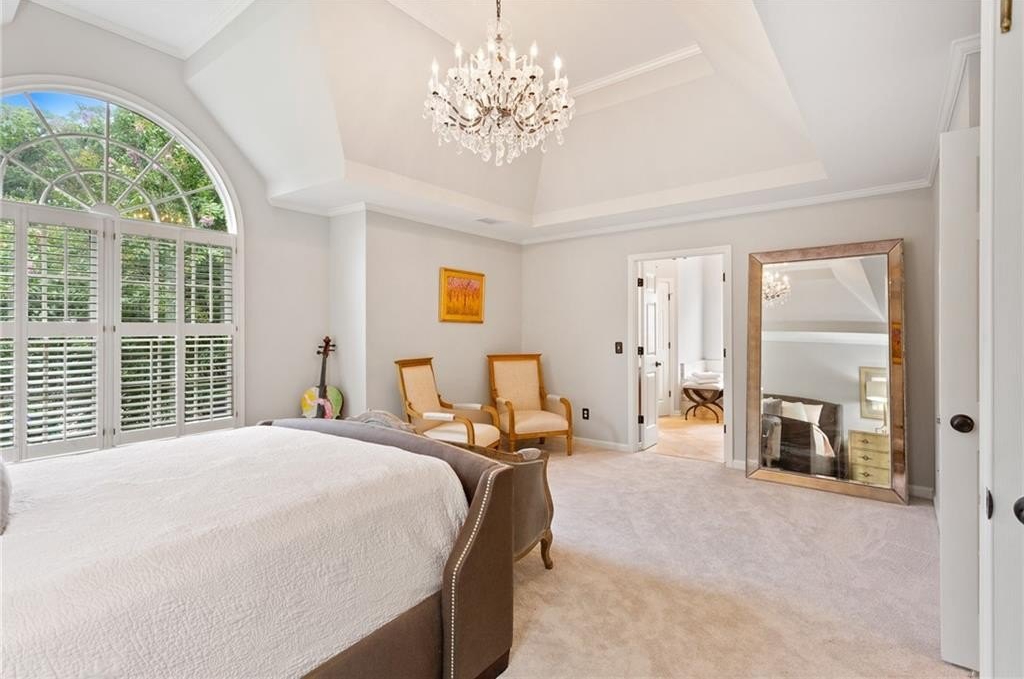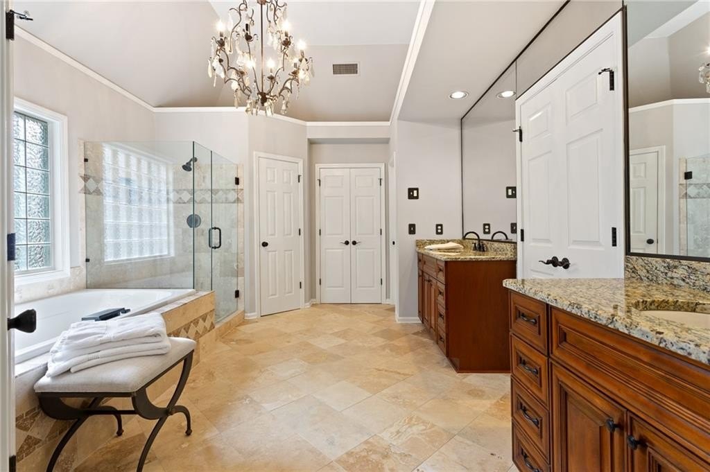Retire to the oversized second-level owners suite with its extra-high tray ceiling and beautiful palladium window. French doors open to a primary bath that is sure to calm with separate jetted soaking tub and shower with frameless glass surround, separate vanities, and private water closet. Three walk in closets offer convenient storage for off-season couture. Guests can enjoy the comfort of their own ensuite bathroom and walk in closet while the Jack and Jill suite offers a privatized toilet and shower room flanked by separate, bedroom-adjacent vanities.