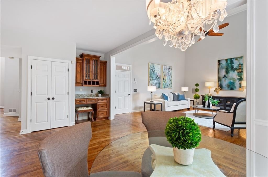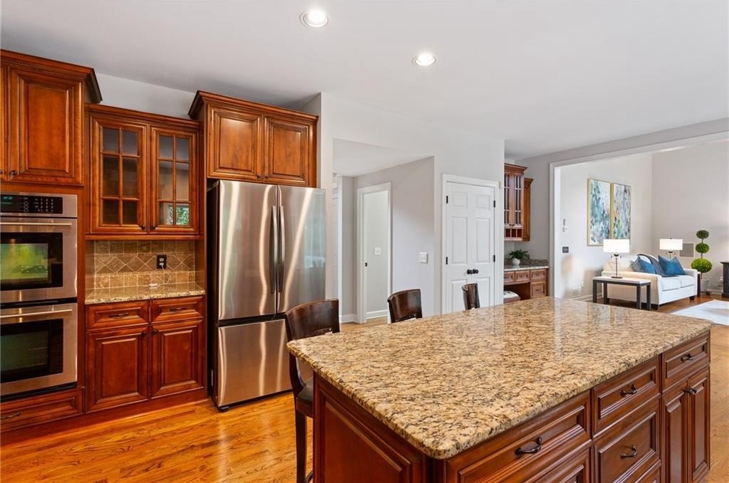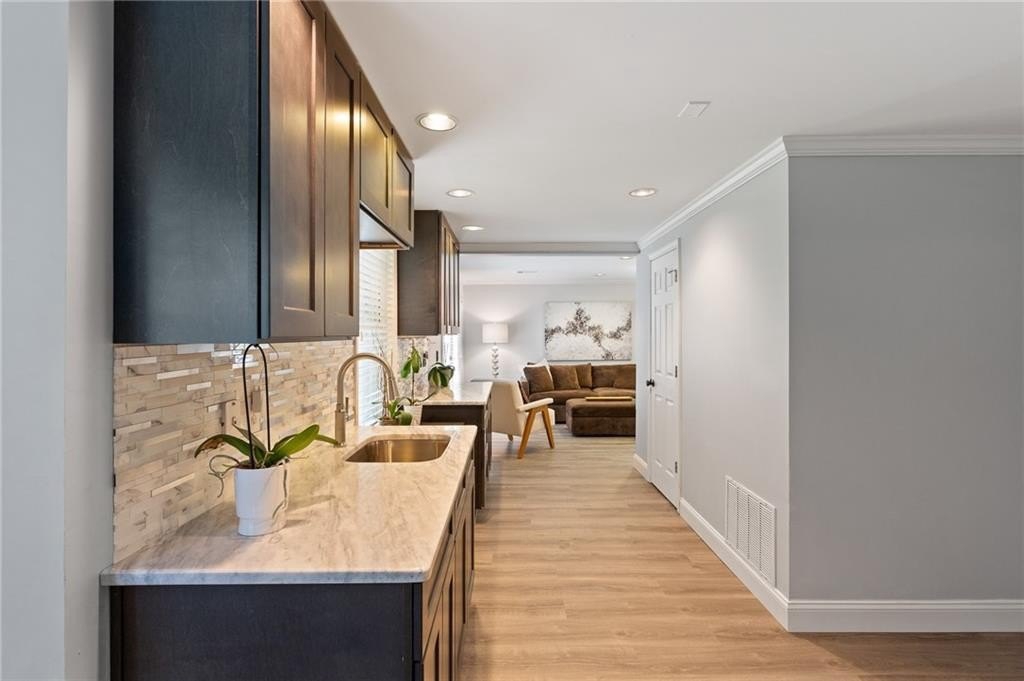 Expecting extended stay visitors? The expansive day-lit and walk-out terrace level boasts over 1,800 square feet of living space with new LVP flooring, kitchenette/serving area with sink, new shaker cabinetry, marble countertops, and designer backsplash, closet-hidden refrigerator/freezer, separate sleeping quarters with two large walk-in closets, a full bath, and additional flex space for storage, home theater, or gym.