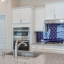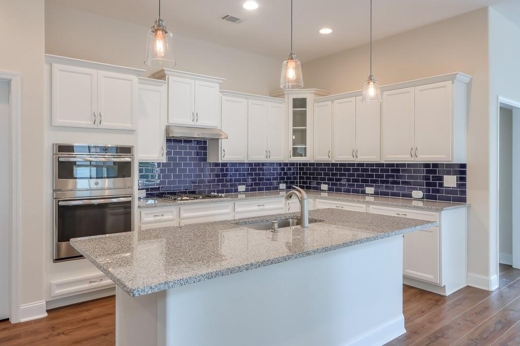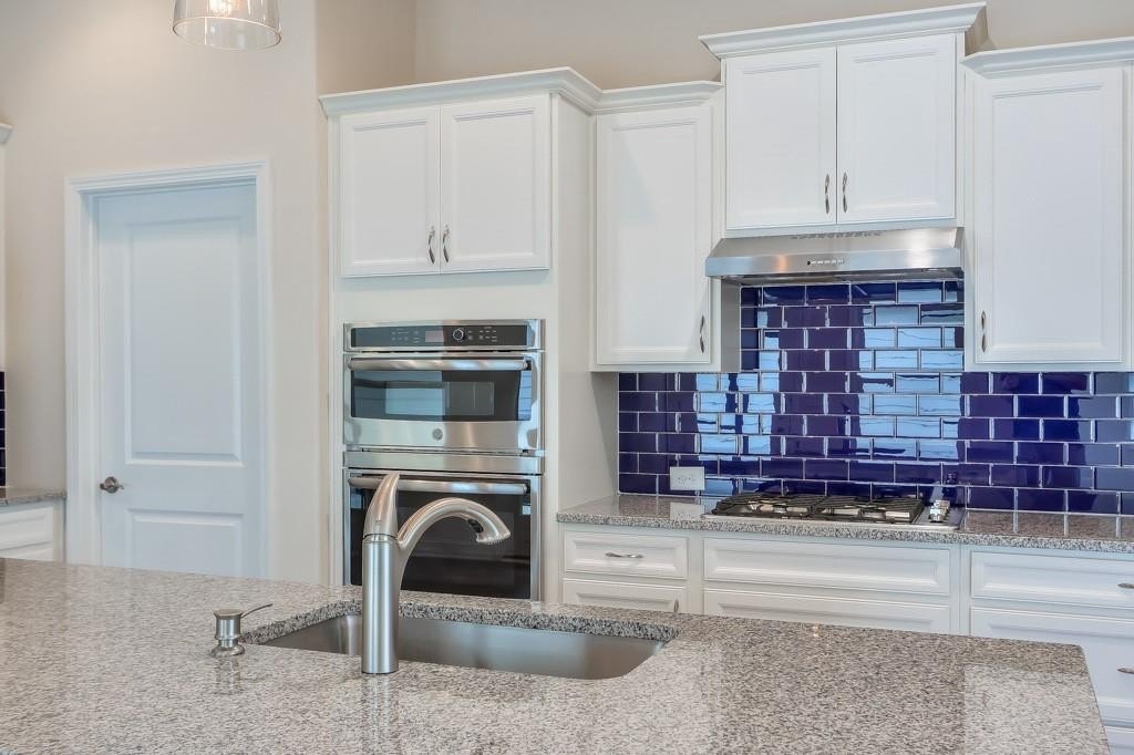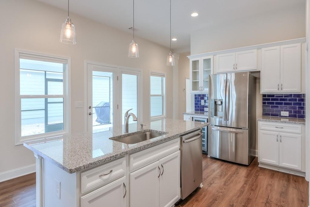 At the heart of the home, the show-stopping kitchen features crisp white cabinetry, a large island with seating, custom tile backsplash, stainless steel appliances, wine fridge, and an oversized walk-in pantry—making it as practical as it is beautiful.