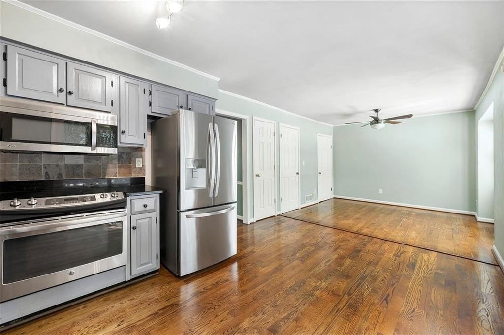 The kitchen features brand-new stainless steel appliances, granite countertops, custom tile backsplash, and hardwood floors, opening into a warm and inviting keeping room—ideal for relaxed mornings or entertaining guests. Step outside onto the newly installed private deck that overlooks a quiet, end street with extra parking.