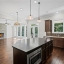 The main level offers a versatile layout ideal for multi-generational living, complete with two spacious bedrooms—perfect for guests, teens, in-laws, or a dedicated home office. Each bathroom showcases designer tilework, upgraded cabinetry, and elegant furniture-style vanities, creating a consistent high-end aesthetic. The expansive open-concept living area makes entertaining effortless, with a formal dining room flowing into a warm and inviting family room anchored by a floor-to-ceiling brick fireplace. A wall of windows with electric blinds bathes the space in natural light, while the chef’s kitchen stands as the heart of the home—featuring a large center island, quartz countertops, stainless steel appliances, double ovens, undercabinet lighting, and extensive upgraded cabinetry.