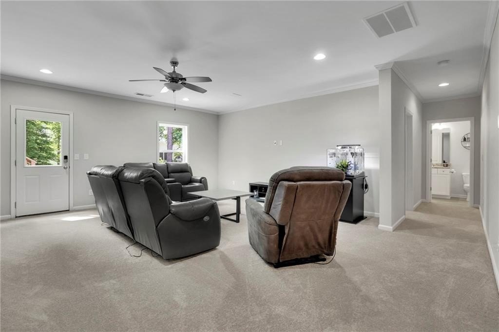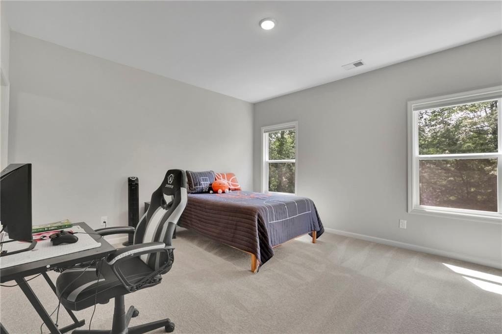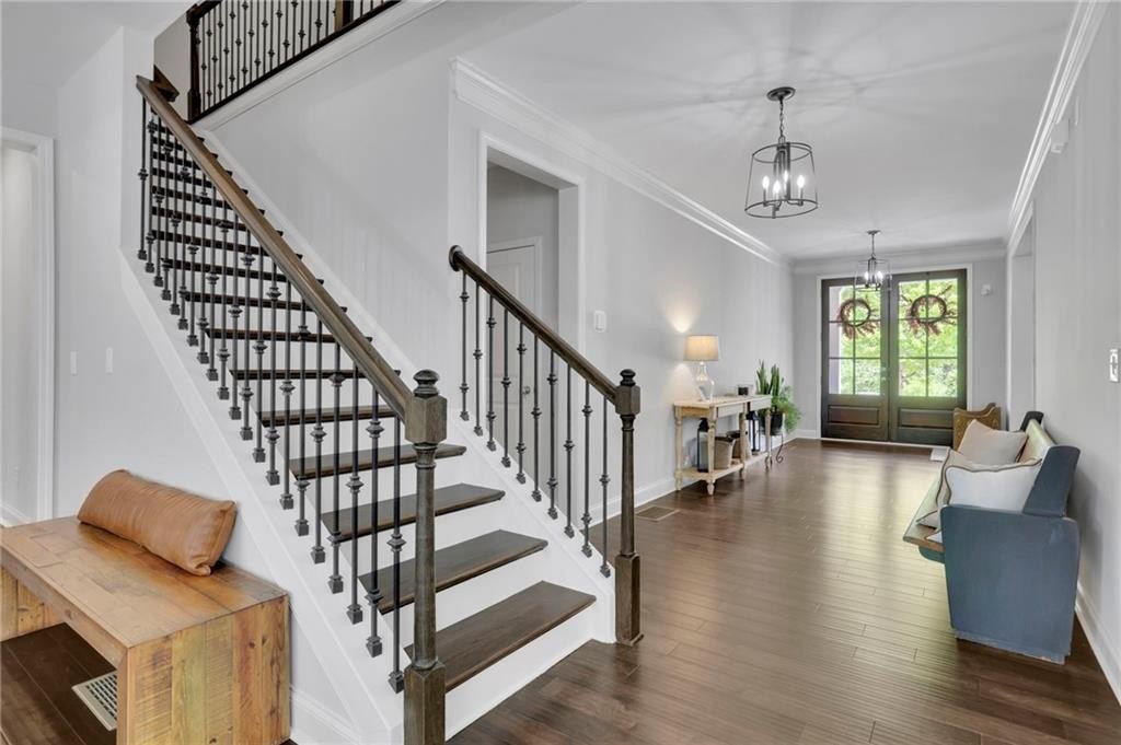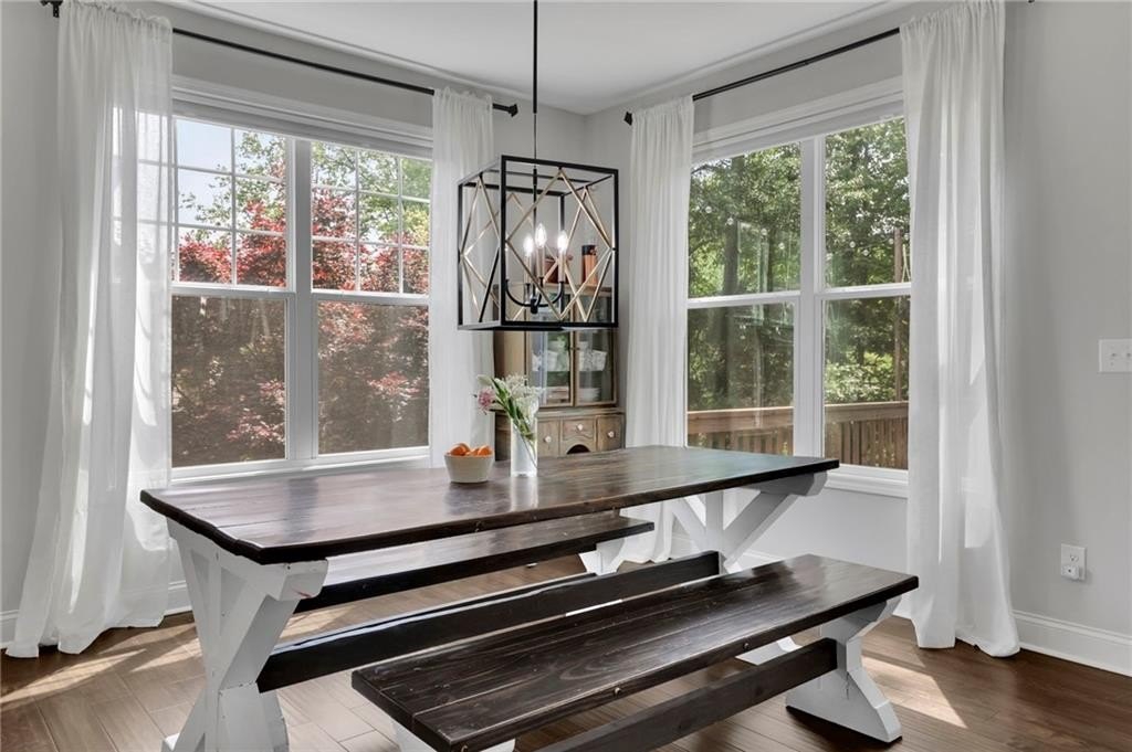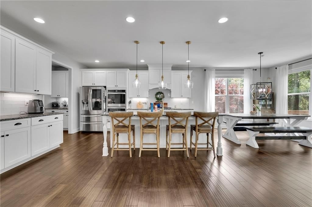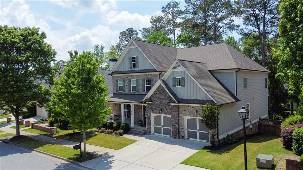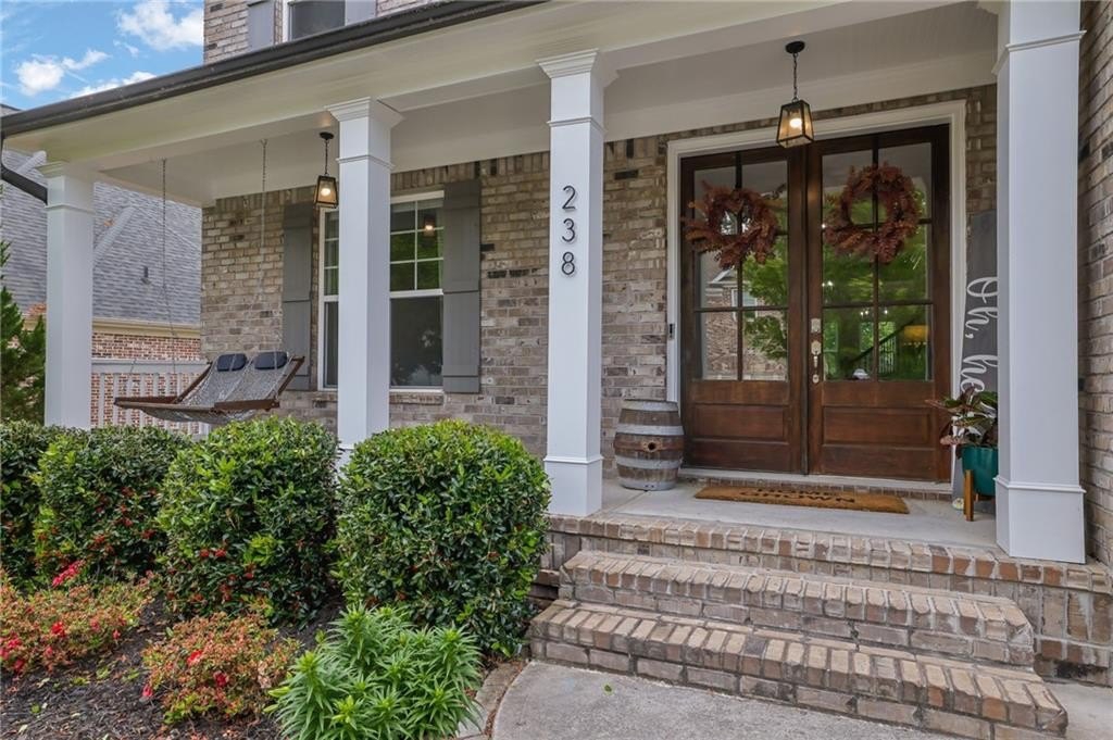 Welcome to 238 Harmony Lake Drive, a stunning five-bedroom, four full bath single-family home in charming Canton, GA. The expansive front porch awaits your rocking chairs or swing to relish peaceful evenings in this friendly community. Designed with entertainment and flow in mind, this exquisite property boasts a grand entrance through elegant double wood doors, inviting you into an atmosphere of sophistication and warmth.
