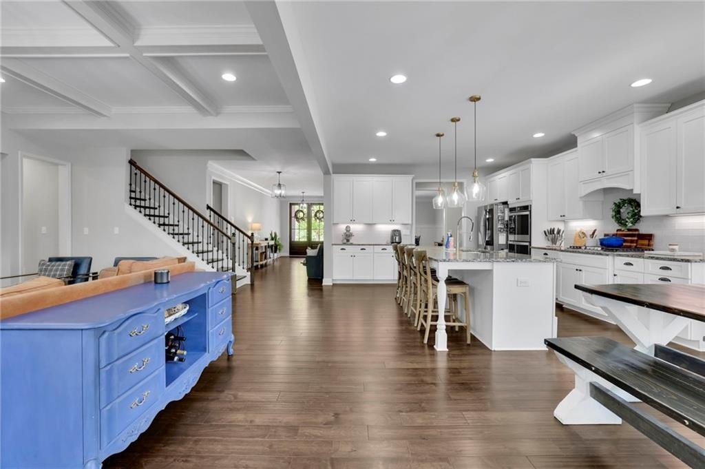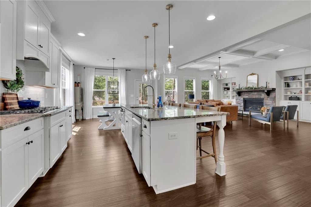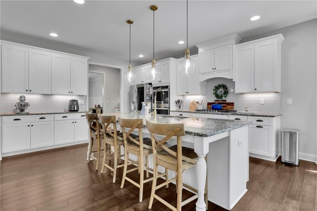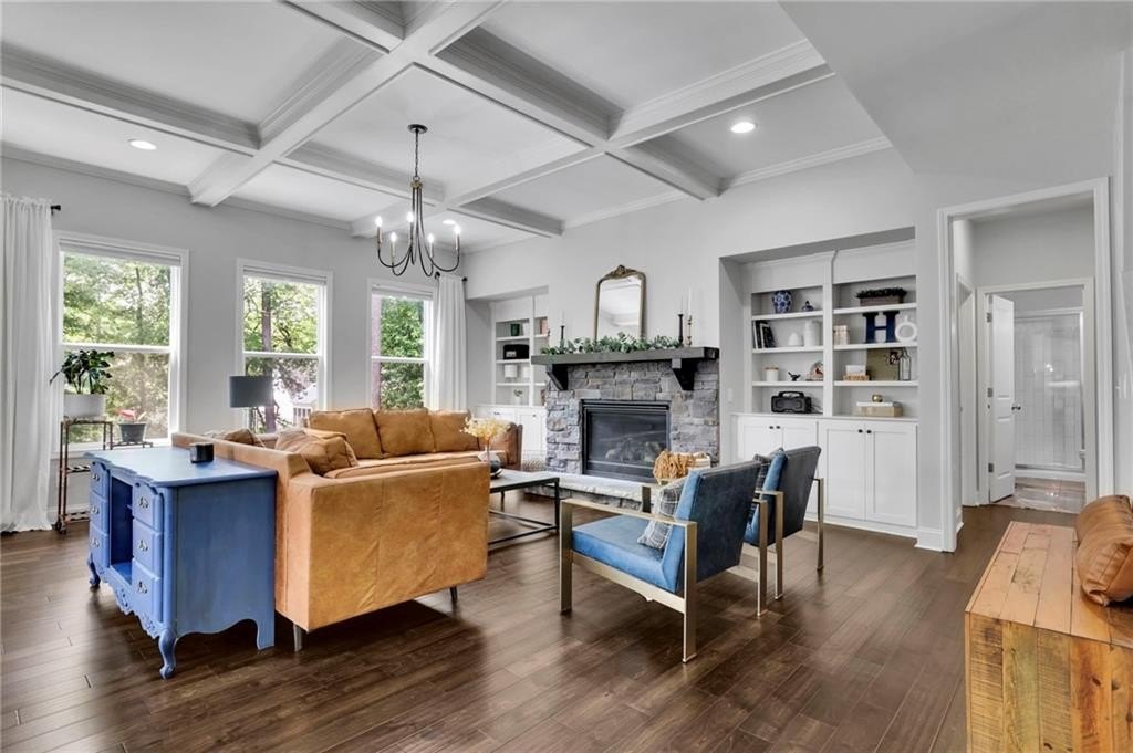Step inside to discover the luxurious hardwood floors throughout and an abundance of natural light that truly enhances the wide-open floor plan. Entertain with ease in the spacious dining room, complemented by a butler’s pantry and a large walk-in kitchen pantry for all your storage needs. The gourmet kitchen is a chef's delight, featuring a sizable island with bar seating, granite countertops, custom cabinets, stainless steel appliances, and a stylish subway tile backsplash. Just beyond the kitchen, the coffered-ceiling great room invites relaxation with custom built-ins, wall of windows, and a striking stacked stone fireplace, creating an effortless flow for everyday living and entertaining. A separate main-floor office offers the perfect work-from-home retreat, while a conveniently located mudroom helps keep daily life organized and clutter-free.
