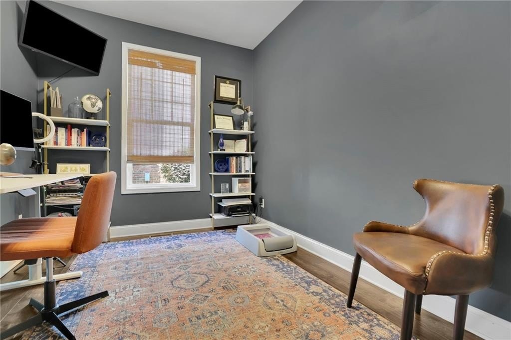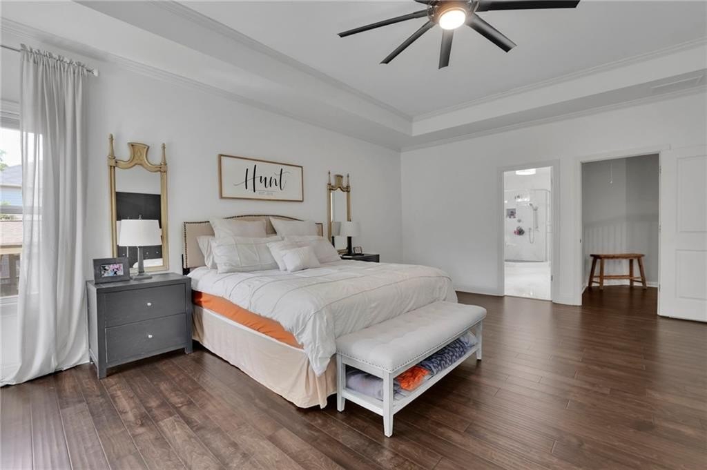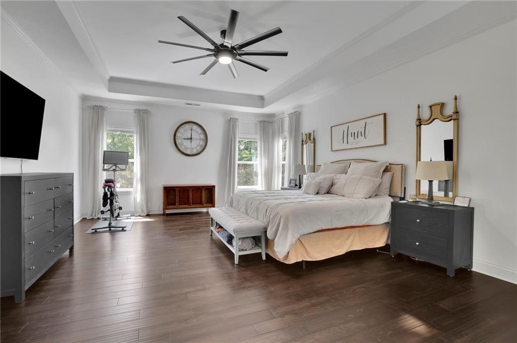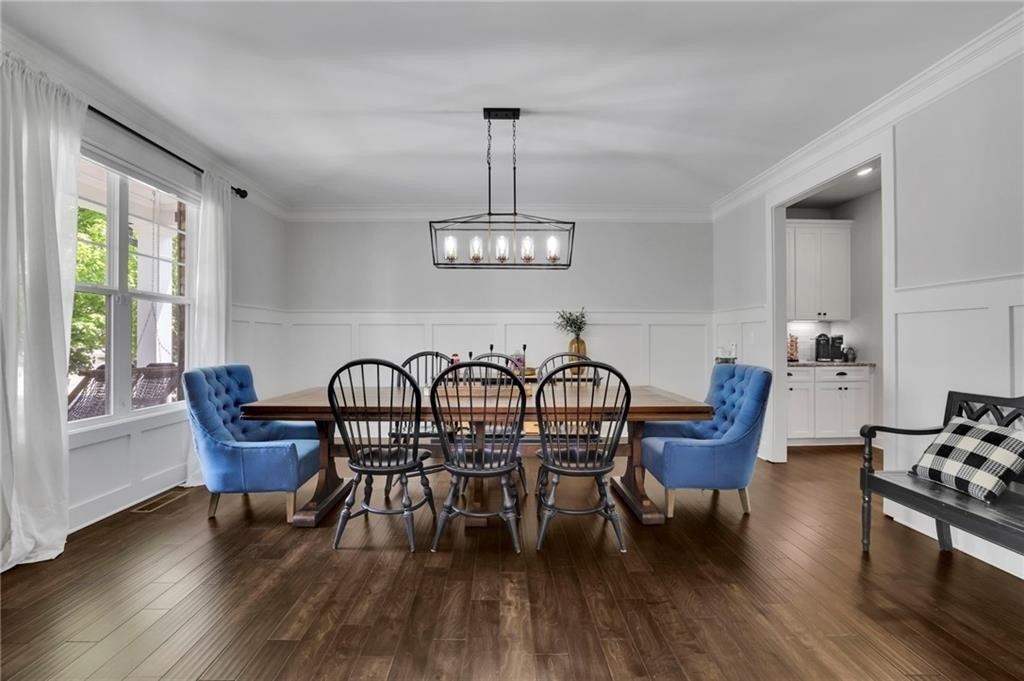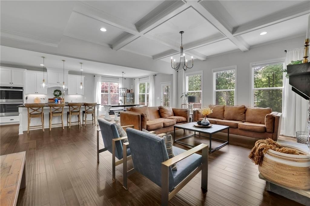 Step inside to discover the luxurious hardwood floors throughout and an abundance of natural light that truly enhances the wide-open floor plan. Entertain with ease in the spacious dining room, complemented by a butler’s pantry and a large walk-in kitchen pantry for all your storage needs. The gourmet kitchen is a chef's delight, featuring a sizable island with bar seating, granite countertops, custom cabinets, stainless steel appliances, and a stylish subway tile backsplash. Just beyond the kitchen, the coffered-ceiling great room invites relaxation with custom built-ins, wall of windows, and a striking stacked stone fireplace, creating an effortless flow for everyday living and entertaining. A separate main-floor office offers the perfect work-from-home retreat, while a conveniently located mudroom helps keep daily life organized and clutter-free.
