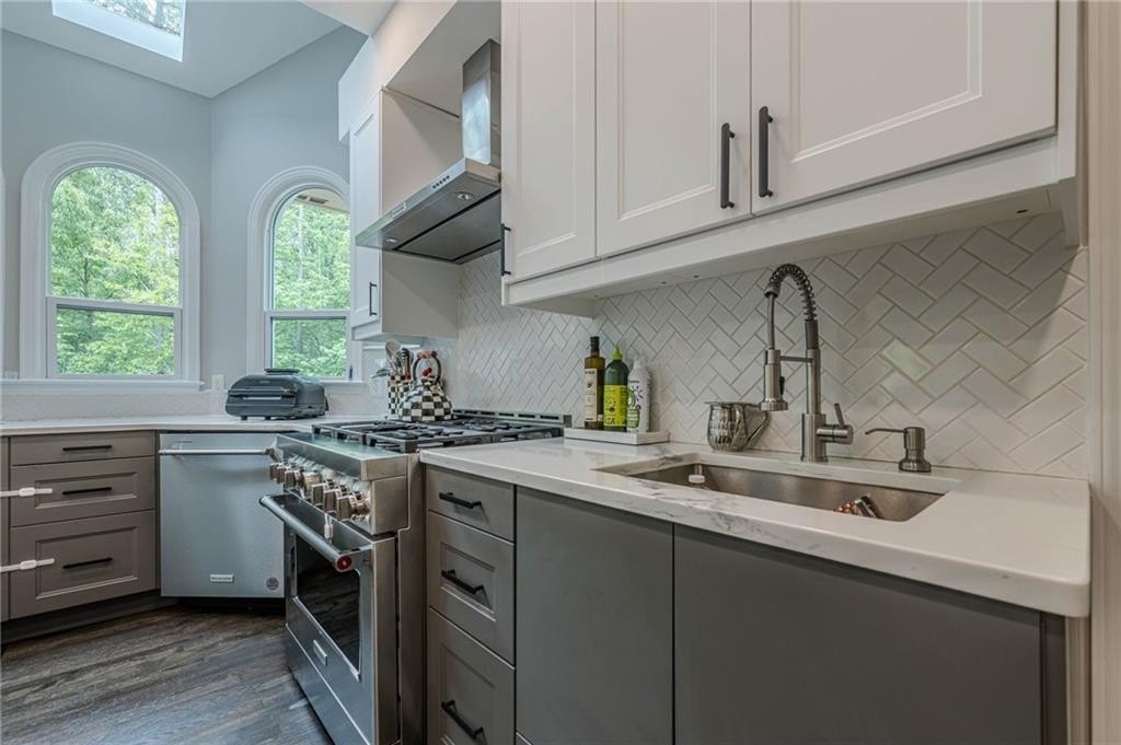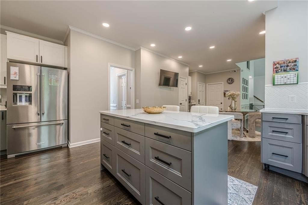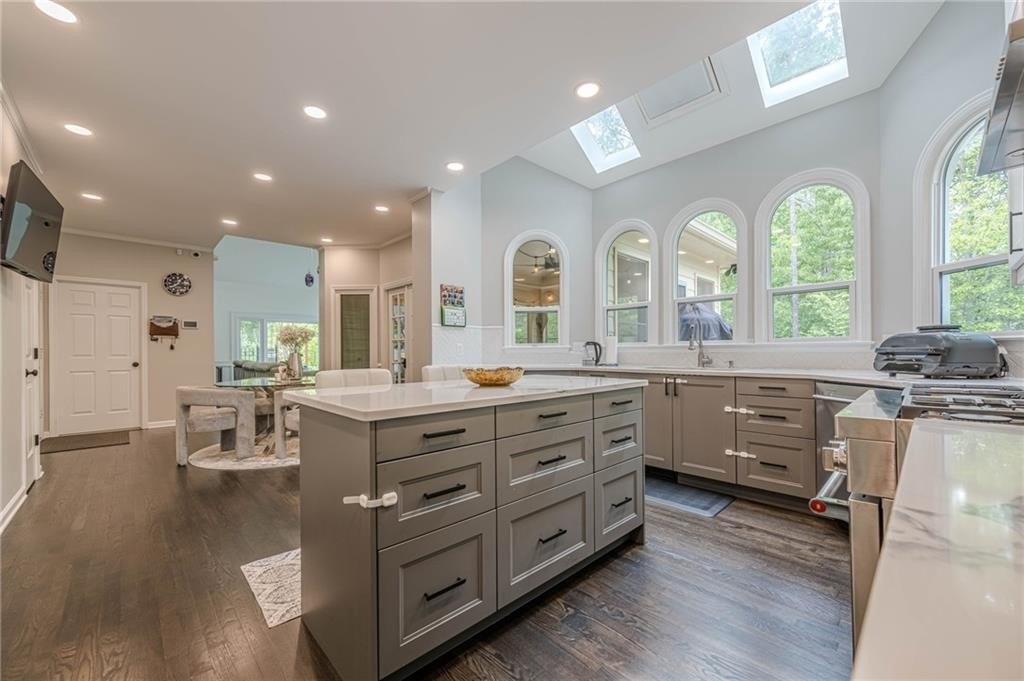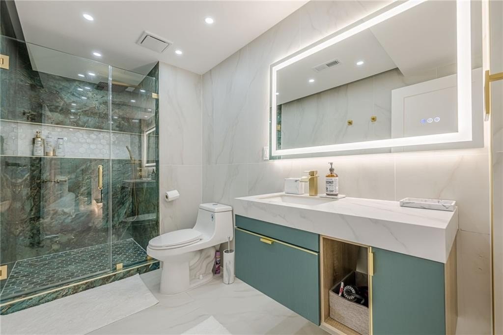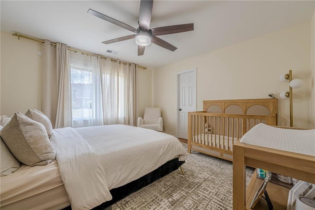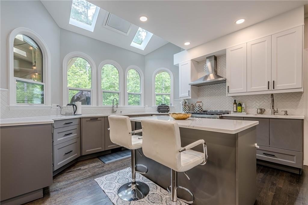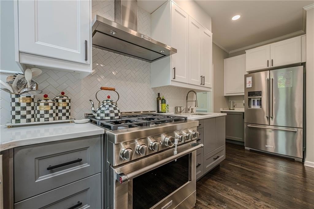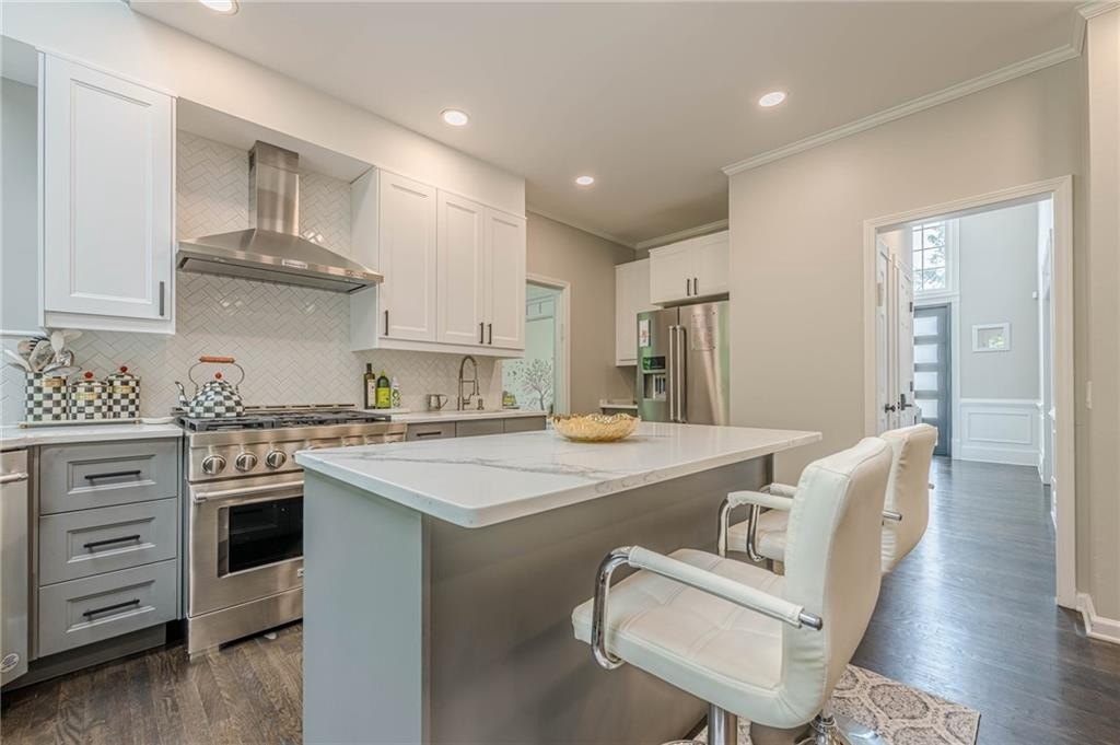 The heart of the home is the chef-inspired kitchen, featuring sleek new soft-close cabinets, elegant quartz countertops, and high-end stainless steel KitchenAid appliances, including a 36" gas convection oven and an exterior venting range hood. Smart home technology is seamlessly integrated with Kasa smart switches for effortless lighting control, motion sensor and remote-controlled hallway lighting, new Hunter ceiling fans in every room, and smart locks for enhanced security. The striking new iron front door and garage door, complete with a smart motor, elevate the home's curb appeal and functionality. Enjoy year-round comfort and safety with Nest thermostats and smoke detectors.