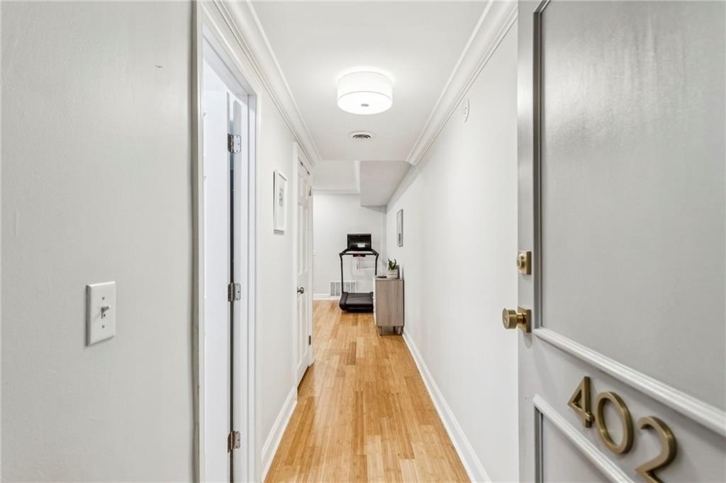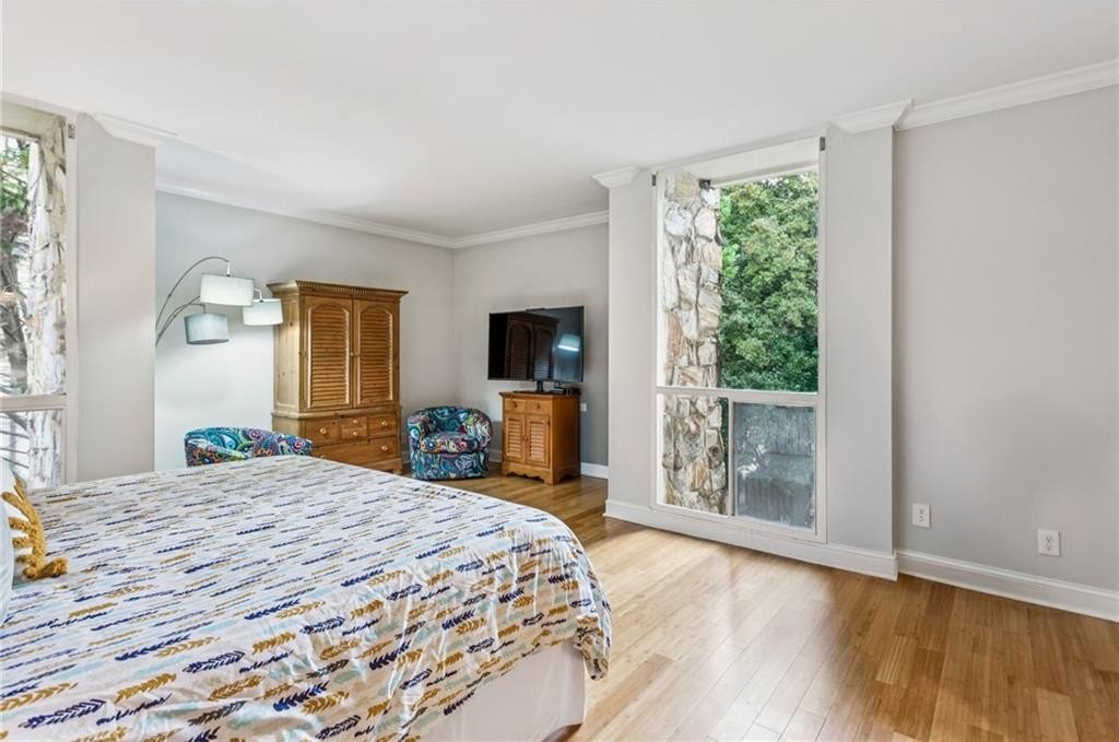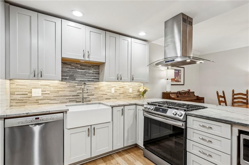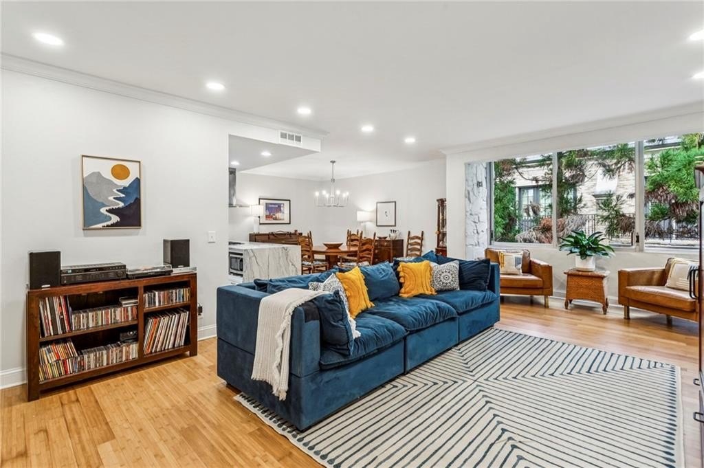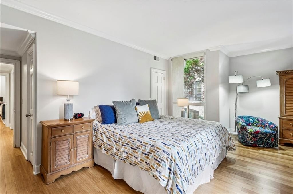 This thoughtfully updated condominium offers a polished, airy atmosphere with a layout that balances openness and privacy. The view from this 4th-floor unit is of a beautiful courtyard and the upscale townhomes next door. Sunlit bamboo floors stretch across the entire home, creating a smooth, seamless transition across the unit. Two spacious bedrooms and two contemporary bathrooms provide generous comfort, while a large, open living space plus the dining area and window nook create the perfect spot for work, hobbies, or quiet relaxation. The kitchen stands out with its stainless-steel appliances, custom cabinetry, and waterfall stone countertop - an inspiring space for everyday cooking or weekend hosting. The washer and dryer are in a built-in space in the kitchen. The primary suite is impressively sized, accommodating a king bed with ease and leaving room for a desk, reading corner, and two nicely sized closets, plus a linen closet. The guest suite is also generously sized with two closets. Set just a few steps from the elevator, this inviting residence combines comfort, elegance, and thoughtful upgrades, creating a home that feels both elevated and effortlessly livable.