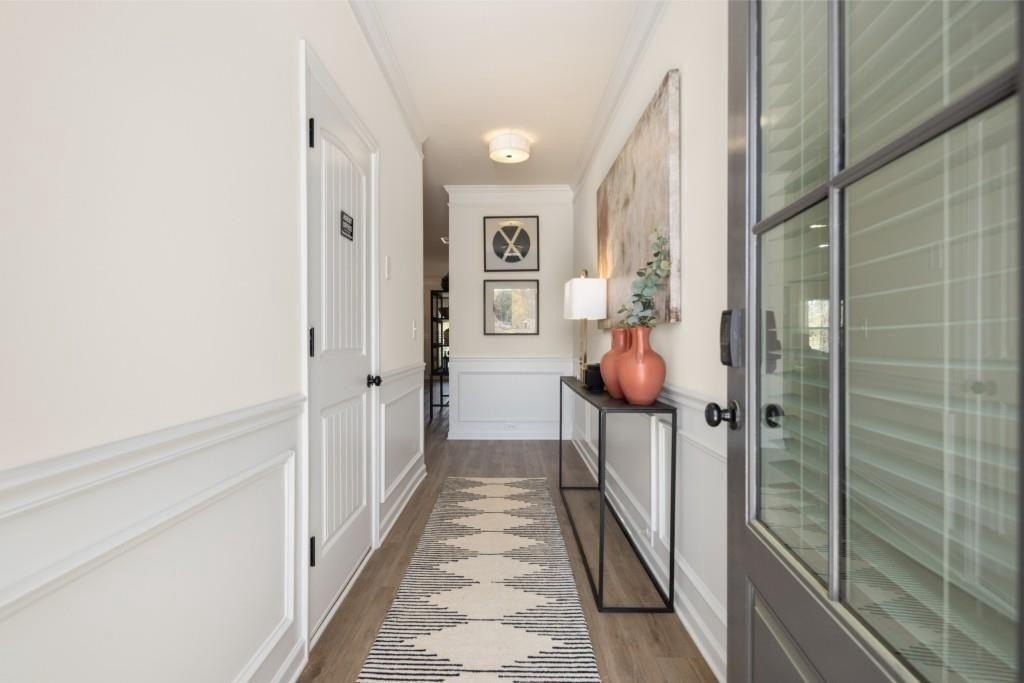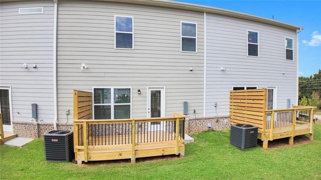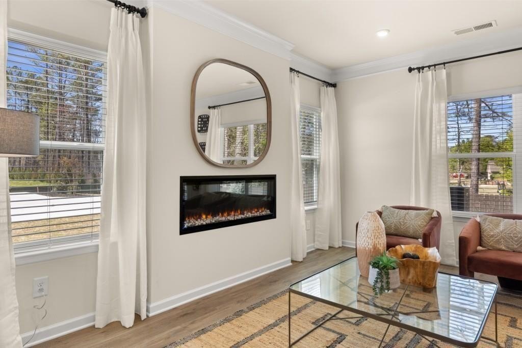 Move-in ready! The Ellison II located in the sought-after Franklin Manor community by Smith Douglas Homes, This townhome combines comfort, style, and thoughtful design. Take advantage of seller incentives when using the preferred lender, making this an exceptional opportunity. This popular floorplan is perfectly positioned for added privacy and abundant natural light, with designer upgrades throughout. The open-concept main level features a beautifully appointed kitchen with upgraded 42" cabinetry, granite countertops, stainless steel appliances, and a large center island with pendant lighting that comfortably seats four, ideal for everyday living and entertaining. The kitchen flows seamlessly into a bright, airy family room highlighted by large windows and a modern linear fireplace. Luxury vinyl plank flooring extends across the main level, offering both durability and modern style, while the deck provides the perfect space for outdoor relaxation or weekend get-togethers. Upstairs, unwind in the spacious Primary suite featuring a generous walk-in closet and a spa-inspired bath with a tiled shower and double vanity. Two additional bedrooms offer flexible space for guests, a home office, or family, and the convenient laundry room includes a washer and dryer for added ease. Window blinds are also included throughout the home. Both levels feature 9-foot ceilings, enhancing the open feel. Lawn maintenance, and our picturesque landscape is covered by the HOA, adding even more appeal to this low-maintenance community. Furnished photos are representative of the floorplan only. Don't miss this fantastic opportunity to make this home yours-schedule your private tour today!