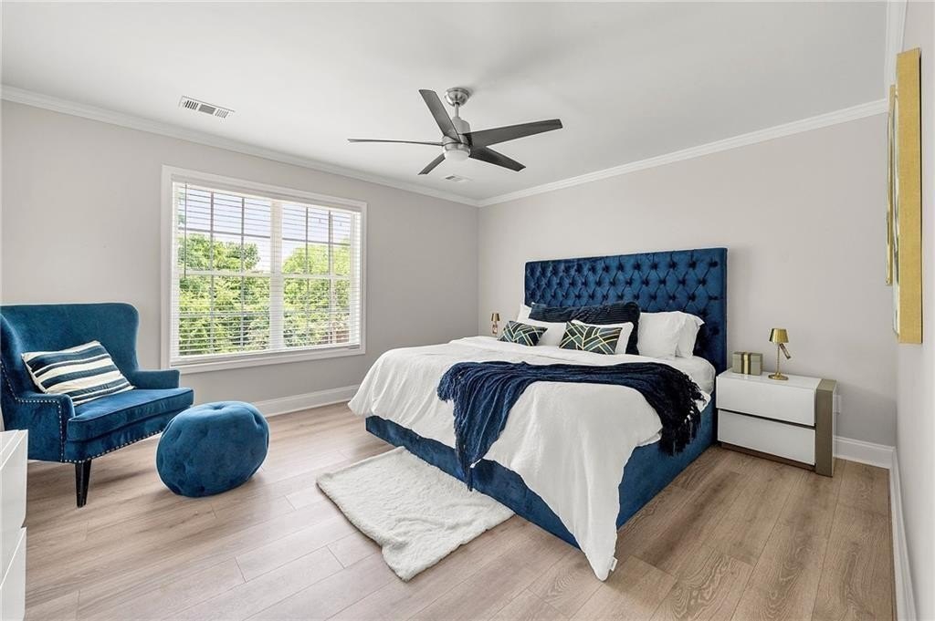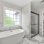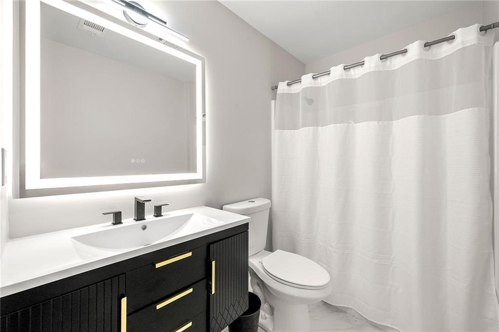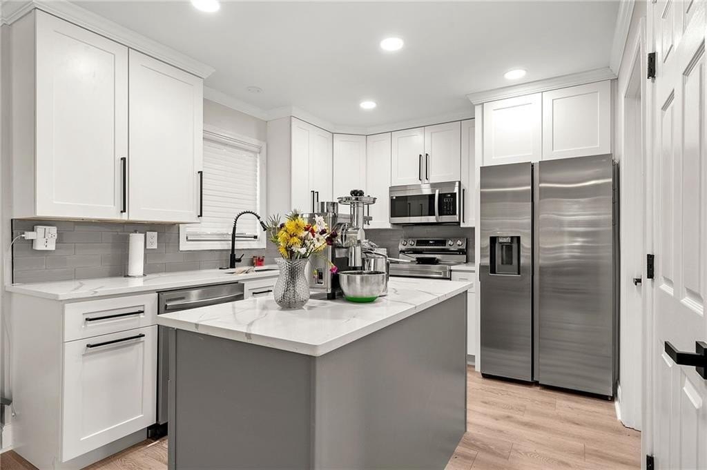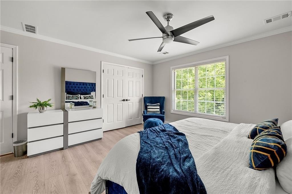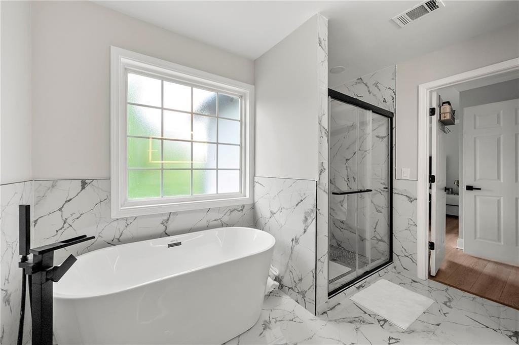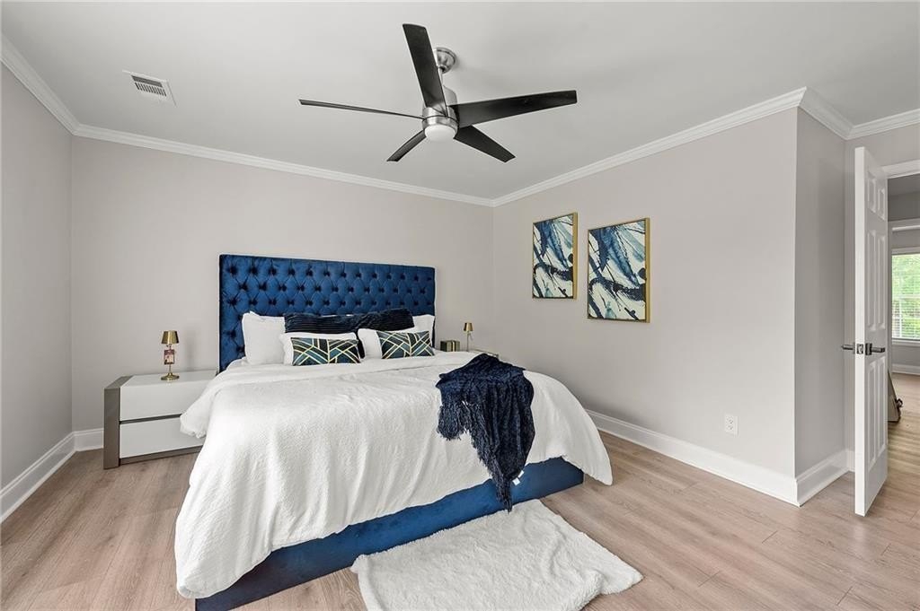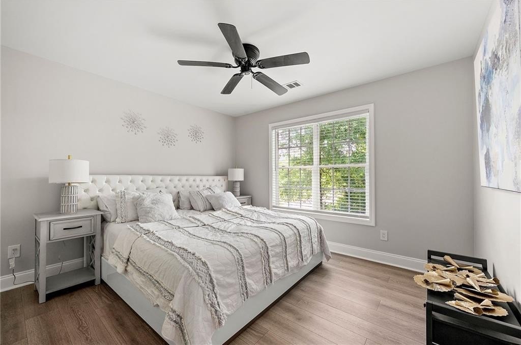 Upstairs, the oversized owner’s suite offers abundant natural light, a walk-in closet with built-in organizers, and a spa-like bathroom with a freestanding tub, tiled walls, double vanities, and backlit mirrors. Two additional bedrooms share a spacious updated bathroom. Every detail has been thoughtfully updated, including new drywall, doors, trim, luxury vinyl flooring, multi-zoned HVAC, new plumbing and electrical finishes, and modern fixtures throughout. The home also features an alarm system and exterior security cameras built into the lighting.