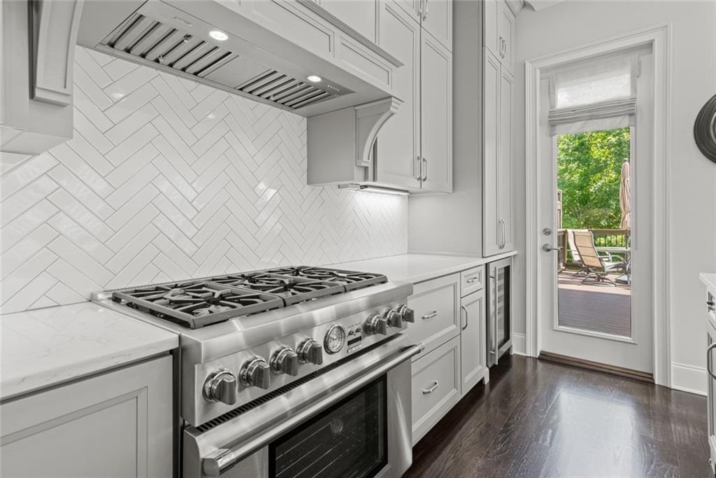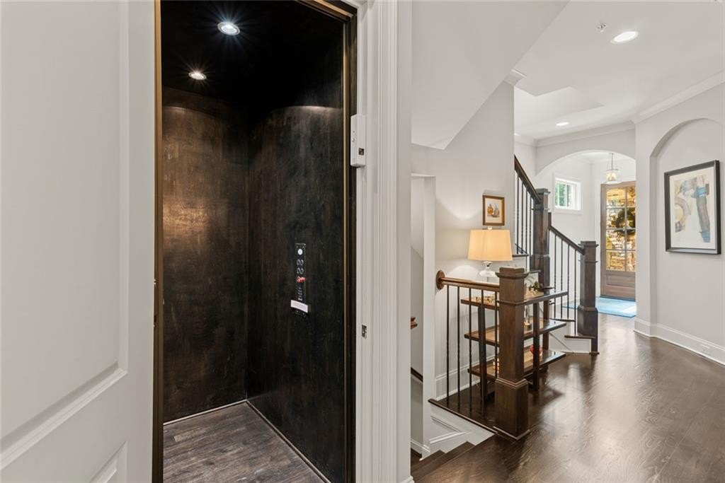 Inside, a private elevator seamlessly connects all four levels, while a two-step entry from the garage leads into the heart of the home. The main level showcases a chef’s kitchen with Thermador appliances, a warming drawer, double-stacked soft-close cabinetry with integrated organization, a walk-in pantry, wine cooler, and an oversized breakfast bar. This level also offers a formal dining room, powder bath, drop zone, and coat closet. The layout flows to a generously sized deck, perfect for entertaining or relaxing outdoors.