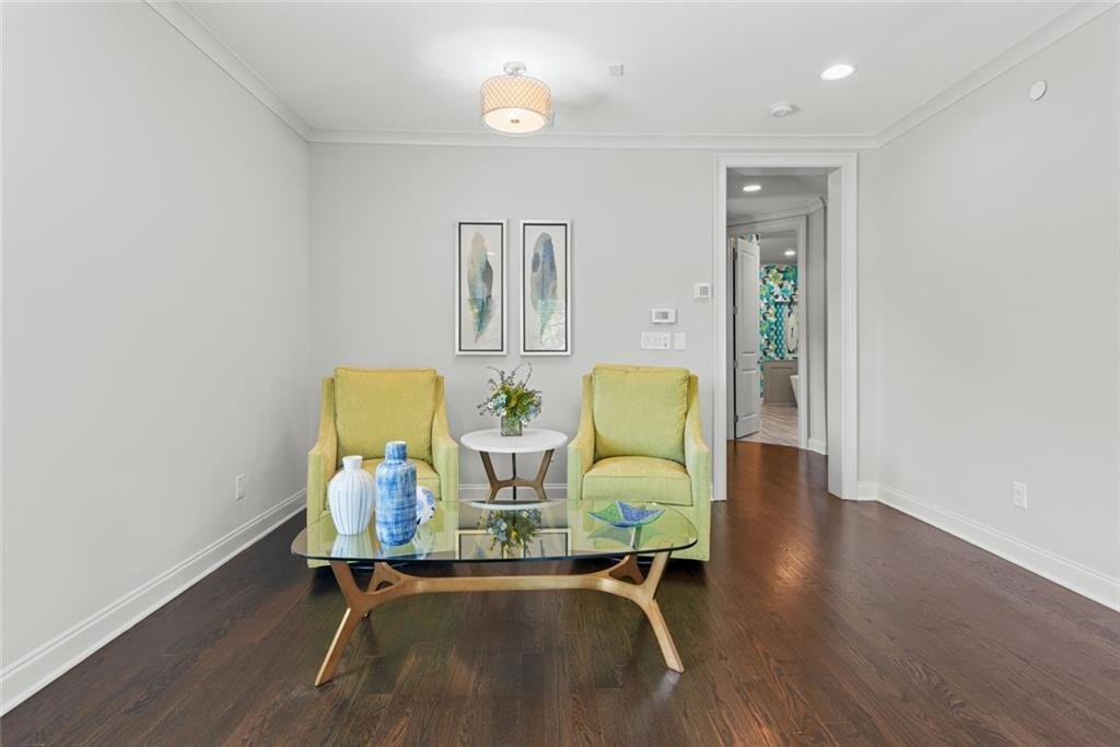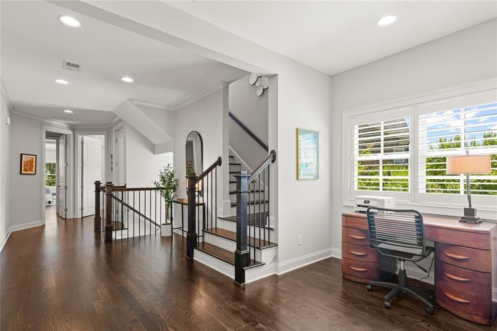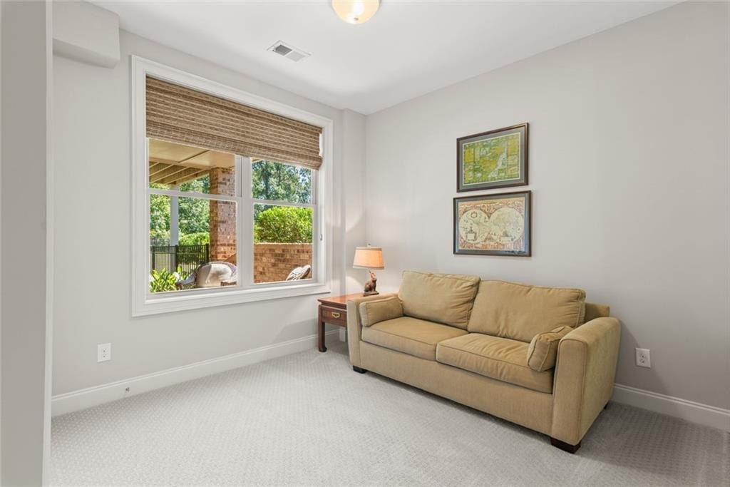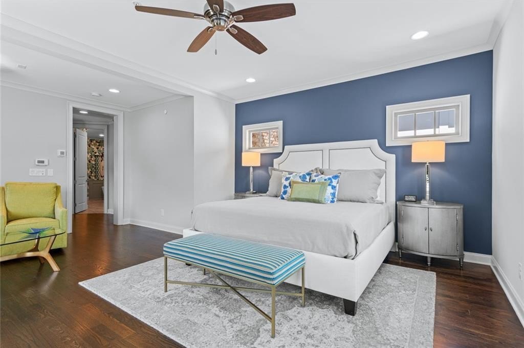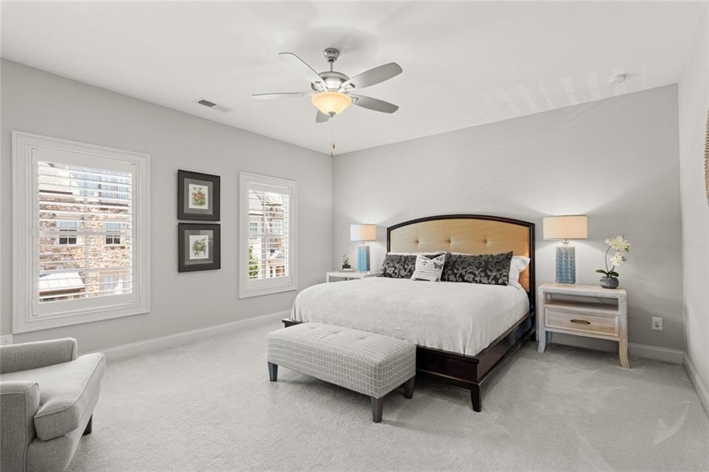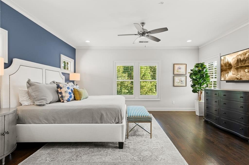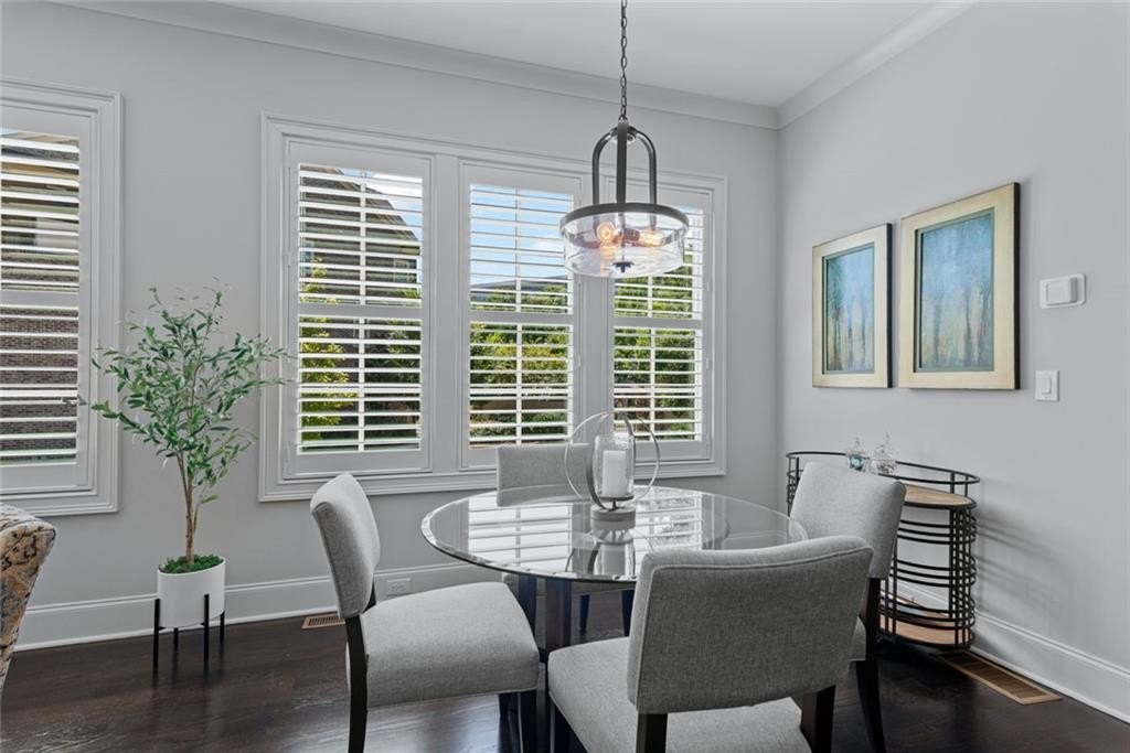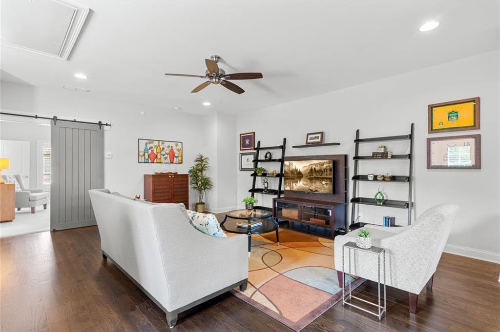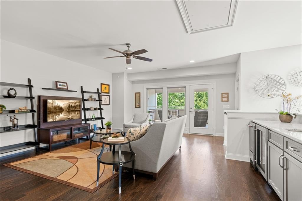 Positioned on one of the community’s largest end-unit lots, the home backs to lush woodlands with private trail access to Cochran Shoals and the Chattahoochee River.