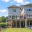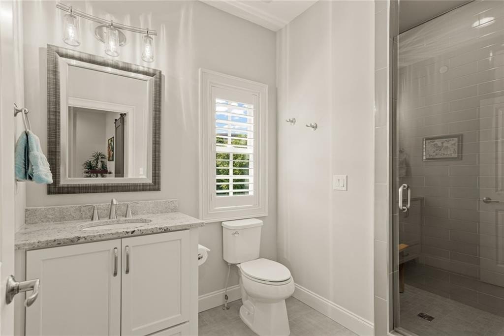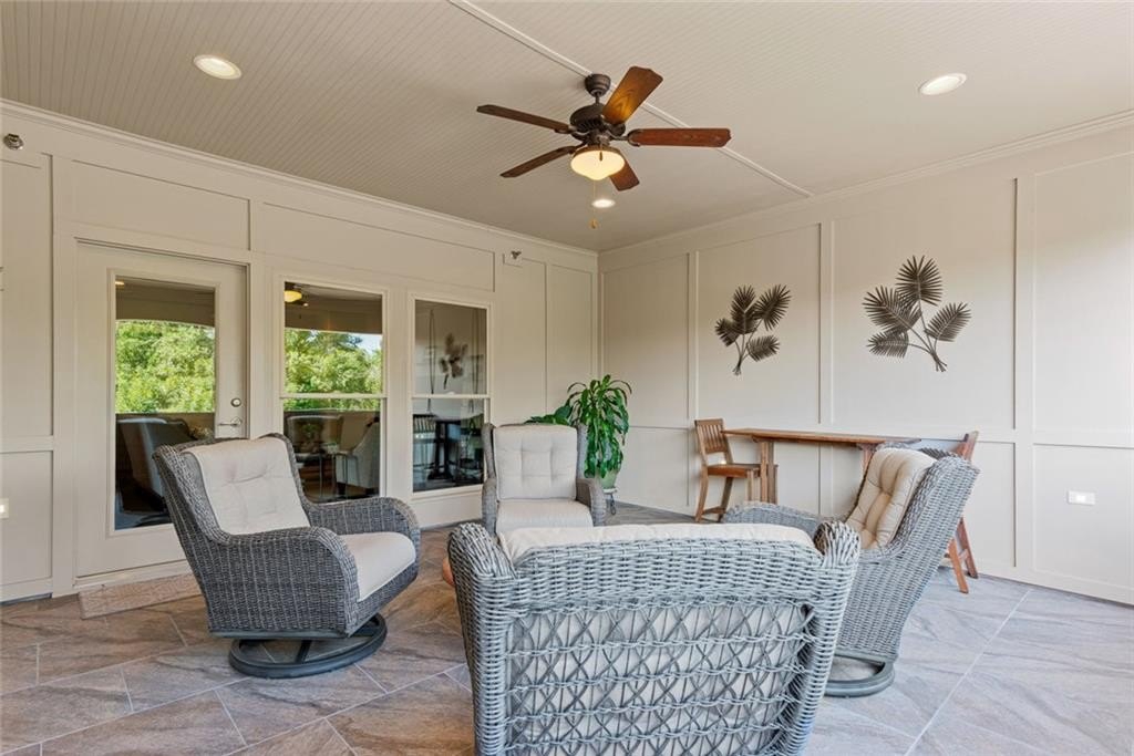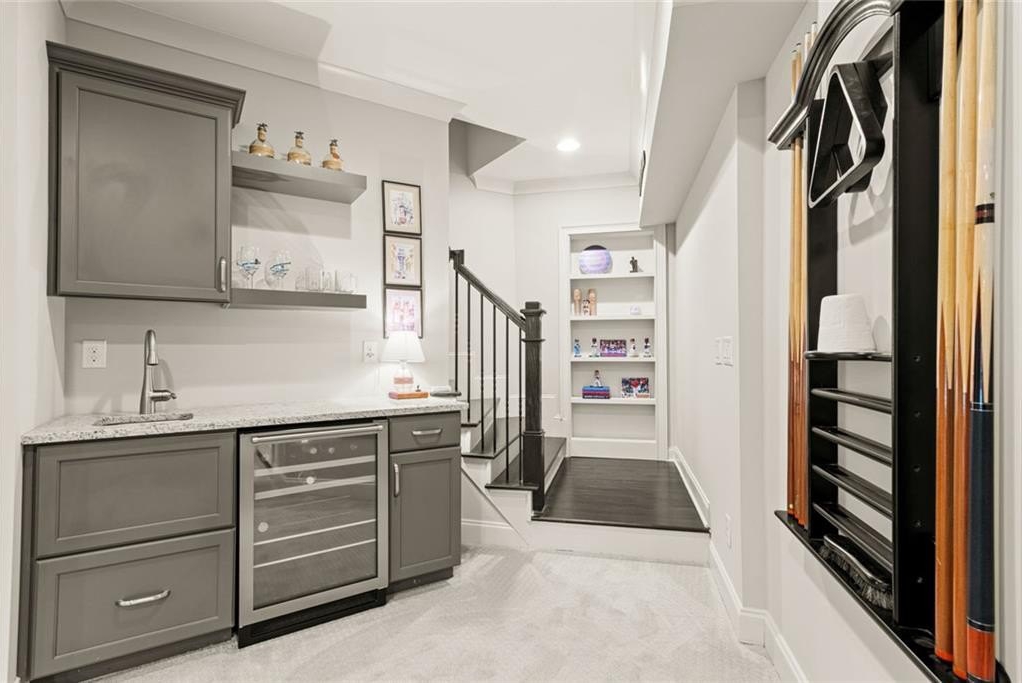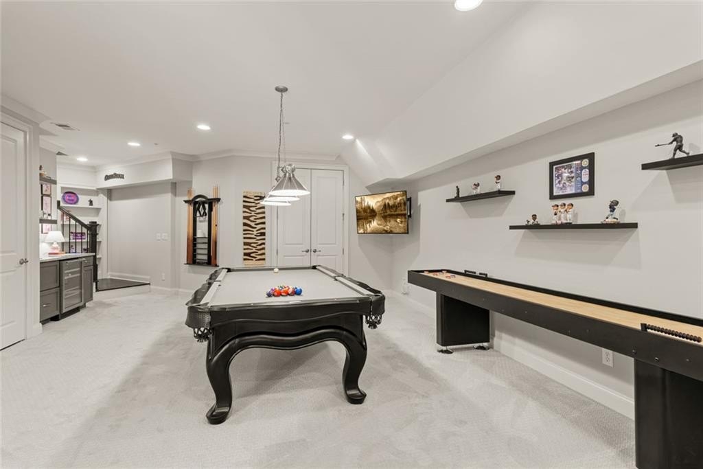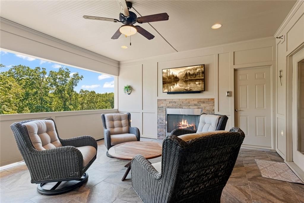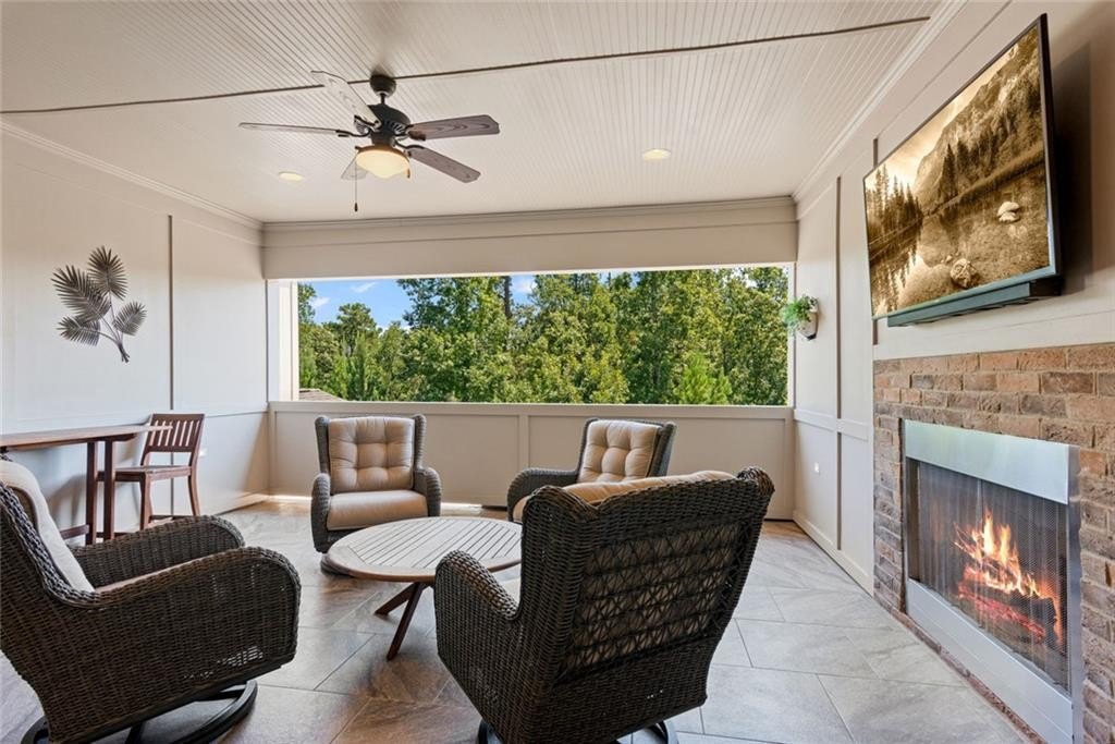 The top floor is designed for year-round enjoyment, with a covered patio featuring a stone fireplace and mounted TV, plus a game room with wet bar and private guest suite. On the terrace level, enjoy a game room, hidden storage behind a custom bookcase, flexible space and an additional private patio open to a fenced green space perfect for play space or furry friends.