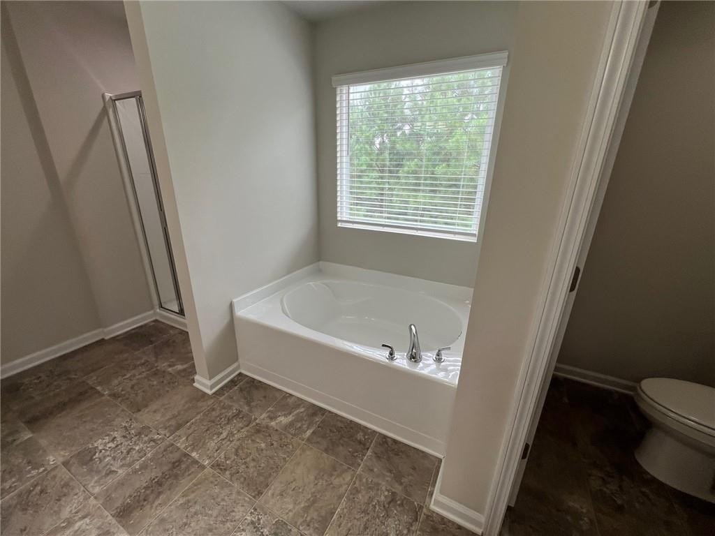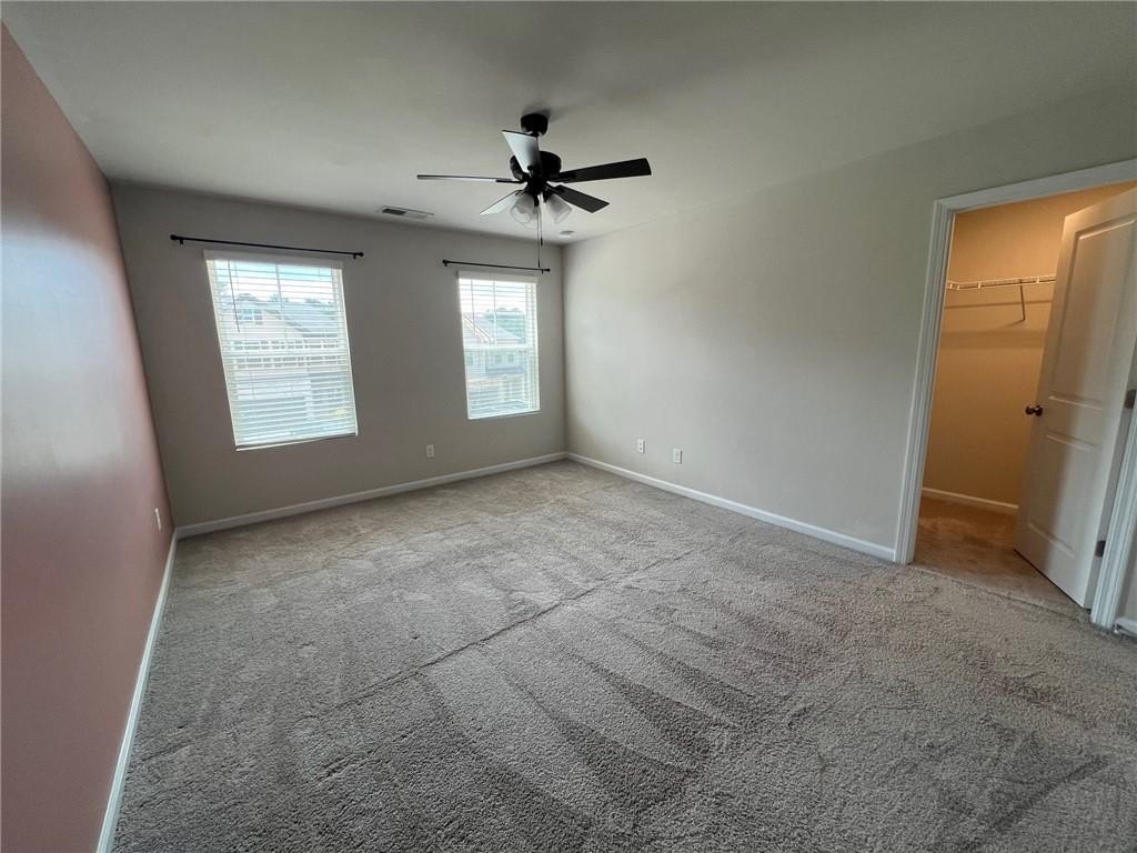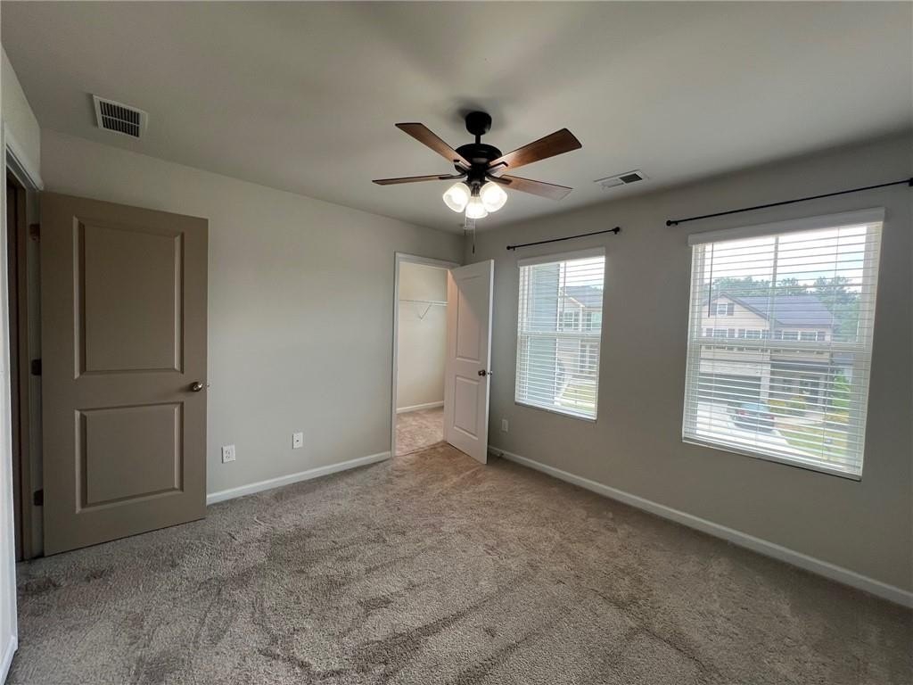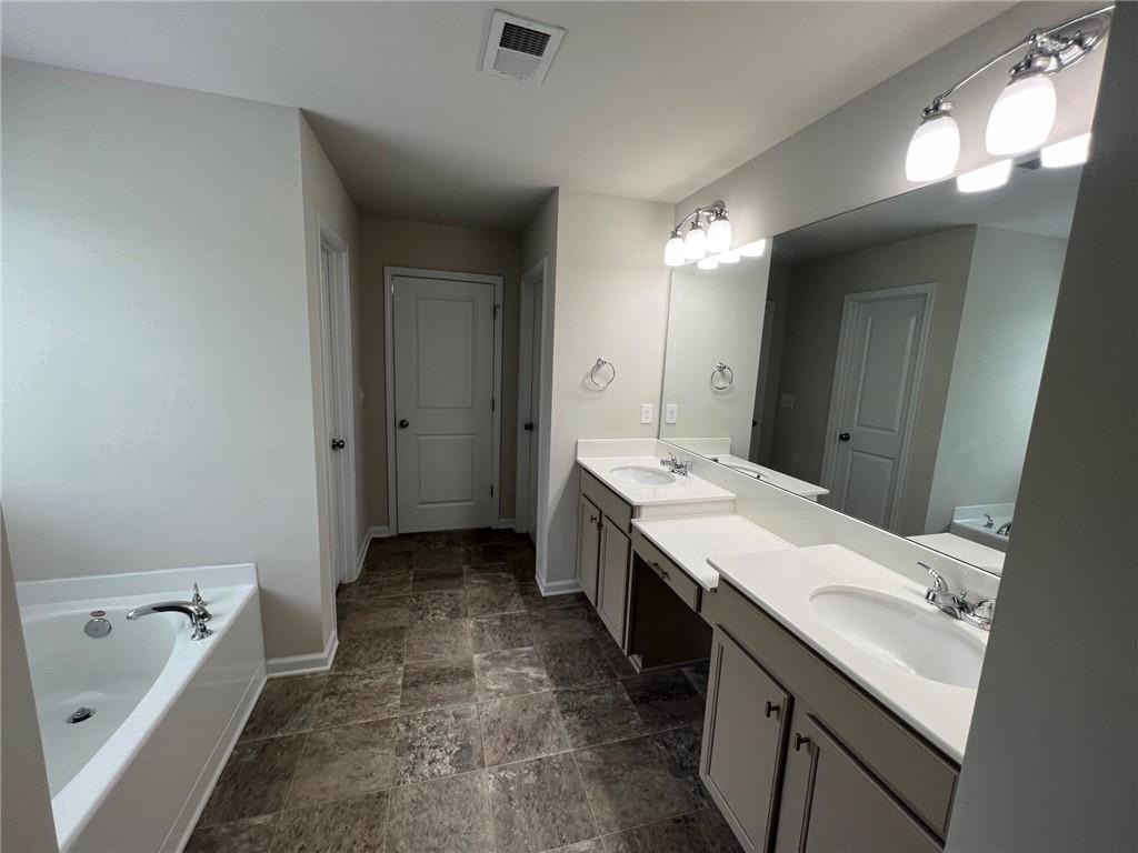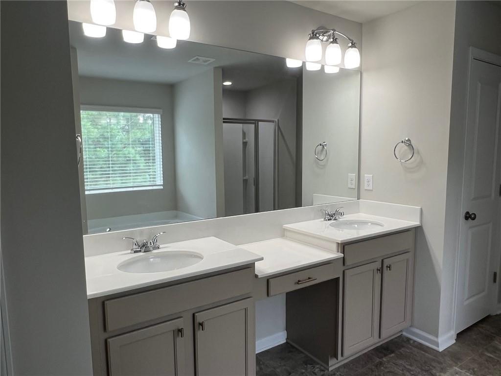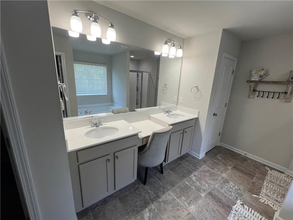 Upstairs, the primary bedroom comfortably fits a king-sized set and includes a private bath with dual vanities, a soaking tub, separate shower, walk-in closet, and linen storage. Two additional bedrooms offer walk-in closets and share a full bath with a tub/shower combo, extra storage vanity, and its own linen closet.