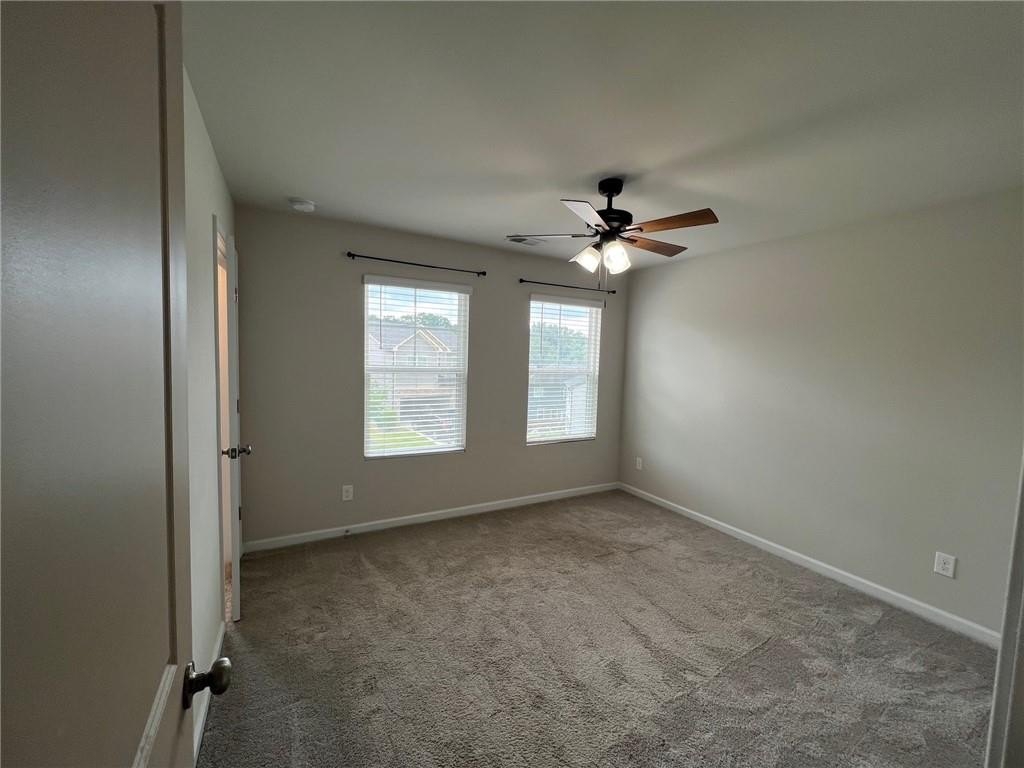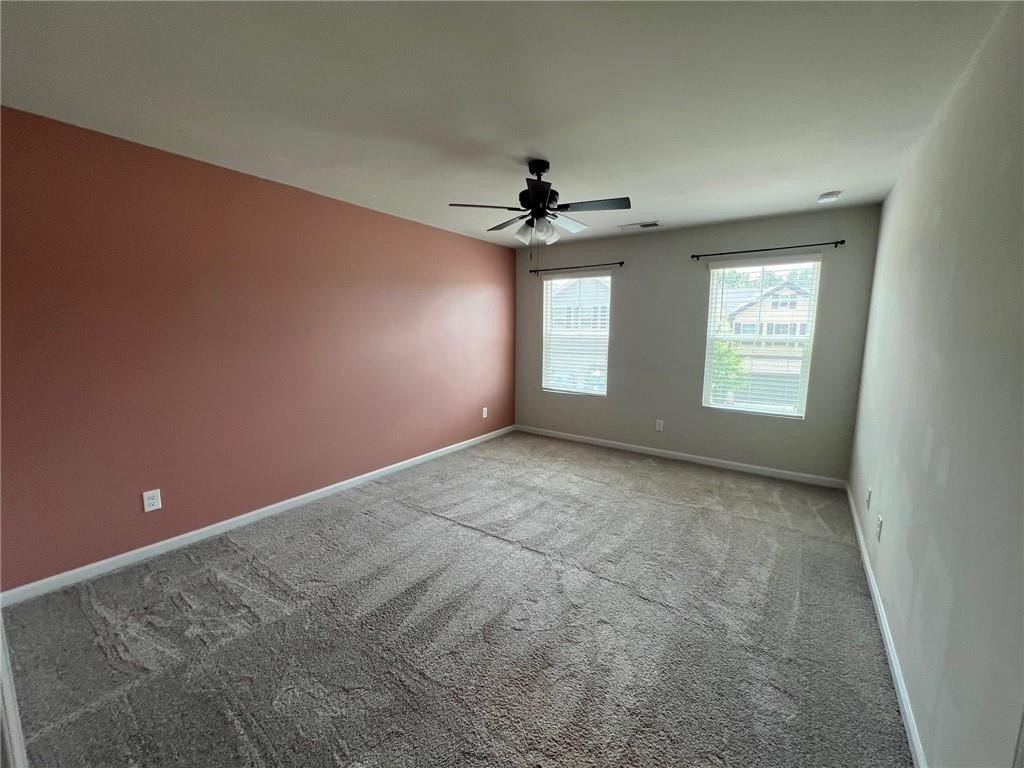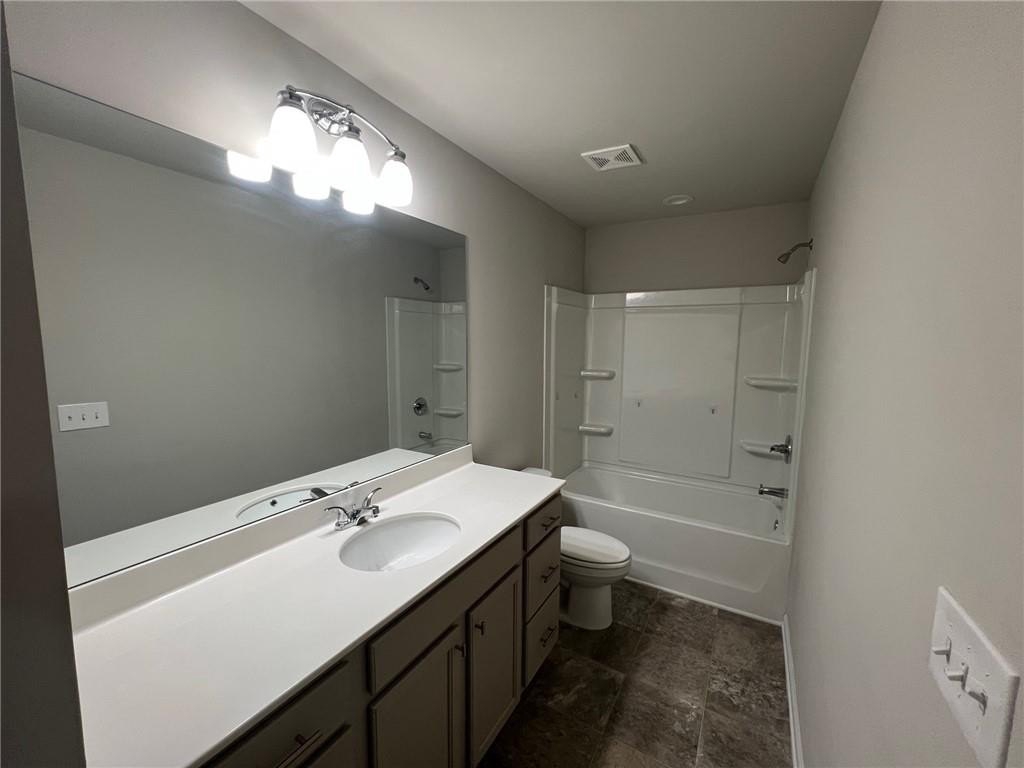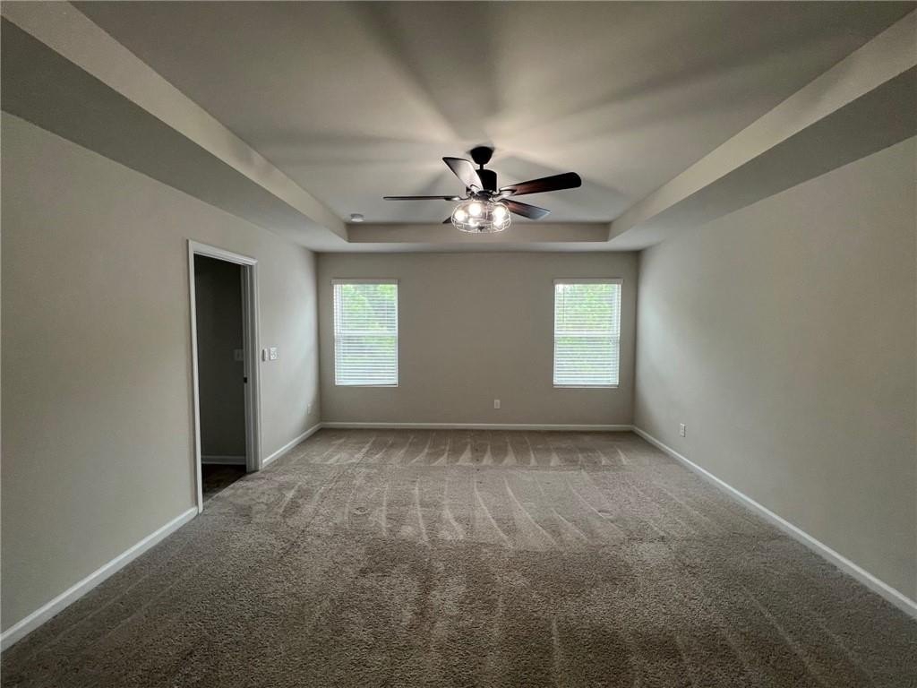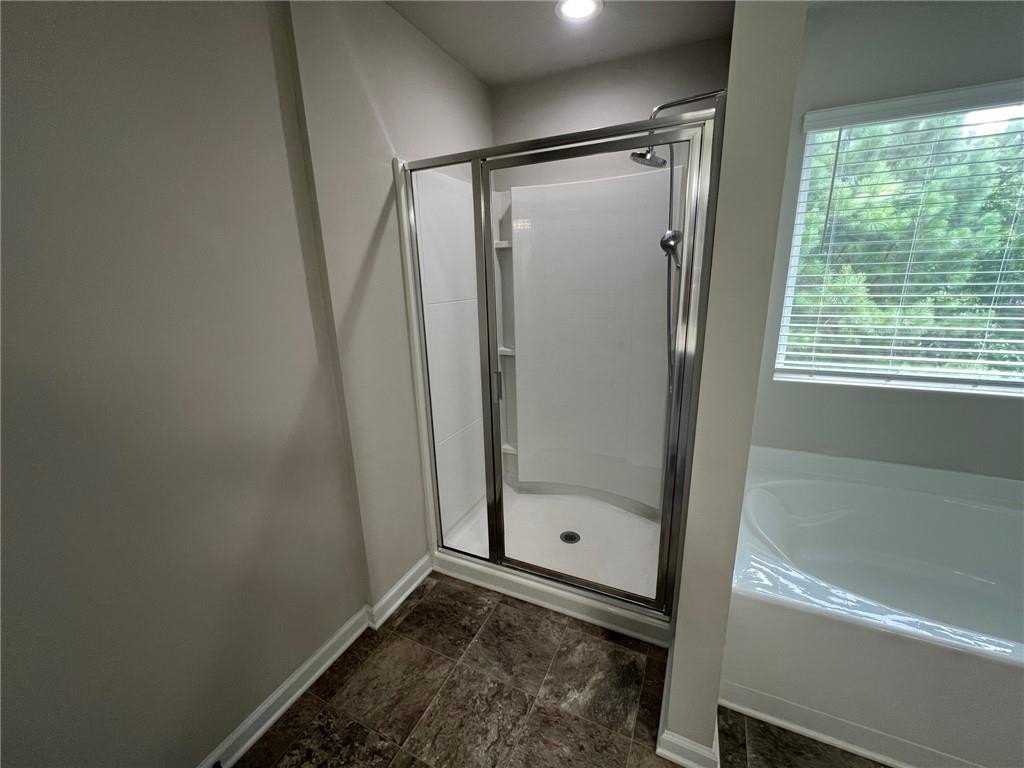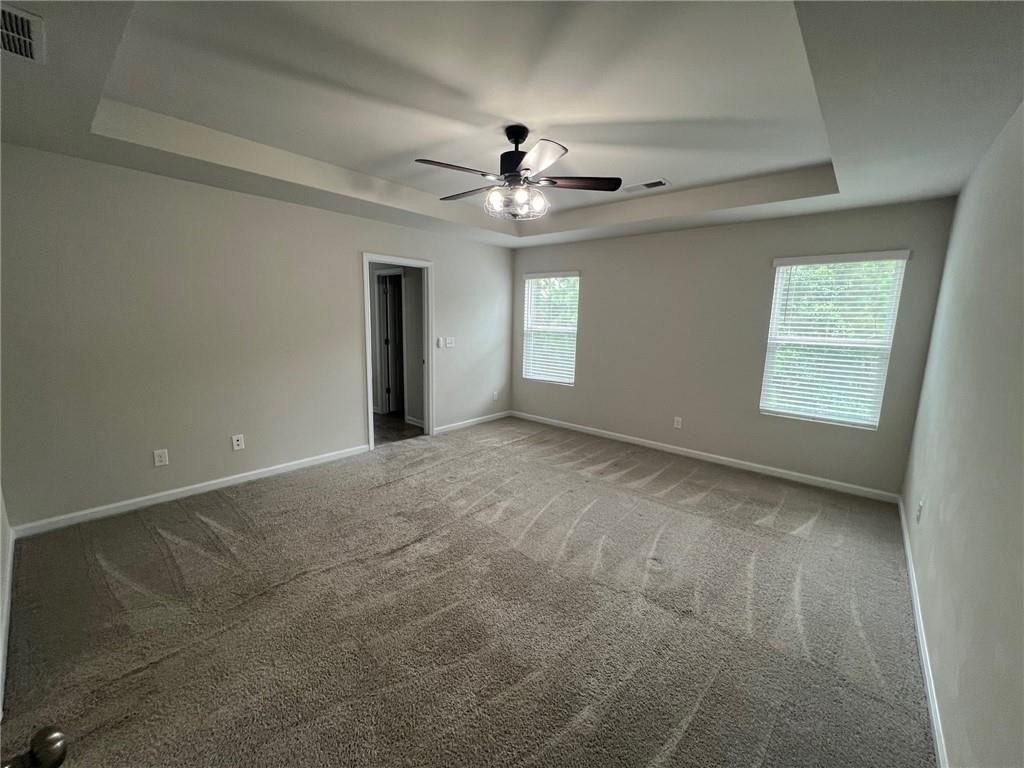 Upstairs, the primary bedroom comfortably fits a king-sized set and includes a private bath with dual vanities, a soaking tub, separate shower, walk-in closet, and linen storage. Two additional bedrooms offer walk-in closets and share a full bath with a tub/shower combo, extra storage vanity, and its own linen closet.